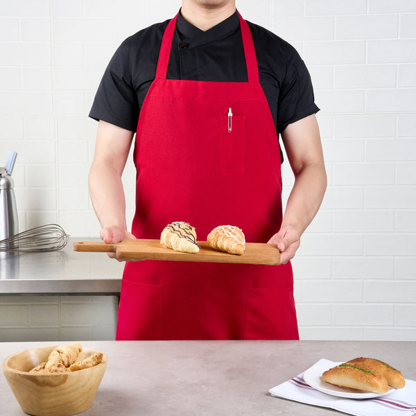 Enhance your foodservice operations with our Chef 101 Red Standard Bib Aprons. Equipped with three spacious patch pockets on the front, these bib aprons are perfect for holding all your service or kitchen supplies. Designed with a bib-inspired style, these aprons with pockets provide ample coverage and protection, ensuring your clothes stay clean. Featuring a mid-length design, these work aprons offer excellent mobility, allowing you to move freely and comfortably while protecting your clothes. Crafted from polyester, these waitress aprons are wrinkle-resistant and withstand daily wear and tear, maintaining a professional appearance even after frequent washes. The back ties on these waiter aprons offer a customizable fit, ensuring the aprons stay securely in place while allowing for easy adjustments. Machine washable for easy maintenance, these server aprons are designed to withstand frequent laundering while retaining their color and shape. The vibrant red color of these polyester aprons delivers a fresh, fun presentation, perfect for both front and back-of-house use. Measuring 32.48 inches in length by 27.56 inches in width, these red aprons fit a variety of body types and sizes. Sold in a 100 count box.