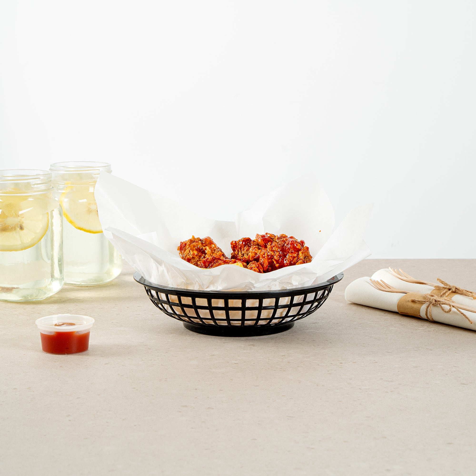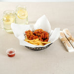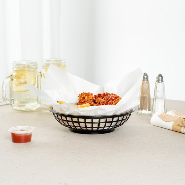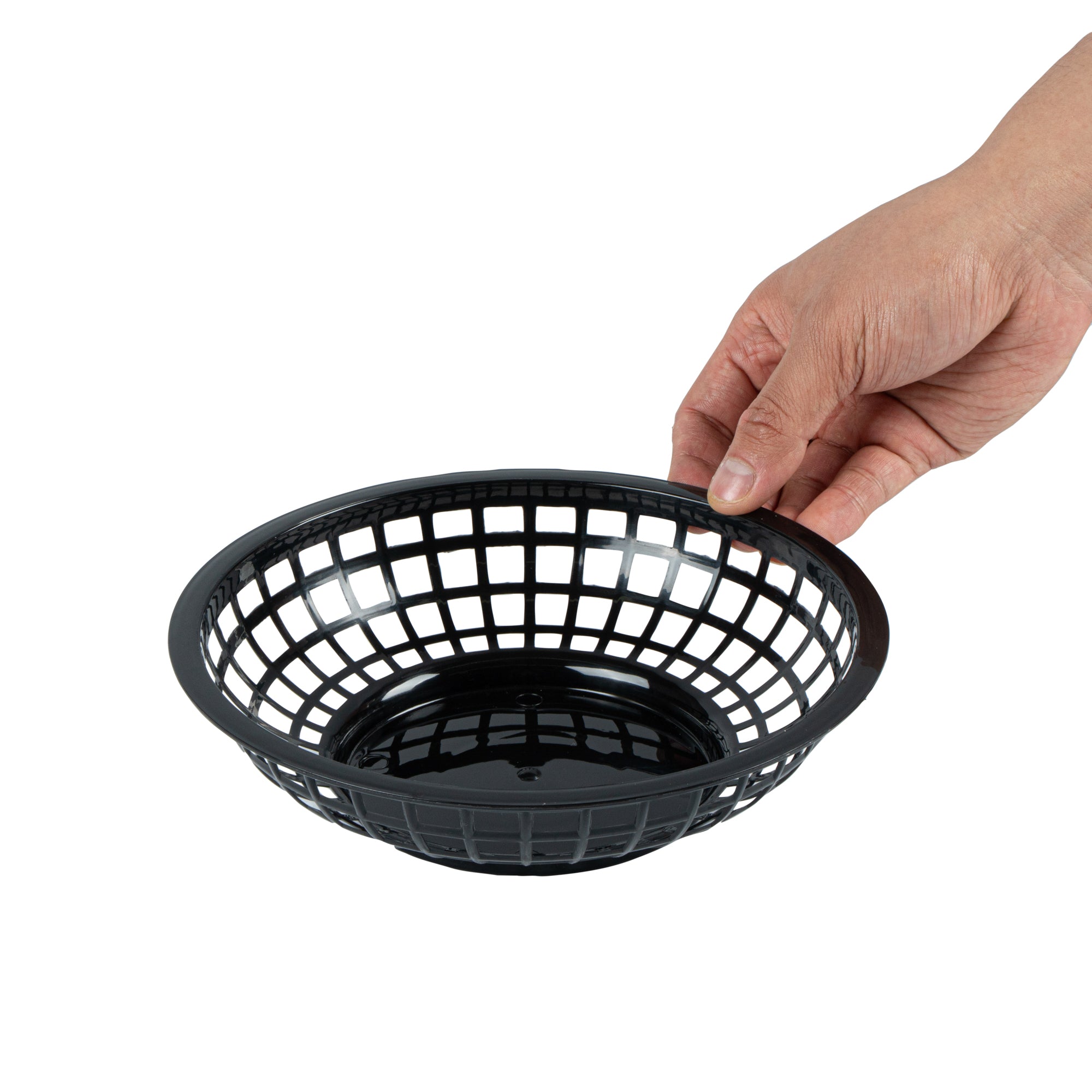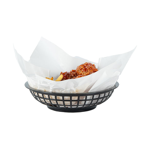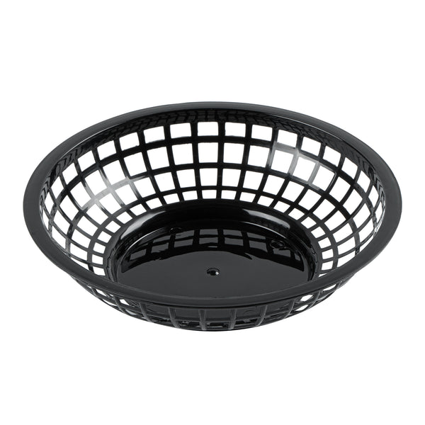 Introducing our Chef 101 Round Black Plastic Fast Food Serving Baskets, the seamless blend of durability and style for any casual dining experience. Lightweight and easy to transport, these snack trays are suitable for serving up fried foods, wings, sandwiches, or appetizers with ease. Suitable for reheating in the microwave, these food baskets allow for quick reheating, ensuring your guests always enjoy piping hot meals. Effortless cleanup is ensured with these easy-to-clean baskets, saving valuable time in busy kitchens. Thanks to a stackable design, these fry baskets provide efficient space-saving storage and easy portability, which is essential for any fast-paced foodservice setting. Pair these serving baskets with deli papers (SKU: RWA1261, RWA1259, RWA1256) to elevate the look and effectively catch crumbs or grease. Measuring 7.87 inches in diameter by 1.97 inches in height, these baskets offer ample space for a generous serving. Sold in a 10 count box.