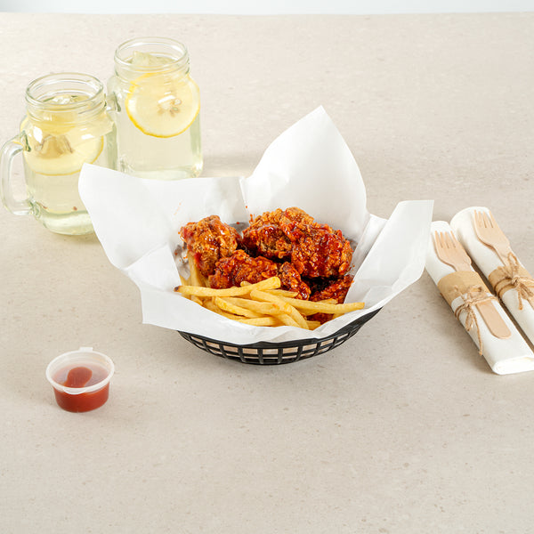 Introducing our Chef 101 Round Black Plastic Fast Food Serving Baskets, the seamless blend of durability and style for any casual dining experience. Lightweight and easy to transport, these snack trays are suitable for serving up fried foods, wings, sandwiches, or appetizers with ease. Suitable for reheating in the microwave, these food baskets allow for quick reheating, ensuring your guests always enjoy piping hot meals. Effortless cleanup is ensured with these easy-to-clean baskets, saving valuable time in busy kitchens. Thanks to a stackable design, these fry baskets provide efficient space-saving storage and easy portability, which is essential for any fast-paced foodservice setting. Pair these serving baskets with deli papers (SKU: RWA1261, RWA1259, RWA1256) to elevate the look and effectively catch crumbs or grease. Measuring 7.87 inches in diameter by 1.97 inches in height, these baskets offer ample space for a generous serving. Sold in a 100 count box.