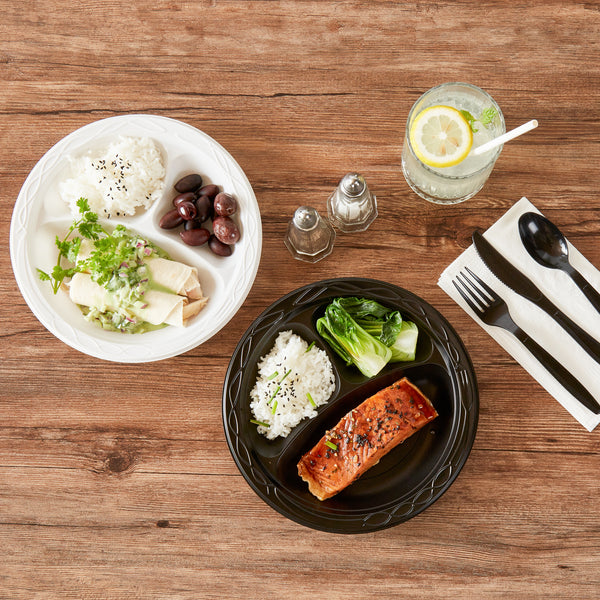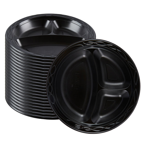 Serve up yummy dishes with our Chef 101 Round Black Plastic Plates. Designed with three compartments, these party plates make it easy to serve a balanced meal, with separate sections for mains, sides, and desserts. These plastic plates are microwave-safe and allow you to easily reheat your meals, ensuring convenience for busy kitchens. Made from premium plastic, these serving plates are suitable for serving both hot and cold food items, catering to a variety of dishes. The sleek black finish of these disposable plates accentuates your food presentation, making them visually appealing and perfect for upscale events. These dinner plates are disposable and provide an easy cleanup, saving time and effort for your staff. Plus, these food plates are recyclable, offering an eco-friendly way to serve meals and reduce environmental impact. Measuring 9 inches in diameter, these black plates provide ample space for generous portions. Sold in a 100 count box.