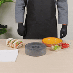 Ensure every tortilla stays perfectly warm and ready to serve. The Chef 101 Insulated Gray Tortilla Warmer features an insulated design that locks in heat, keeping your tortillas fresh and delicious for longer periods. This microwave tortilla warmer, crafted from premium plastic, is ideal for quick reheating of leftovers, saving you valuable time in a bustling kitchen. With a convenient built-in handle on the lid, this tortilla keeper allows for easy and secure access to your tortillas, enhancing operational efficiency. Measuring 8.5 inches by 8.5 inches and 2.3 inches in height, it fits seamlessly into any foodservice setting. This gray tortilla warmer is cold food friendly, dishwasher safe, freezer safe, and greaseproof, making it a versatile addition to any restaurant or catering operation. Elevate your foodservice offerings and maintain tortilla freshness with this essential kitchen tool. Each order includes 1 ProServe Insulated Gray Tortilla Warmer.