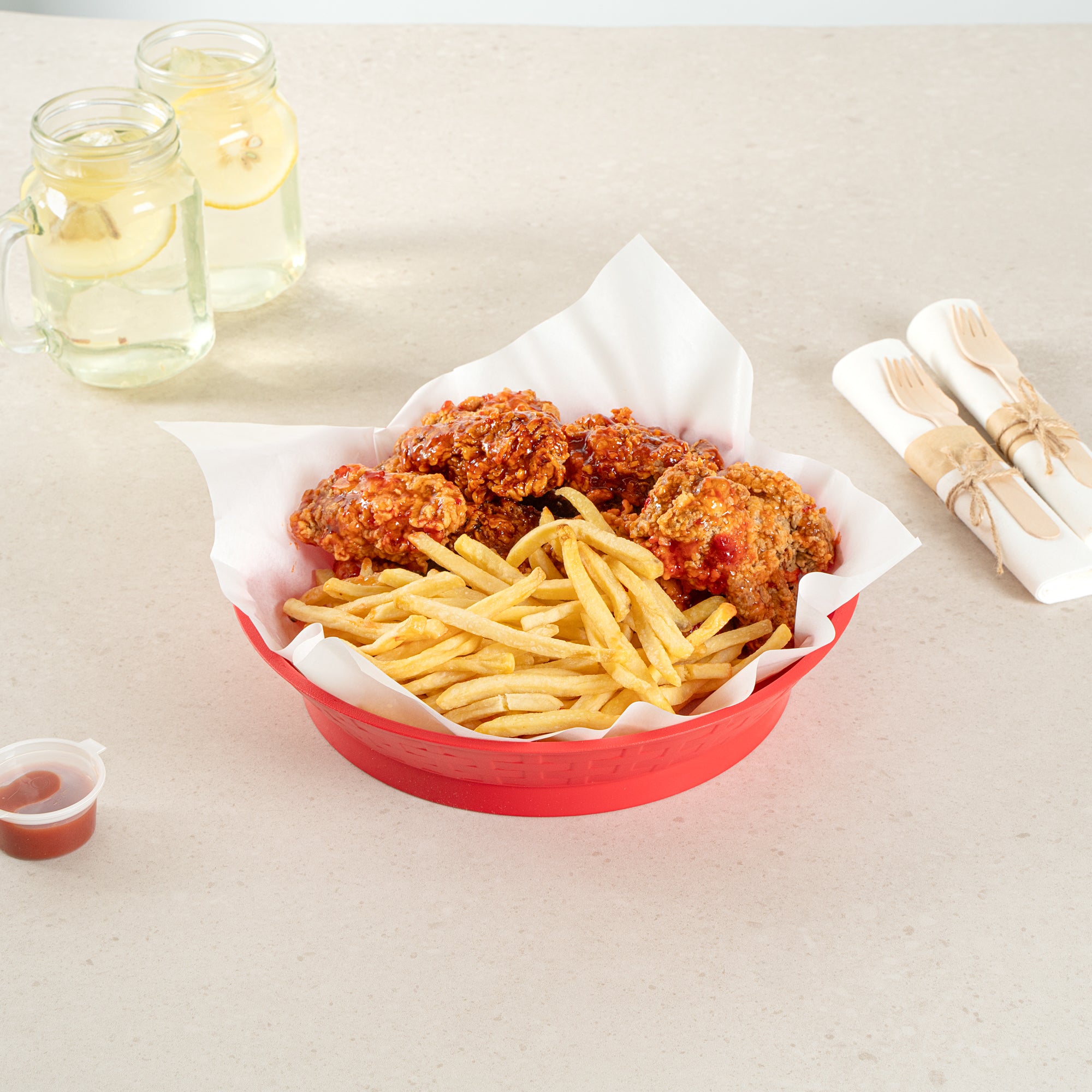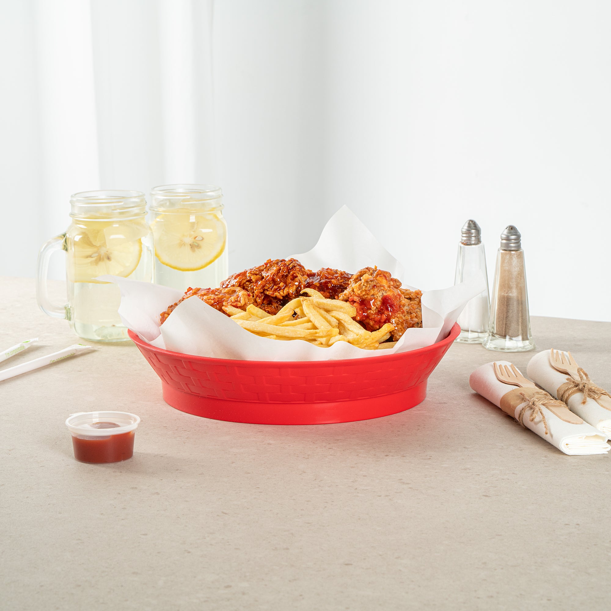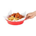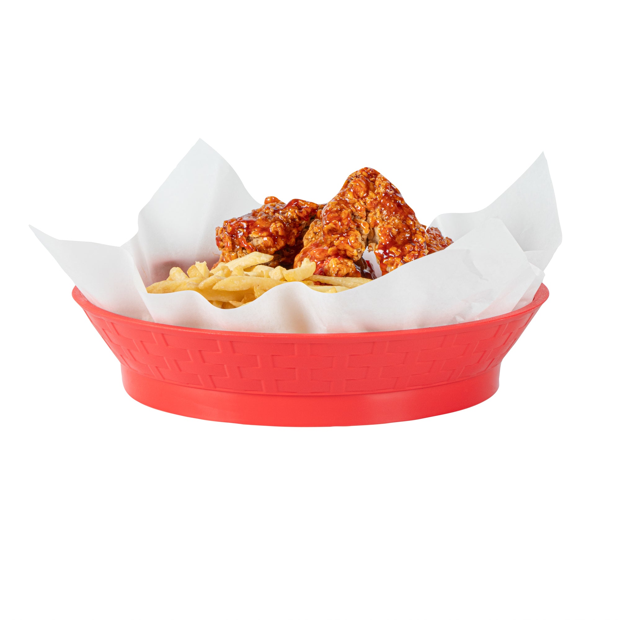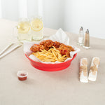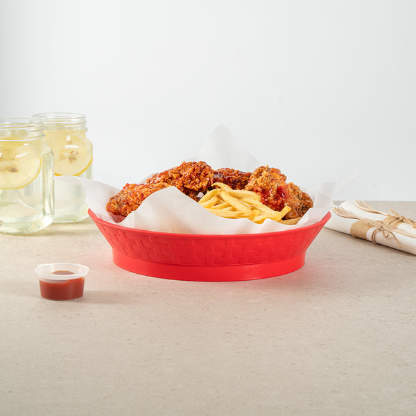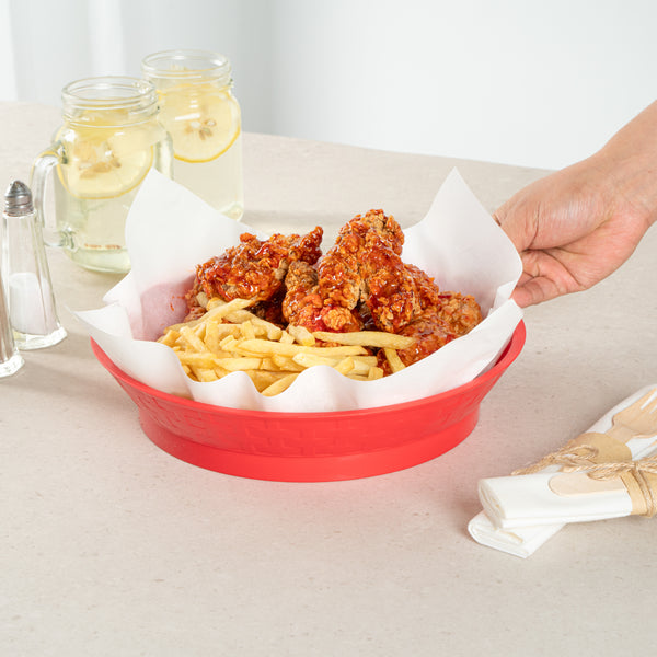 Effortlessly elevate your food presentations with our Chef 101 Round Red Plastic Diner Platters. Made from durable plastic, these lightweight serving trays are suitable for fried foods, wings, sandwiches, or appetizers. The base of this food platter elevates dishes above the table, adding visual appeal to any meal. With built-in drain holes, these reusable platters ensure post-wash drying is efficient. Designed to withstand microwave reheating, these diner platters allow for quick reheating of meals. Stackable design of these serving trays offers space-saving storage and easy portability for foodservice providers. Featuring a bold red color, these plastic platters enhance food presentation, while the lattice sides add a classic and timeless look. Measuring 10.47 inches in diameter by 2.17 inches in height, these serving trays are perfectly sized for a variety of dishes. Sold in a 100 count box.