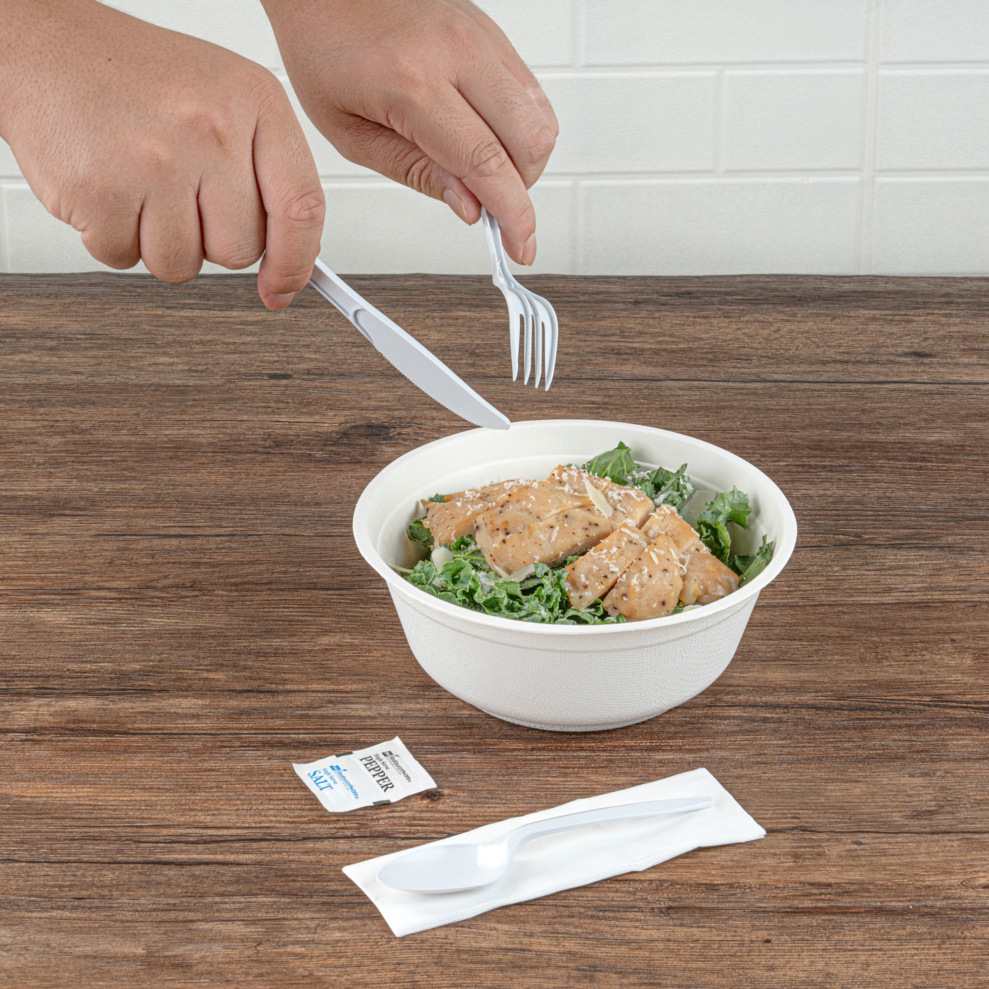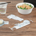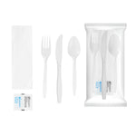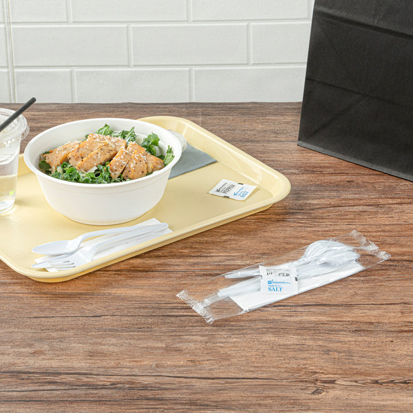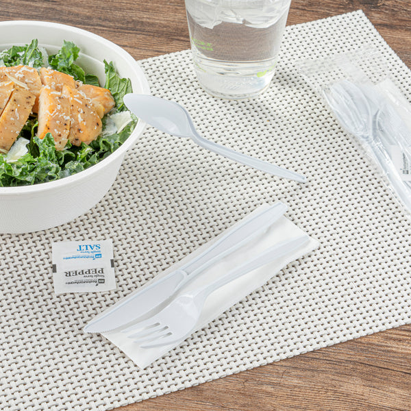 Ensure sanitary dining with individually wrapped cutlery sets. The Chef 101 Individually Wrapped Medium-Weight Polypropylene Cutlery Set provides a complete dining solution with a plastic fork, knife, spoon set, and a 1-ply 12-inch by 13-inch napkin, along with salt and pepper packets, making it ideal for take-out services. Individually wrapped in a paper bag, this set ensures cleanliness, promoting customer health and safety while maintaining the appeal of a wrapped plastic cutlery set. Crafted from medium-weight polypropylene, this disposable utensil set with condiments is perfect for light fare at catering events, balancing durability and cost-effectiveness. The classic white color complements various dining settings, whether for casual eateries or formal venues. Each order includes 250 Chef 101 Individually Wrapped Medium-Weight Polypropylene Cutlery Sets.