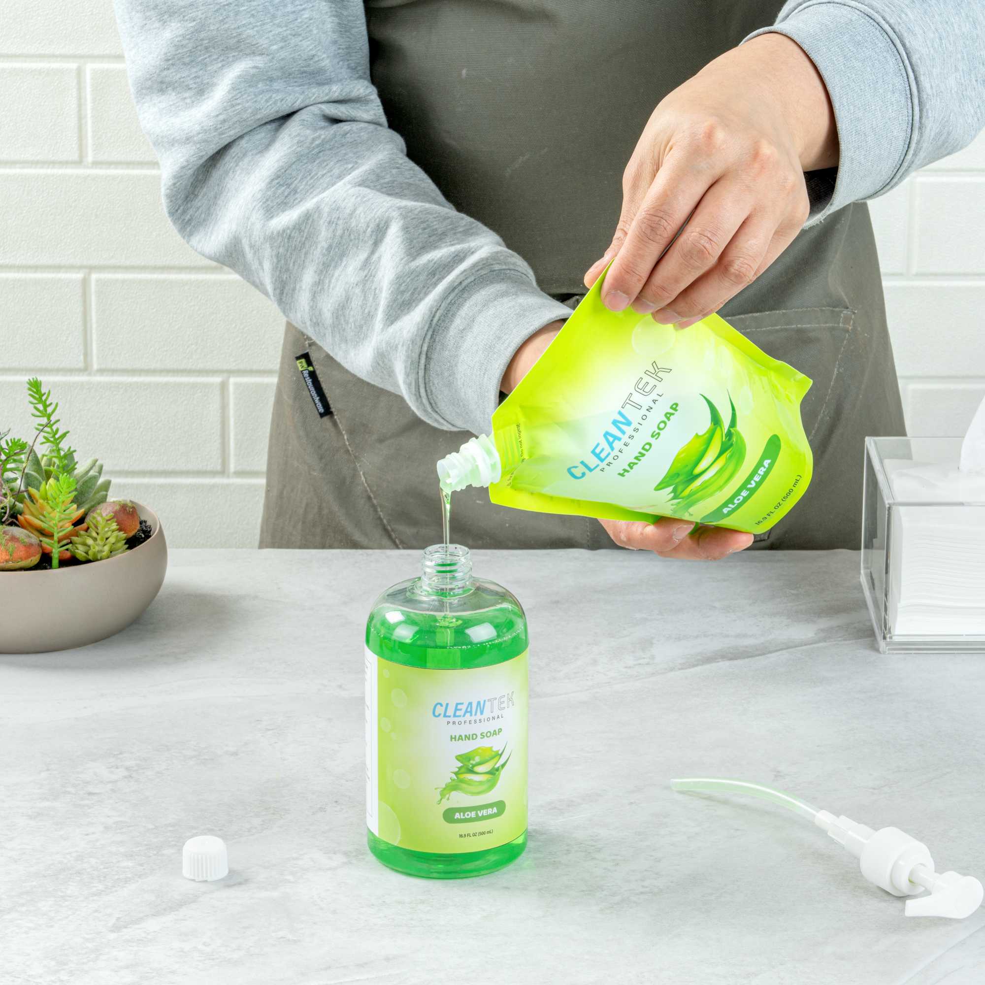 Ensure optimal hygiene with our liquid hand soap refill. The Clean Tek Professional Large Liquid Hand Soap Refill safeguards against germs and bacteria, making it ideal for maintaining strict cleanliness standards in foodservice settings. Its soothing aloe scent enhances the handwashing experience for guests and staff, promoting a pleasant atmosphere in restrooms or kitchens. With a substantial 16.9 fl. oz capacity, this hand soap refill reduces the need for frequent restocking, allowing busy kitchens to operate smoothly without disruption. Measuring 3 inches in length, 3 inches in width, and 6.7 inches in height, this compact soap refill for dispensers fits efficiently in small storage spaces. Crafted from high-quality chemical products, it ensures long-lasting use and effective germ protection. Upgrade your hygiene routine with our reliable soap solution. Each order includes 1 Clean Tek Professional Large Liquid Hand Soap Refill.