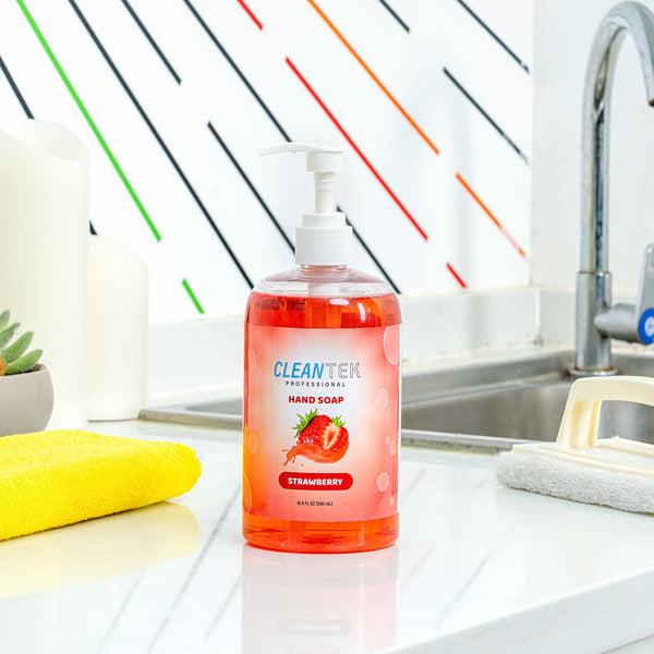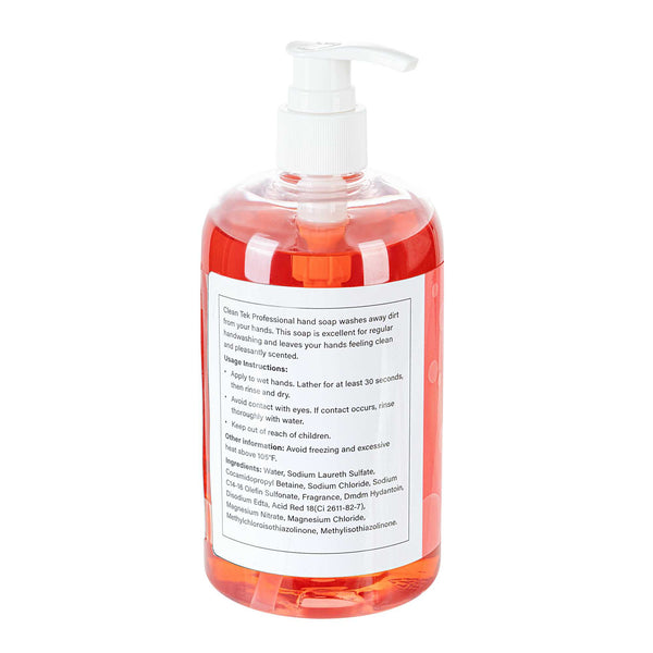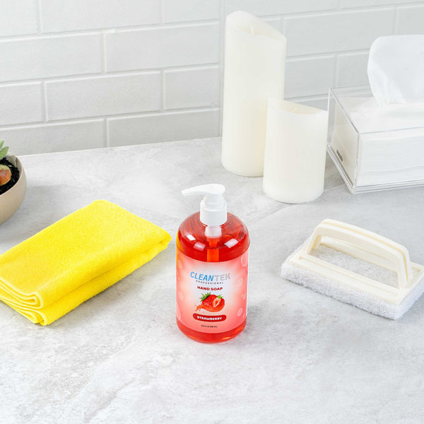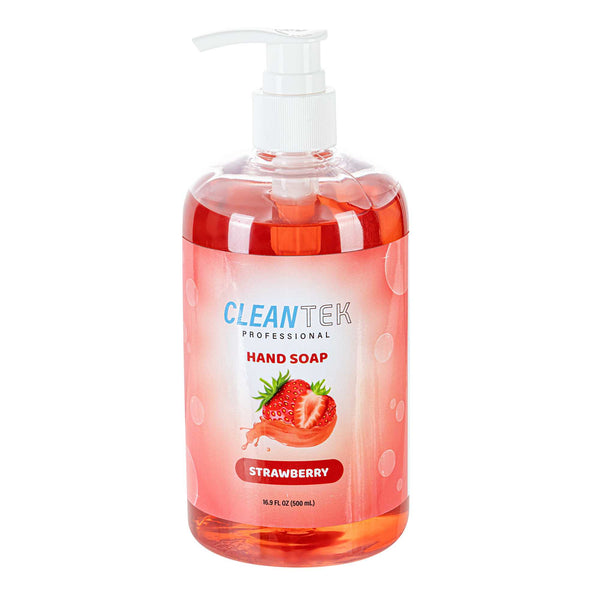 Ensure optimal hygiene with easy-to-use soap. The Clean Tek Professional Liquid Hand Soap provides a refreshing strawberry scent that enhances the guest experience while its gentle formulation remains tough on dirt, promoting food safety. This hand soap pump, with a convenient 16.9-fluid-ounce capacity, is perfectly suited for high-traffic areas, minimizing the need for frequent refills and ensuring staff hygiene compliance. Its attractive, pink packaging contributes positively to restroom aesthetics, leaving a memorable impression on patrons. Crafted from chemical products, this soap is designed to be gentle on the skin, making it comfortable for frequent use without irritation. At 3 inches in length and 6.7 inches in height, the compact design fits seamlessly into any handwashing station. Elevate your establishment's hygiene standards with this reliable liquid hand soap. Each order includes 24 Clean Tek Professional Antibacterial Liquid Hand Soap.