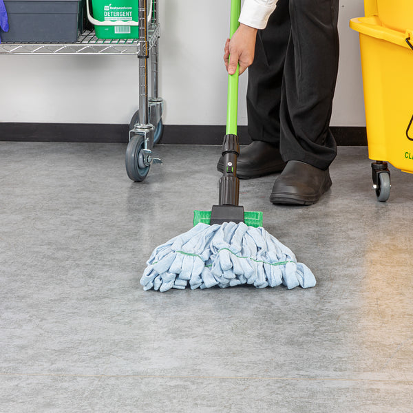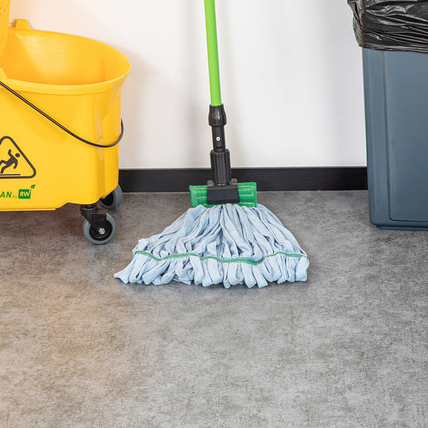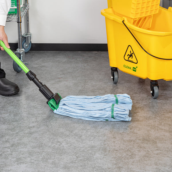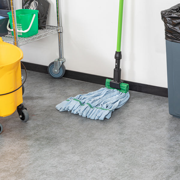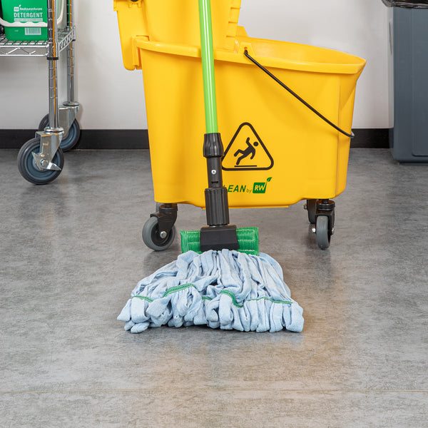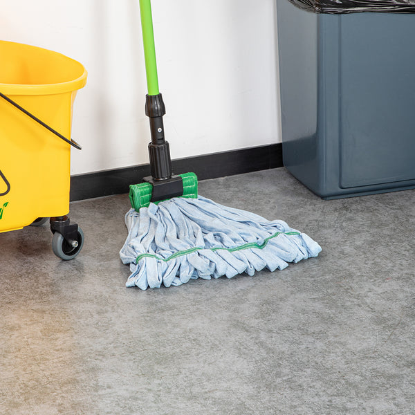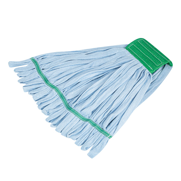 Achieve pristine floors with our Clean Tek Professional 18-ounce Blue Microfiber Heavy Duty Wet Mop Head. The 5-inch wide headband offers enhanced stability and a secure fit for reliable, efficient cleaning. Made with looped ends, this commercial mop head increases durability and prevents fraying, ensuring a longer lifespan and more effective cleaning. Pair this washable mop head with its compatible handle (SKU: RWT1791G) for optimal cleaning performance. Crafted from premium microfiber, this wet mop head boasts superior dirt pick up and absorbency, making it perfect for efficient cleaning in busy kitchens and dining areas. The mildew-resistant microfiber of this blue floor mop lints less and is ideal for maintaining a clean environment. This mop head is machine washable, allowing for easy cleaning and repeated use, which ensures long-lasting performance. Designed to make your floors dry faster without streaking, this microfiber mop head keeps your establishment spotless. Measuring 20.87 inches in length by 5.98 inches in width by 1.97 inches in height, this mop head replacement has a capacity of 18 ounces. Sold in a 1 count box. Handle is available and sold separately.