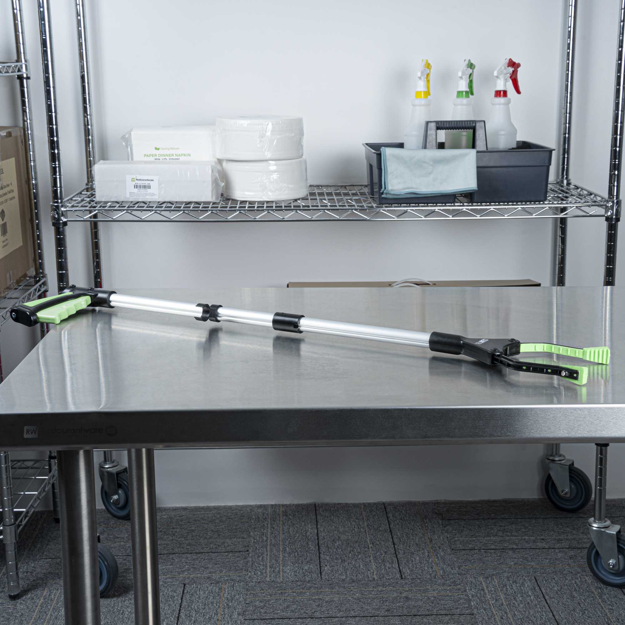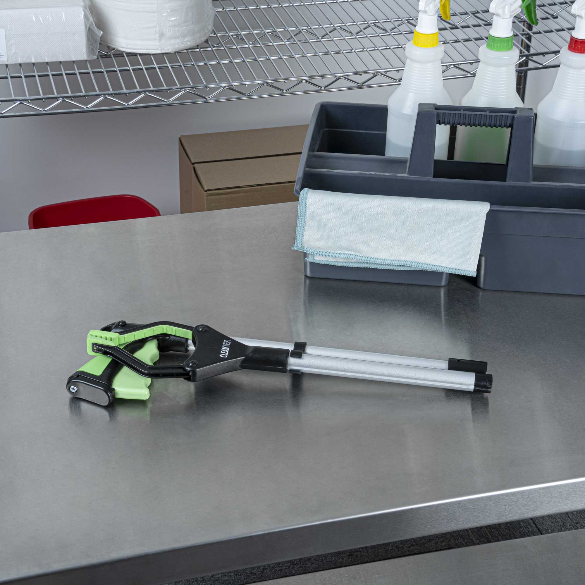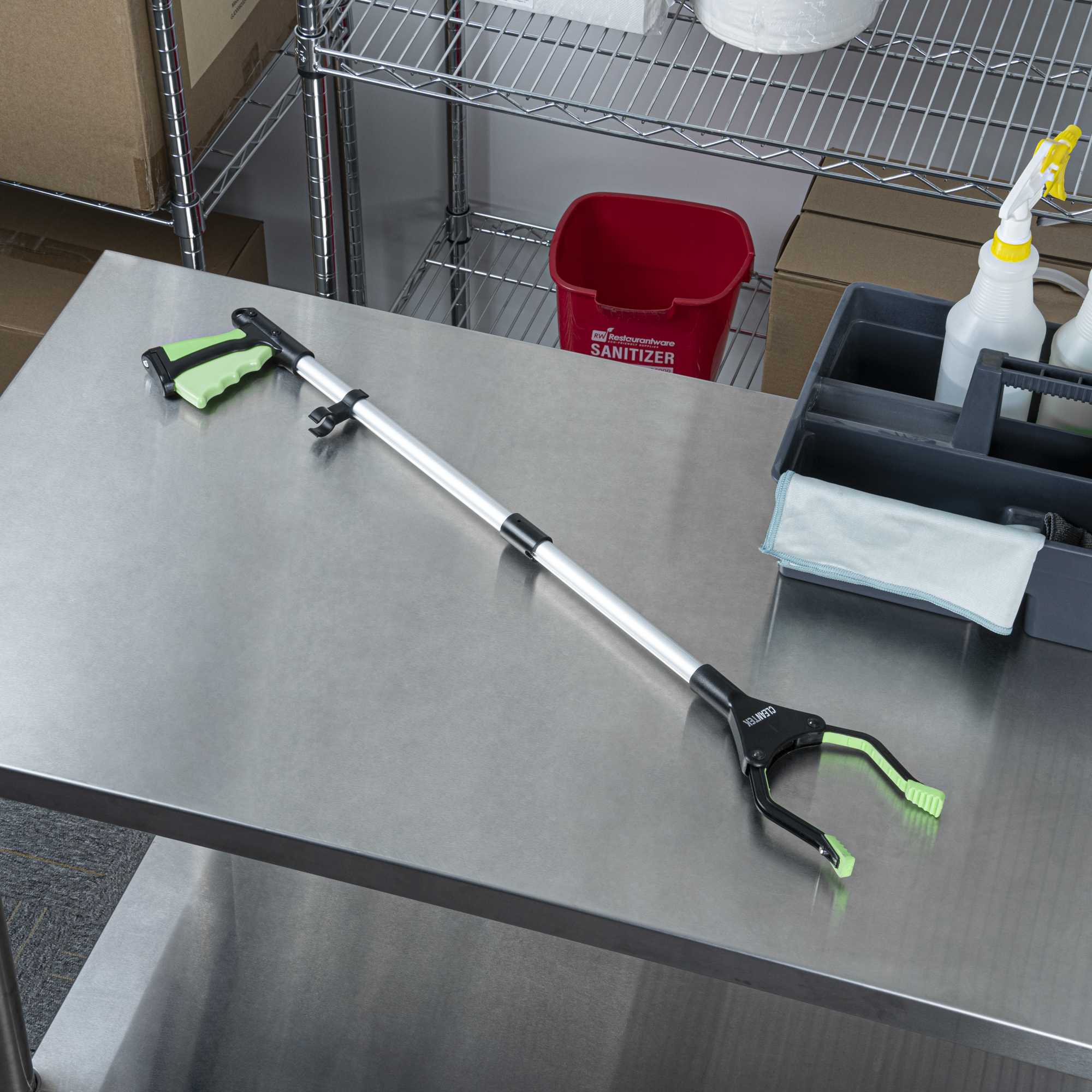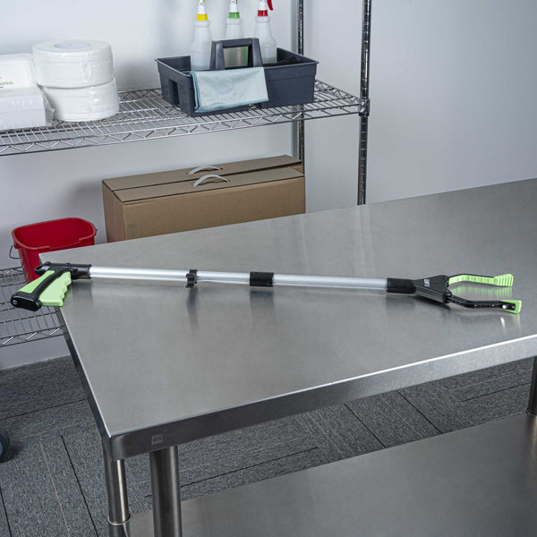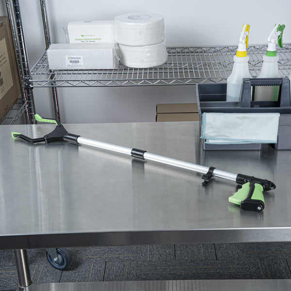 Keep areas spotless using our Clean Tek Professional 2-Fold Pick-Up Reaching Grabber Tool. This foldable trash grabber features a 360° rotating jaw for precise trash retrieval from tight or hard-to-reach spaces. Designed with a magnetic tip, this garbage grabber easily picks up light metal debris like utensils, eliminating the need for bending. The rubber-coated jaws on this plastic trash grabber provide a secure grip to hold narrow or small items with confidence. Each grabber features a 2-fold design allows for quick collapsing and fast deployment. Made from durable plastic and aluminum alloy, this folding litter picker is robust for repeated use. Ideal for restaurants, warehouses, commercial refrigerators, or foodservice pantries, this magnetic litter picker can securely hold up to 4.4 pounds of weight. Measuring 32.28 inches in length and 15.74 inches when folded, with a 4.9 inch clip opening, this trash claw is compact and convenient for storage. Sold in a 1 count box.