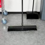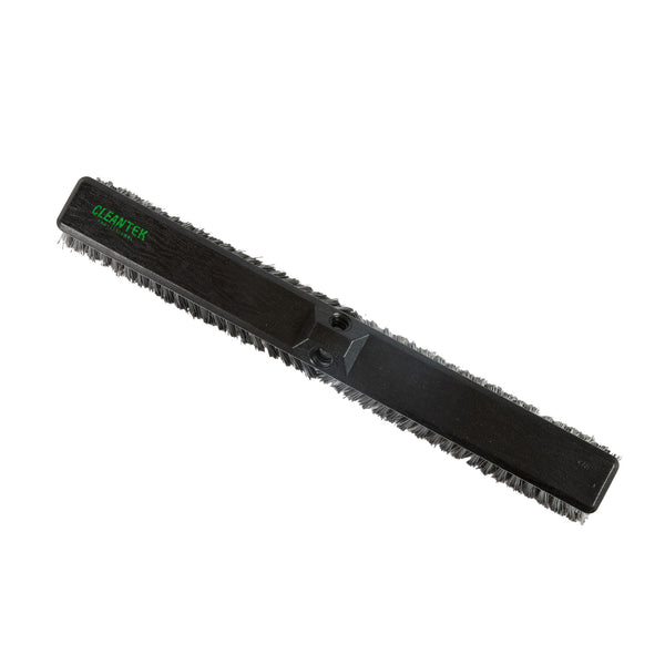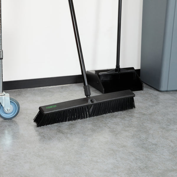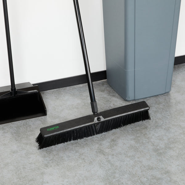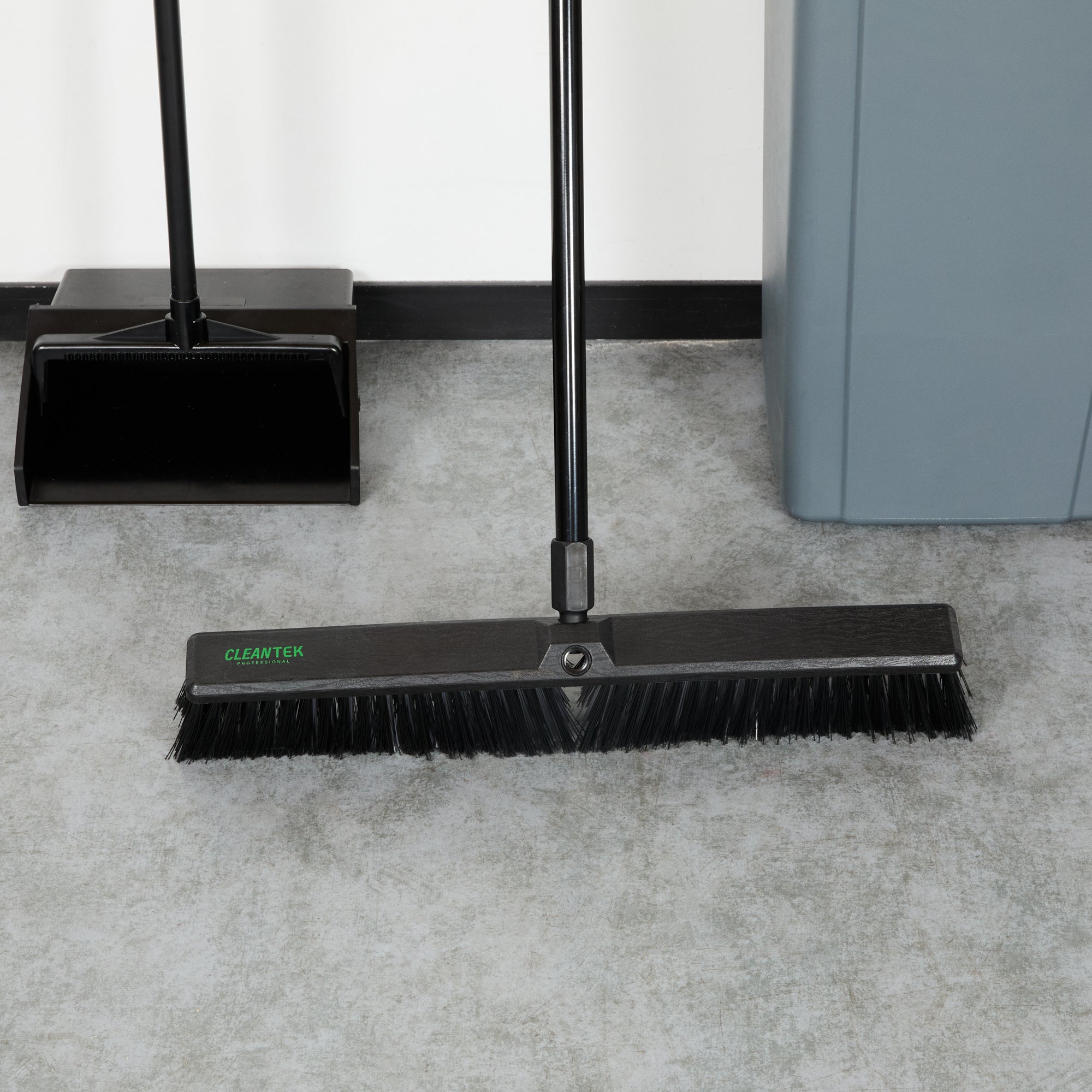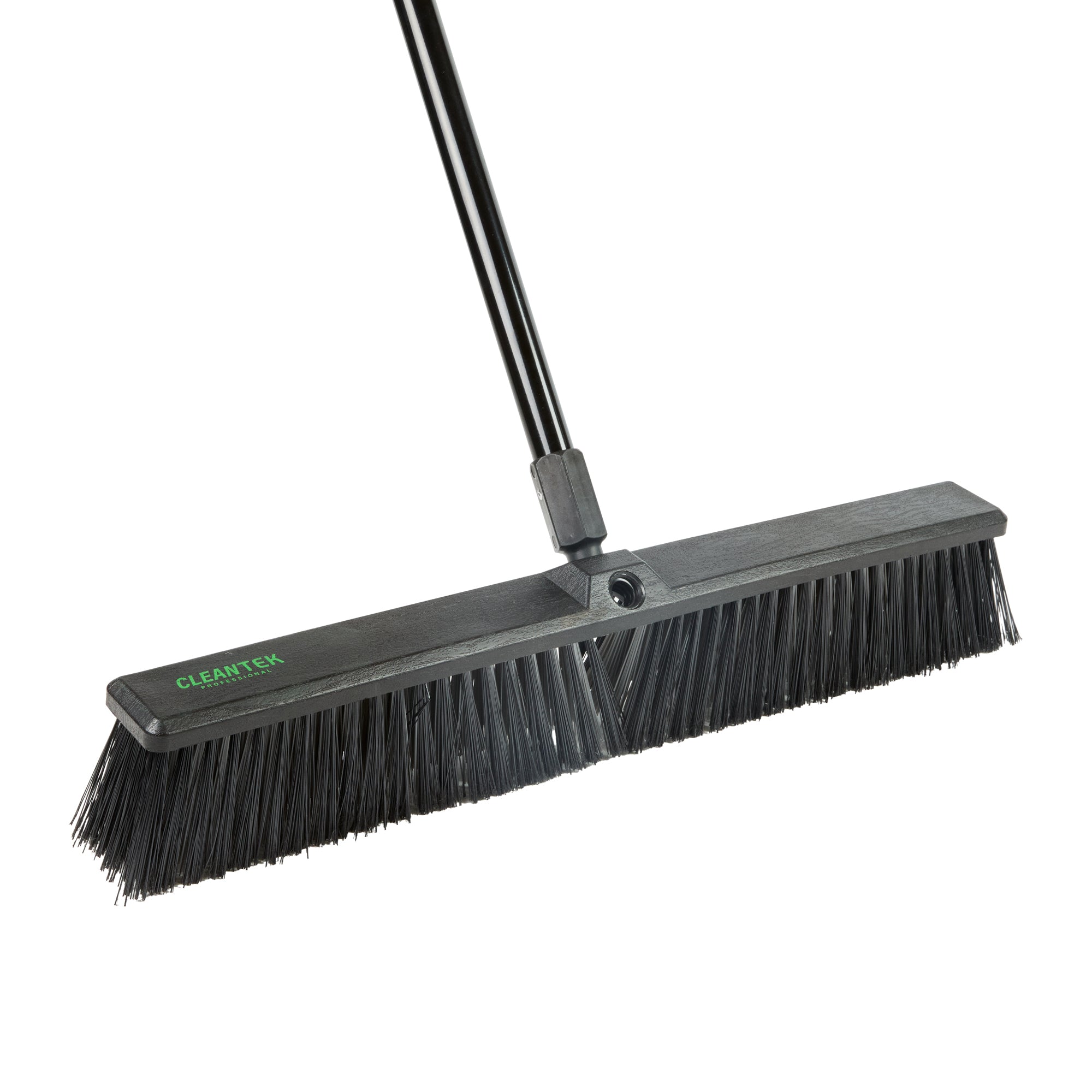 Maintain cleanliness with our Clean Tek Professional 23 1/2-inch Black Plastic Push Broom Head. Equipped with medium flagged bristles, this broom head captures dust and debris from various surfaces efficiently. Pair this wide broom head with compatible handle (SKU: RWT1877B) for an enhanced cleaning experience. This heavy-duty push broom head has durable bristles provide long-lasting service, maintaining its effectiveness even after extensive use. Featuring a sturdy plastic block with two handle attachments, this push broom head allows you to swap handle sides to prevent uneven wear. Measuring 23.62 inches in length by 2.36 inches in width by 3.35 inches in height, this dust broom head is designed for optimal coverage and ease of use. Sold in a 1 count box. Handle is available and sold separately.