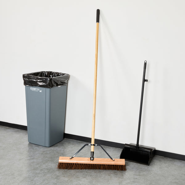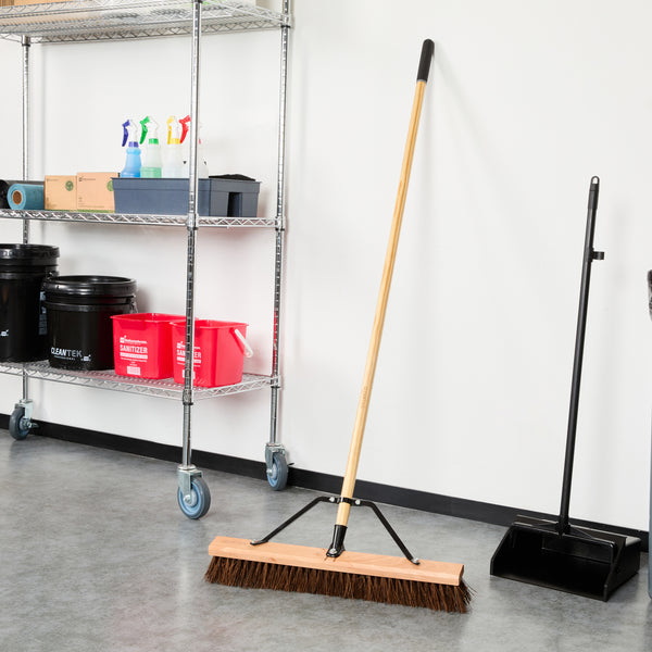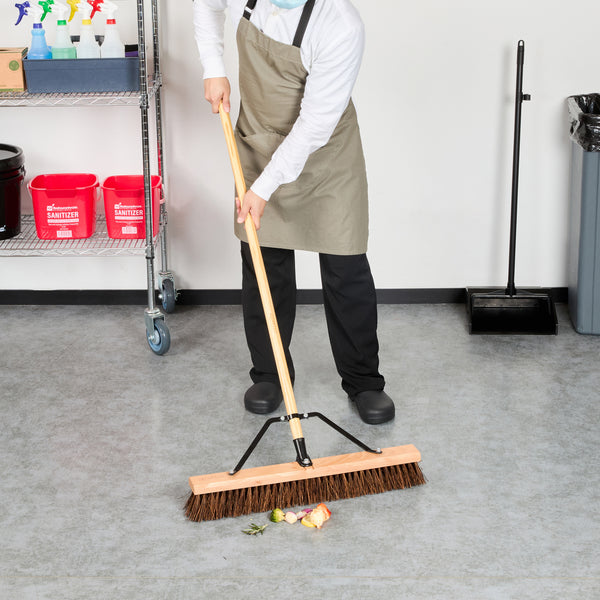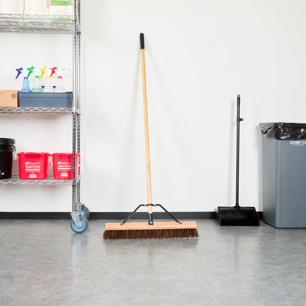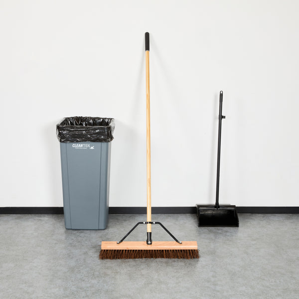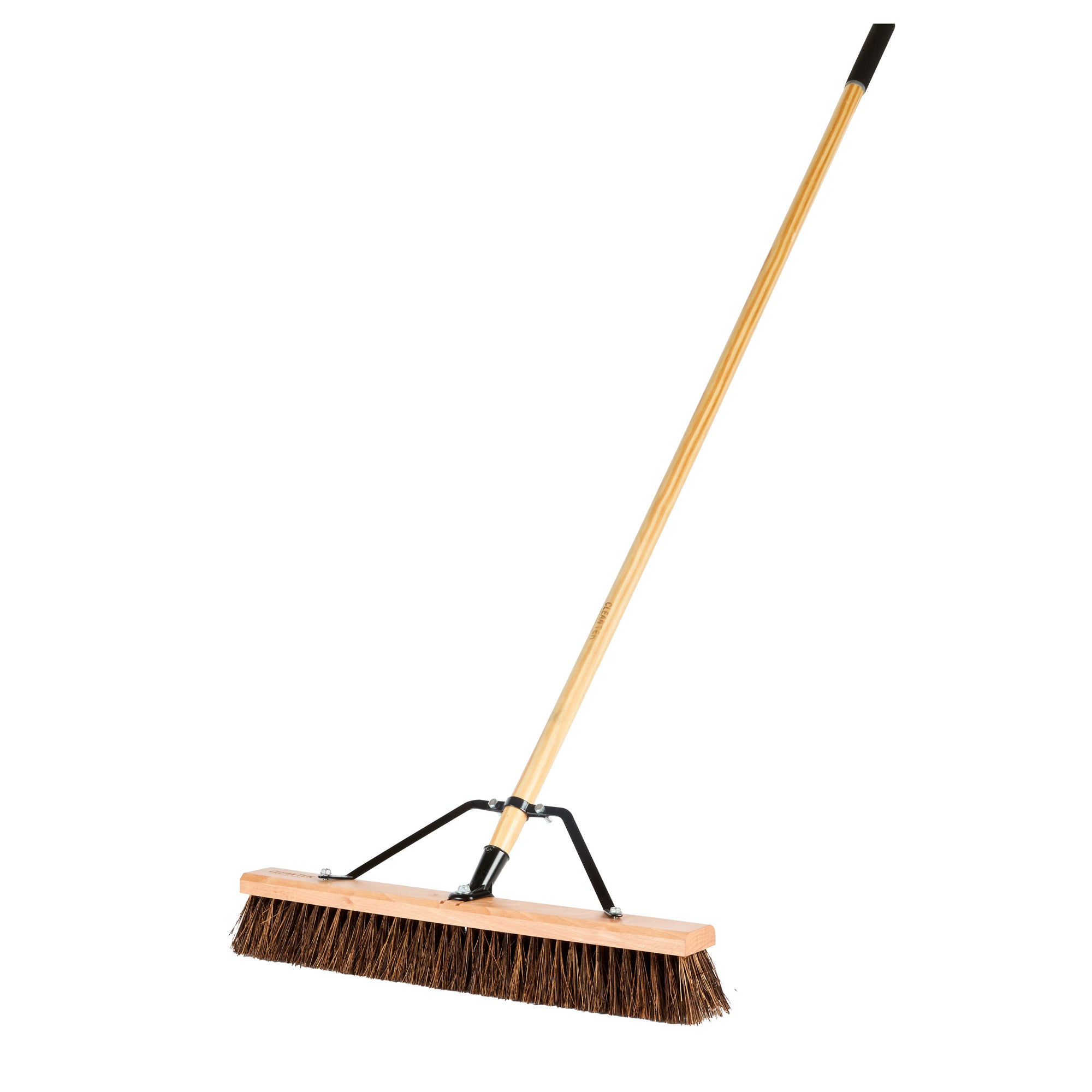 Sweep away your toughest messes with our Clean Tek Professional 24-inch Garage / Push Broom. This heavy-duty broom is equipped with Palmyra unflagged bristles, designed for effective wet and dry debris sweeping. The 60-inch wood handle of this push broom provides extended reach, allowing for easy sweeping of hard-to-reach areas while minimizing bending. Ergonomically designed, this broomstick offers a comfortable grip and reduces hand fatigue during prolonged sweeping sessions. Featuring a 24-inch wide head, this sweeper broom covers large areas quickly, making it ideal for garages, driveways, sidewalks, and patios. This dust broom is perfect for tackling rough outdoor surfaces, effectively handling wet leaves, dirt, gravel, and tough debris. With total dimensions measuring 64.17 inches in length by 25.59 inches in width by 3.15 inches in height, this broom is built for efficiency and durability. Sold in a 1 count box.