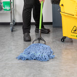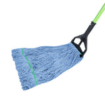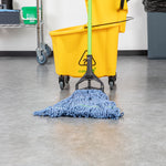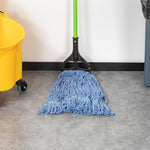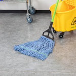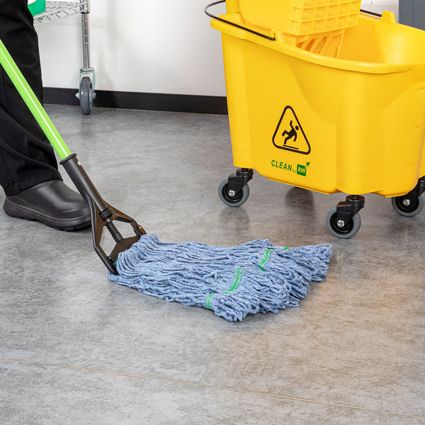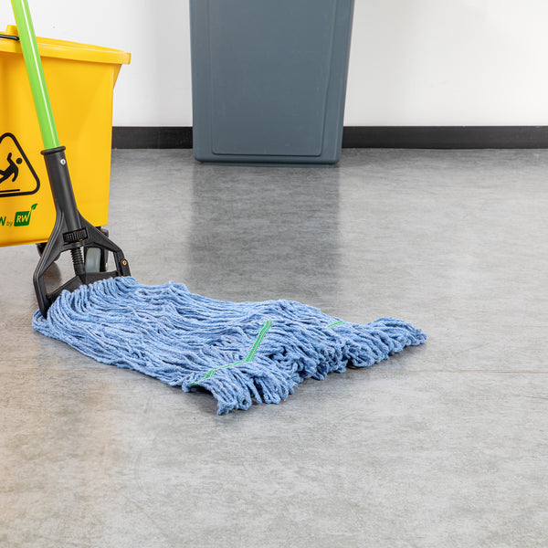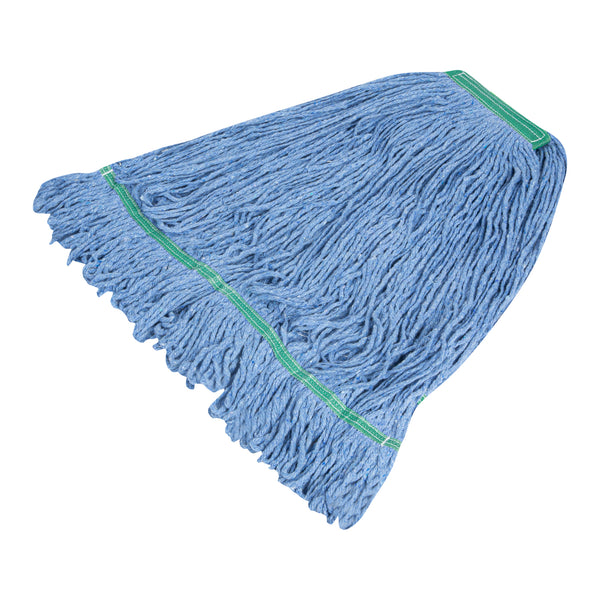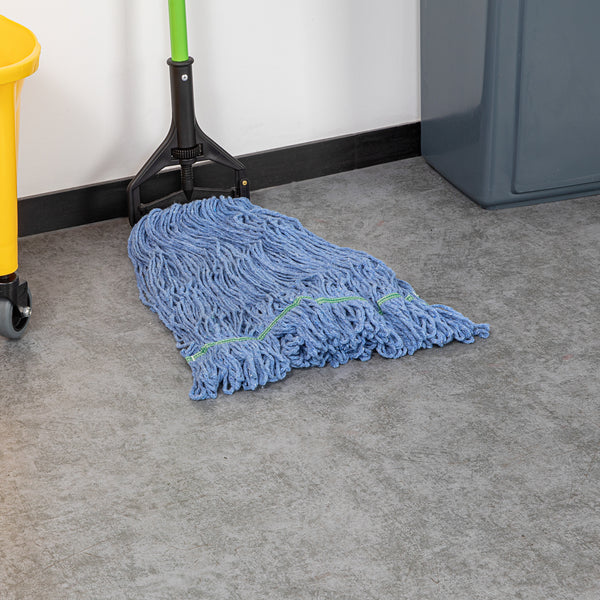 Clean floors effortlessly with our Clean Tek Professional 24-ounce Blue Cotton Blend Heavy Duty Wet Mop Head. This commercial mop head features a 1.25-inch wide headband and provides a secure attachment to compatible handles (SKUs: RWT1788K, RWT1789G, and RWT1790G), improving cleaning stability and performance. Designed with looped ends, this wet mop head prevents fraying and increases longevity, providing more effective cleaning with each use. Crafted from a premium blend of cotton and polyester, this mop head replacement boasts superior dirt pick up and absorbency, making it ideal for efficient cleaning in foodservice environments. This mop head is machine washable, allowing for easy cleaning and repeated use to ensure long-lasting performance. Each washable mop head ensures faster drying floors without streaking, perfect for maintaining a pristine kitchen or dining area. Measuring 21.65 inches in length by 5.98 inches in width by 1.97 inches in height, this blue mop head has a capacity of 24 ounces. Sold in a 1 count box. Handles are available and sold separately.