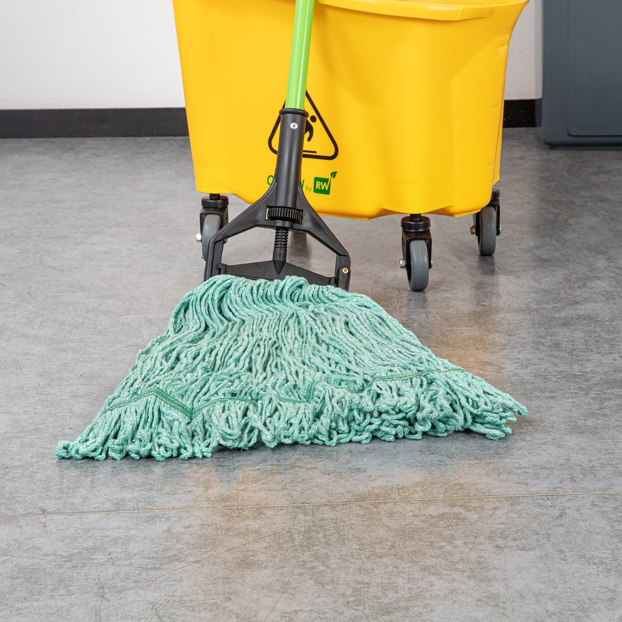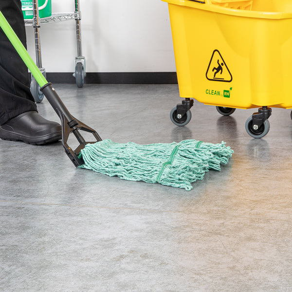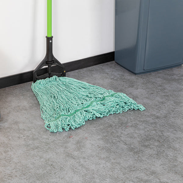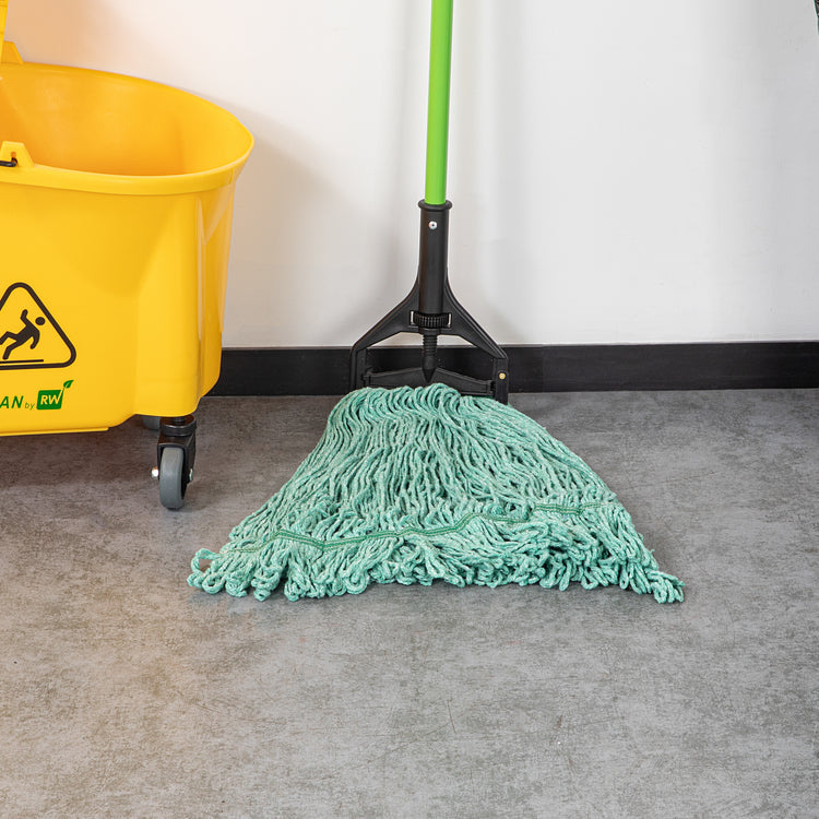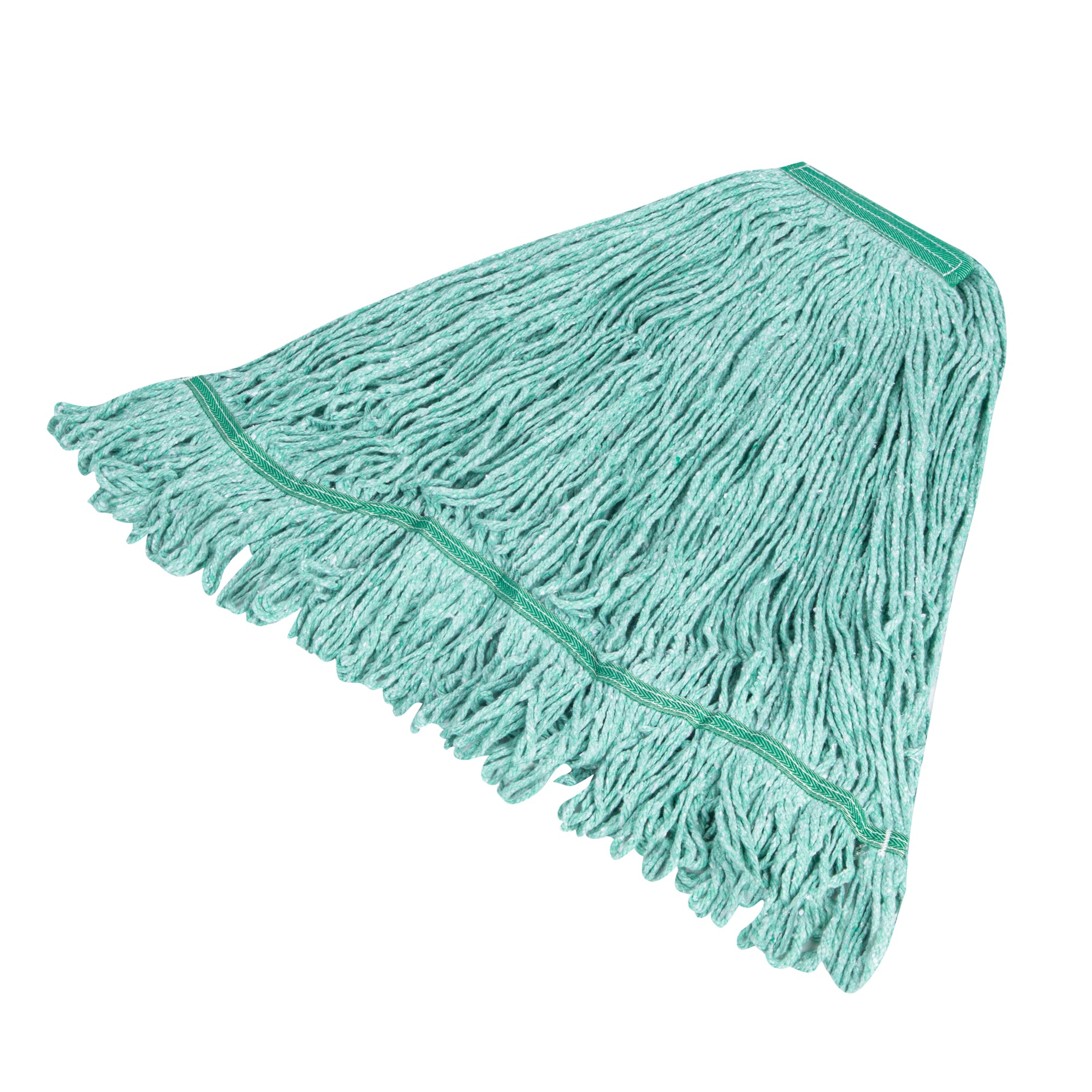 Experience superior cleaning performance with our Clean Tek Professional 24-ounce Green Cotton Blend Heavy Duty Wet Mop Head. The 1.25-inch wide headband of this mop head ensures a secure fit with compatible handles (SKUs: RWT1788K, RWT1789G, and RWT1790G), making it ideal for heavy-duty cleaning tasks. Designed with looped ends, this commercial mop head increases durability and prevents fraying, providing a longer lifespan and more effective cleaning. Crafted from a premium blend of cotton and polyester, this mop head replacement boasts superior dirt pick up and absorbency, making it ideal for efficient cleaning. This wet mop head is machine washable and can be easily cleaned for repeated use, ensuring long-lasting performance. Plus, this washable mop head ensures that your floors dry faster without streaking, leaving a spotless finish. Measuring 21.65 inches in length by 5.98 inches in width by 1.97 inches in height, this green mop head has a capacity of 24 ounces. Sold in a 1 count box. Handles are available and sold separately.