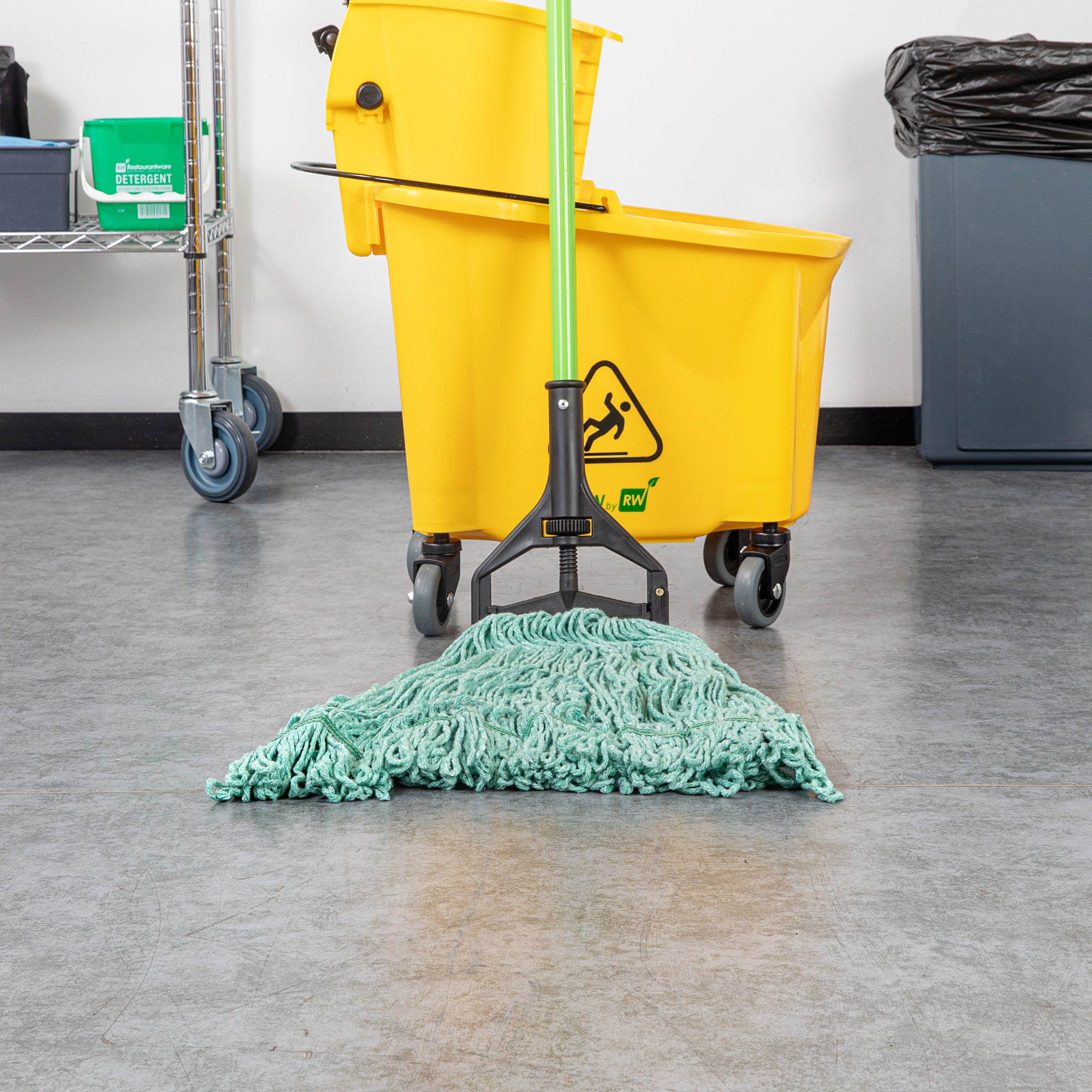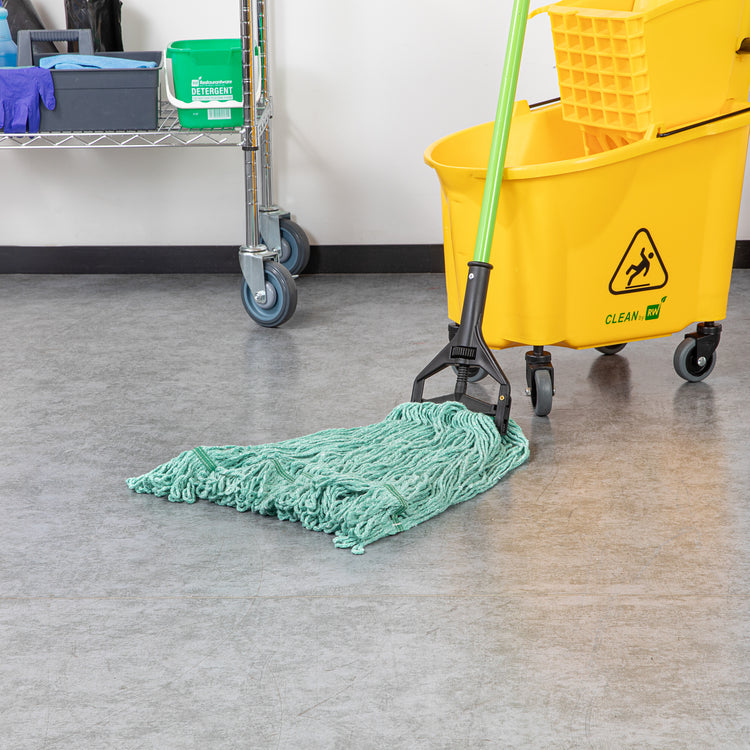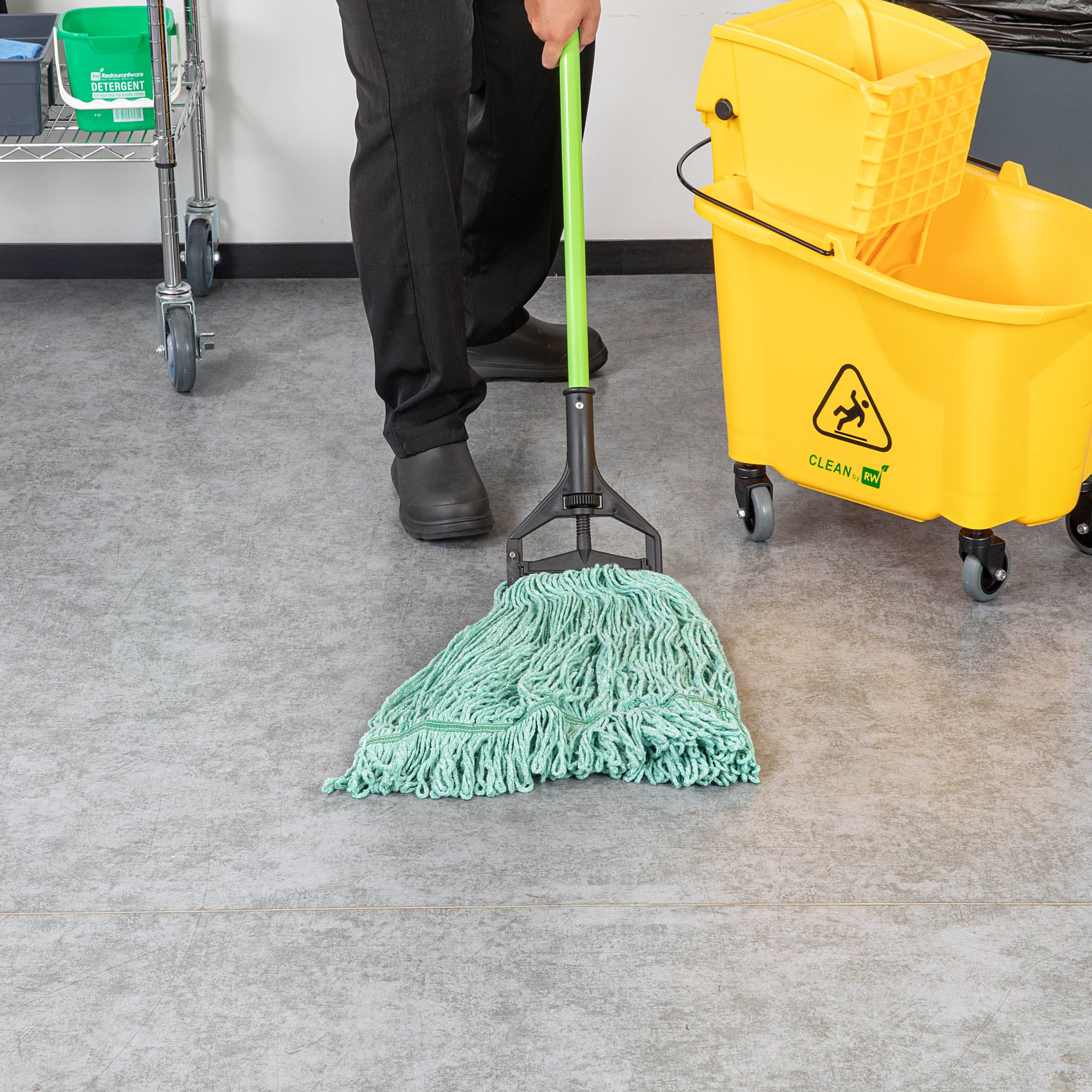 Experience superior cleaning performance with our Clean Tek Professional 24-ounce Green Cotton Blend Heavy Duty Wet Mop Head. The 1.25-inch wide headband of this mop head ensures a secure fit with compatible handles (SKUs: RWT1788K, RWT1789G, and RWT1790G), making it ideal for heavy-duty cleaning tasks. Designed with looped ends, this commercial mop head increases durability and prevents fraying, providing a longer lifespan and more effective cleaning. Crafted from a premium blend of cotton and polyester, this mop head replacement boasts superior dirt pick up and absorbency, making it ideal for efficient cleaning. This wet mop head is machine washable and can be easily cleaned for repeated use, ensuring long-lasting performance. Plus, this washable mop head ensures that your floors dry faster without streaking, leaving a spotless finish. Measuring 21.65 inches in length by 5.98 inches in width by 1.97 inches in height, this green mop head has a capacity of 24 ounces. Sold in a 1 count box. Handles are available and sold separately.