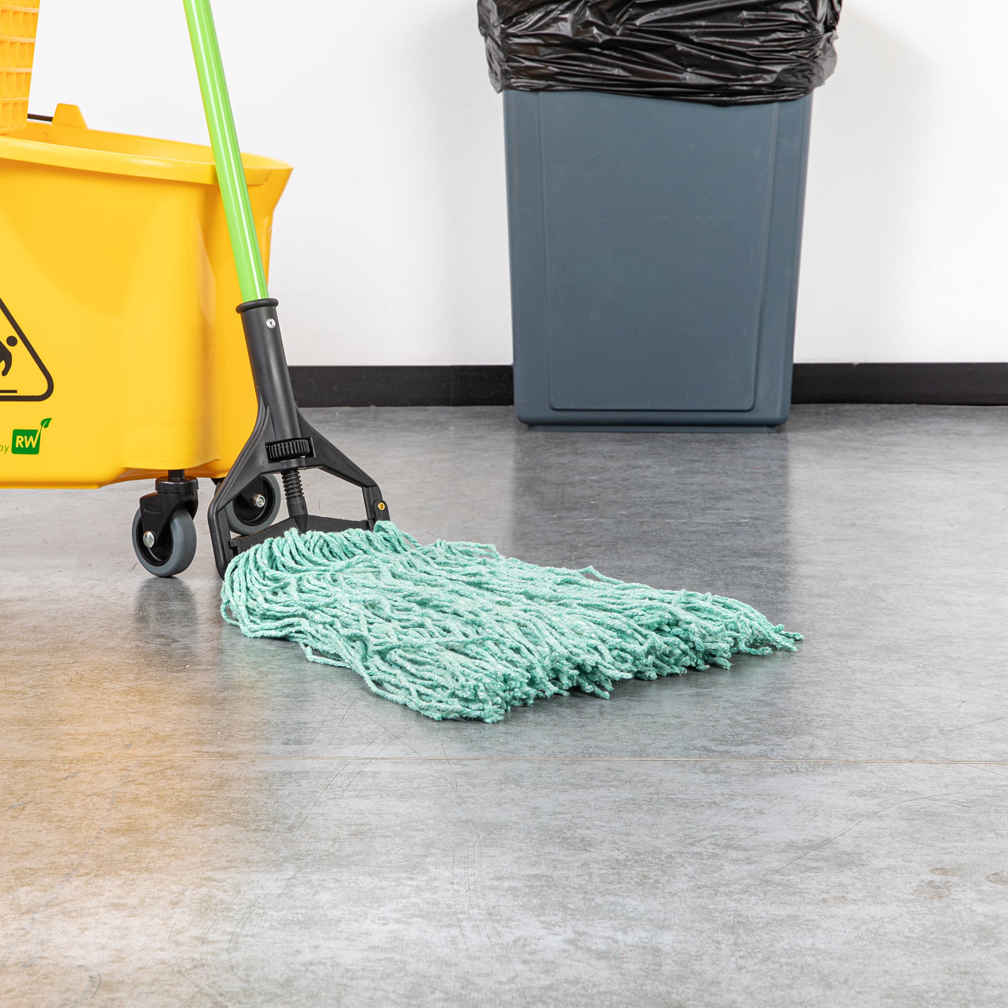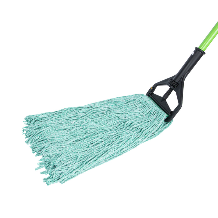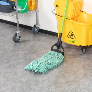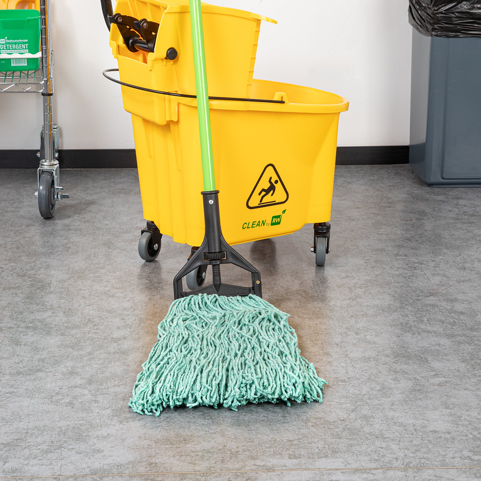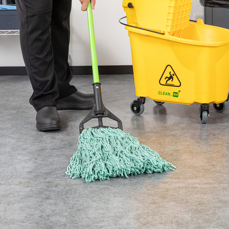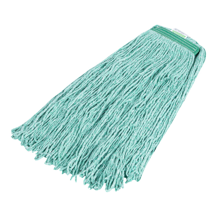 Keep your floors neat and clean with our Clean Tek Professional 24-ounce Green Cotton Blend Heavy Duty Wet Mop Head. This mop head features a 1.25-inch wide headband that fits securely on compatible handles (SKUs: RWT1788K, RWT1789G, and RWT1790G), offering better stability and effectiveness during use. Designed with a cut end, this wet mop head absorbs liquids quickly, effectively handling spills and messes with ease. Crafted from a premium blend of cotton and polyester, this washable mop head boasts superior dirt pick up and absorbency, ensuring efficient and thorough cleaning. This commercial mop head is machine washable and easy to clean for repeated use ensuring long-lasting performance. Ideal for busy foodservice environments, this green mop head ensures that your floors dry faster without streaking, maintaining a pristine appearance. Measuring 19.69 inches in length by 5.98 inches in width by 1.97 inches in height, this mop head replacement has a capacity of 24 ounces. Sold in a 1 count box. Handles are available and sold separately.