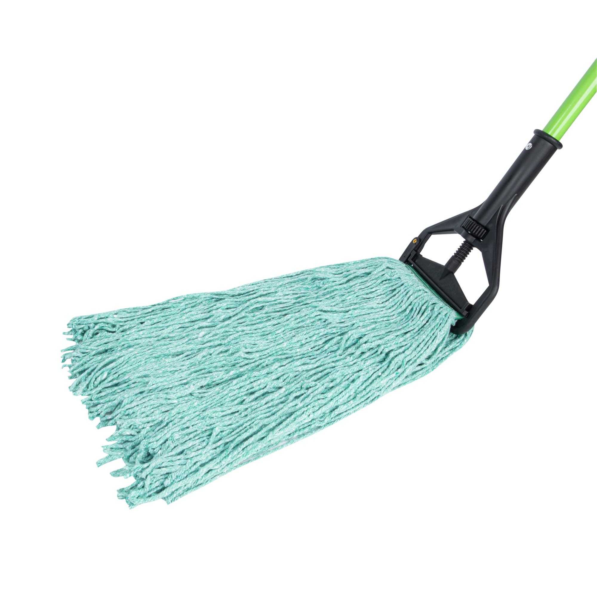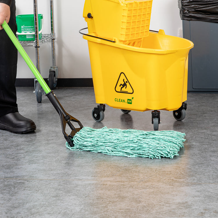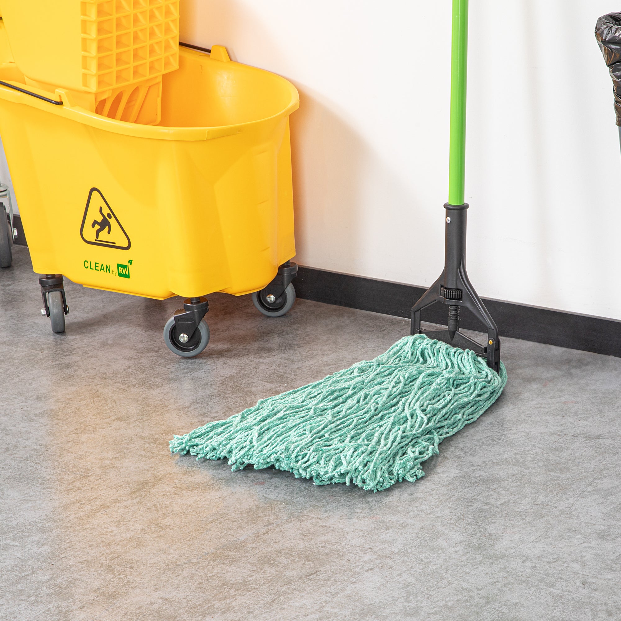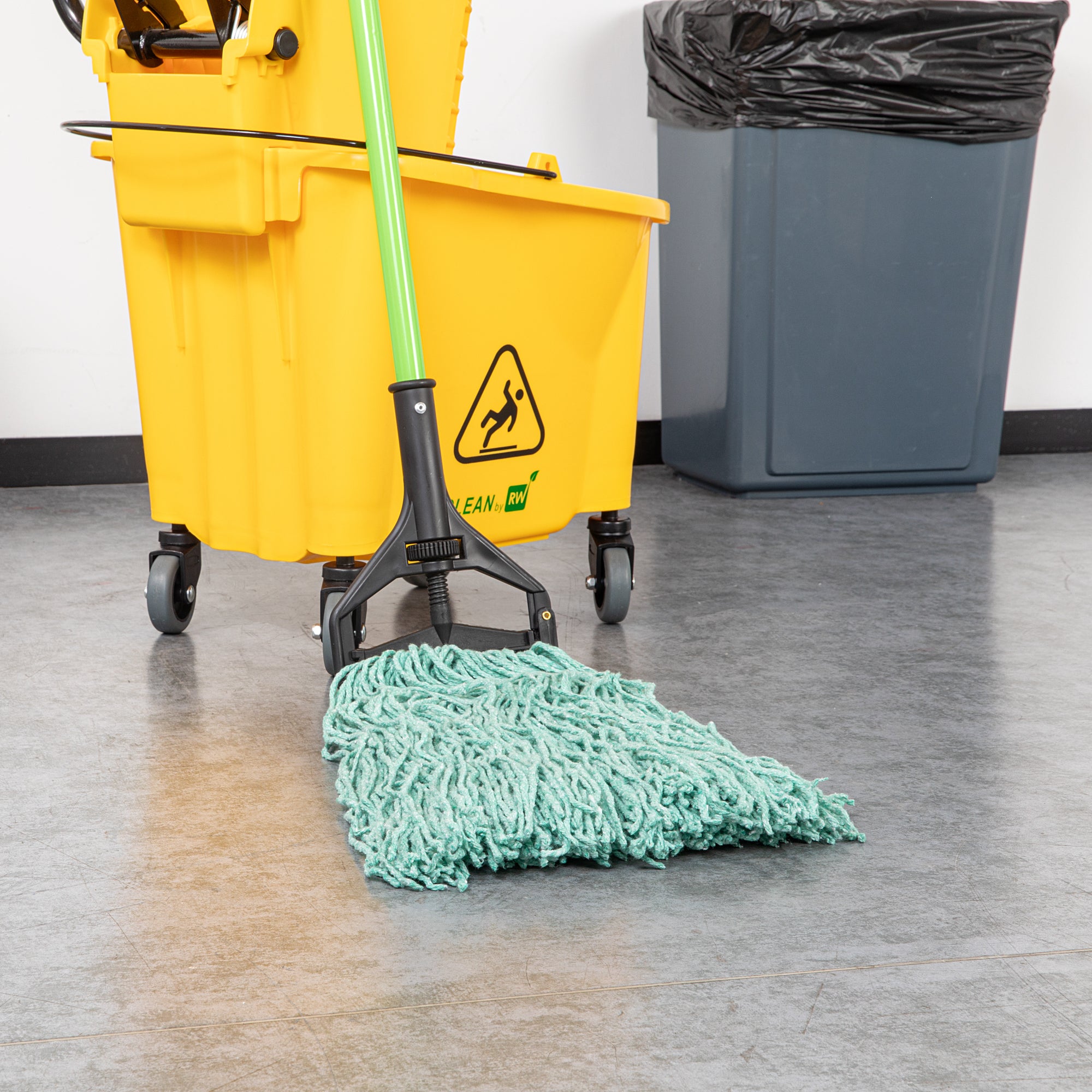 Keep your floors neat and clean with our Clean Tek Professional 24-ounce Green Cotton Blend Heavy Duty Wet Mop Head. This mop head features a 1.25-inch wide headband that fits securely on compatible handles (SKUs: RWT1788K, RWT1789G, and RWT1790G), offering better stability and effectiveness during use. Designed with a cut end, this wet mop head absorbs liquids quickly, effectively handling spills and messes with ease. Crafted from a premium blend of cotton and polyester, this washable mop head boasts superior dirt pick up and absorbency, ensuring efficient and thorough cleaning. This commercial mop head is machine washable and easy to clean for repeated use ensuring long-lasting performance. Ideal for busy foodservice environments, this green mop head ensures that your floors dry faster without streaking, maintaining a pristine appearance. Measuring 19.69 inches in length by 5.98 inches in width by 1.97 inches in height, this mop head replacement has a capacity of 24 ounces. Sold in a 1 count box. Handles are available and sold separately.