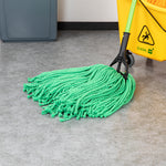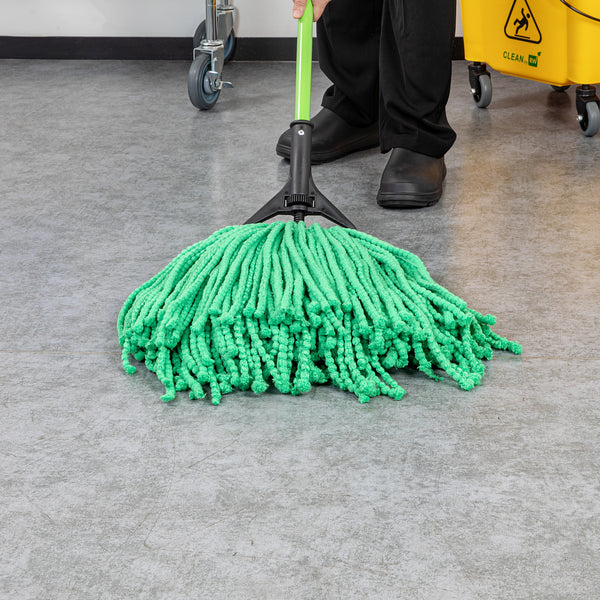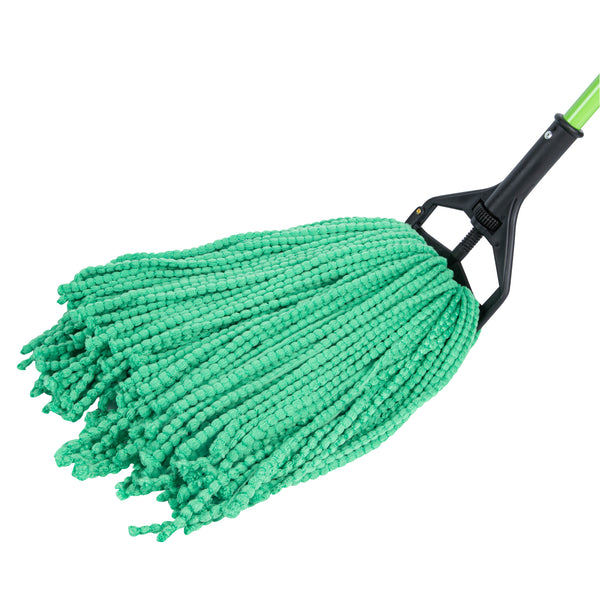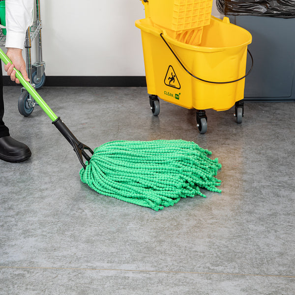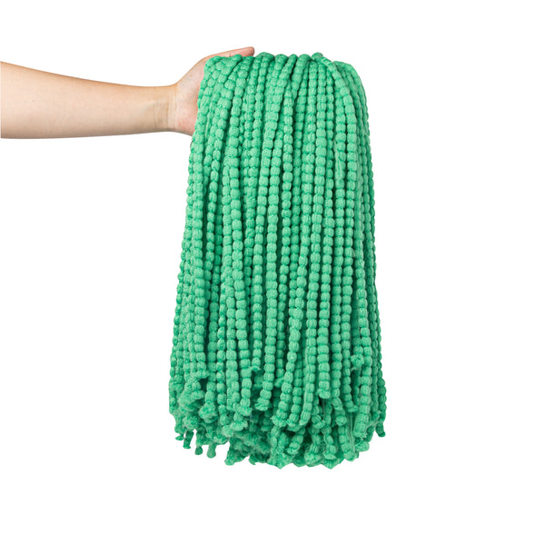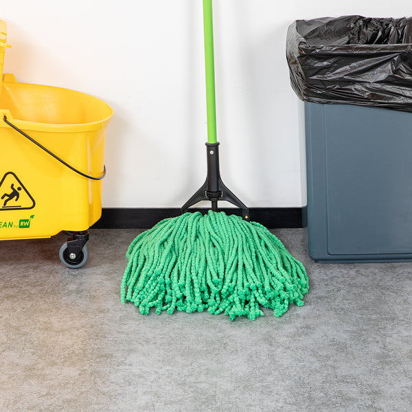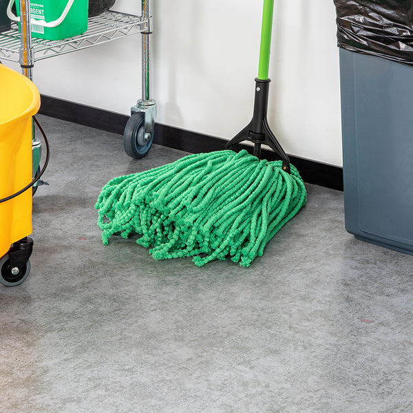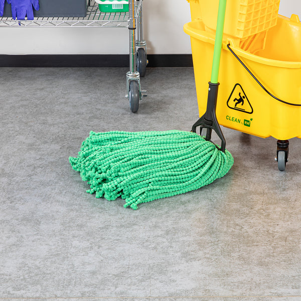 Maintain a spotless establishment with our Clean Tek Professional 24-ounce Green Microfiber Wet Mop Head. Designed with a 1.25-inch wide headband, this mop head ensures a secure fit with its compatible handles (SKU: RWT1788K, RWT1789G, and RWT1790G), making it ideal for heavy-duty cleaning tasks. The looped end of this wet mop head enhances durability and prevents fraying, providing a longer lifespan and more efficient cleaning. Created from premium microfiber, this commercial mop head offers superior dirt pickup and absorbency for effective cleaning. The mildew-resistant microfiber fabric of this mop head replacement lints less, ensuring a cleaner environment. This microfiber mop head is machine washable, making it easy to clean for repeated use and ensuring long-lasting performance. Each washable mop head allows floors to dry faster without streaking, improving your cleaning results. Measuring 19.69 inches in length by 5.98 inches in width by 1.97 inches in height, this green mop head has a capacity of 24 ounces. Sold in a 1 count box. Handles are available and sold separately.