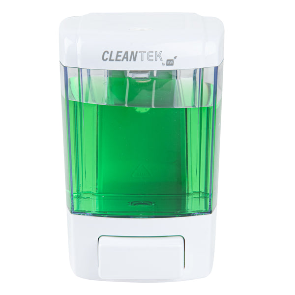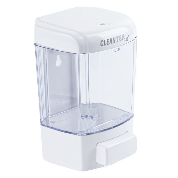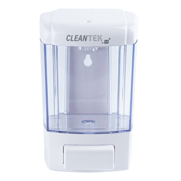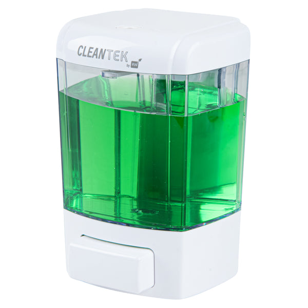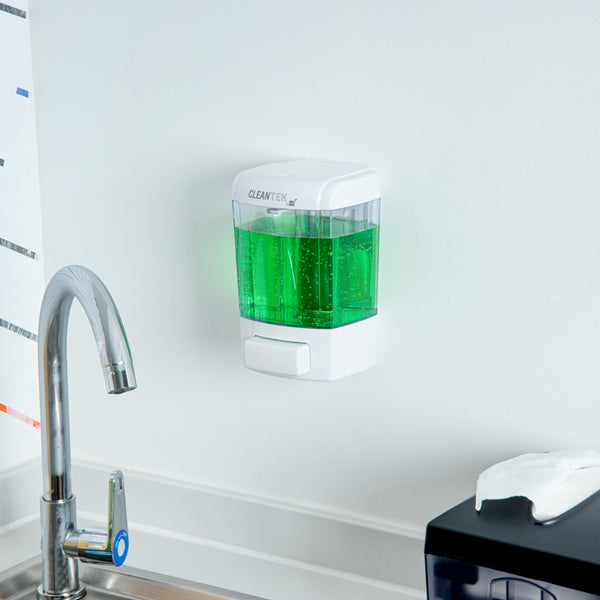 Keep your restaurant, hotel, or office hand washing station stocked with soap by using our Clean Tek Professional 24-ounce White Manual Soap Dispenser. Made with high-quality ABS plastic, this dish soap dispenser is sturdy, and impact resistant. This hand soap dispenser comes with a mounting plate on the back, enabling it to be mounted onto any hard surface. To make installation easier, the package of this soap dispenser includes 3 plastic expansion bolts and 3 screws. This wall-mountable soap dispenser is designed with a large push button for comfortable operation. The measured dispensing of this hand wash dispenser reduces the excessive use of liquid soap. Featuring a clear soap tank, this kitchen soap dispenser makes it easy to see how much liquid soap is left, allowing refilling when necessary. Plus, the wide opening at the top of this gel dispenser makes refilling convenient and fast. The non-leak outlet of this refillable soap dispenser instantly cuts off soap flow after use to help reduce messes and the spread of germs. Equipped with a tamper-proof security key lock to prevent external contamination, this liquid soap dispenser is safe and suitable for public spaces. The white finish of this hand-press soap dispenser provides a pristine look to your handwashing space. Measuring 4.25 inches long by 4.25 inches wide by 6.5 inches tall, this white soap dispenser has a capacity of 24 ounces, making it a great addition to public restrooms, schools, or healthcare settings. Shipped in a 1 count box.
