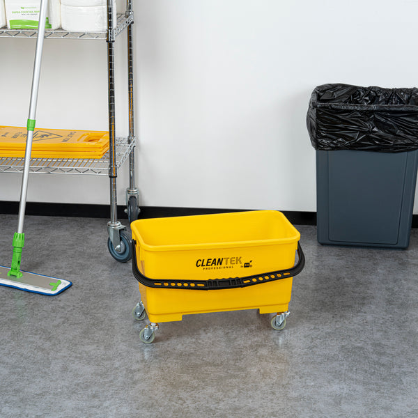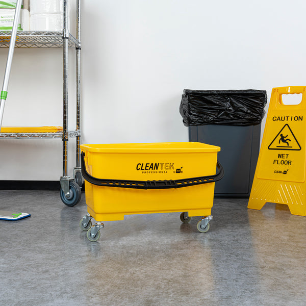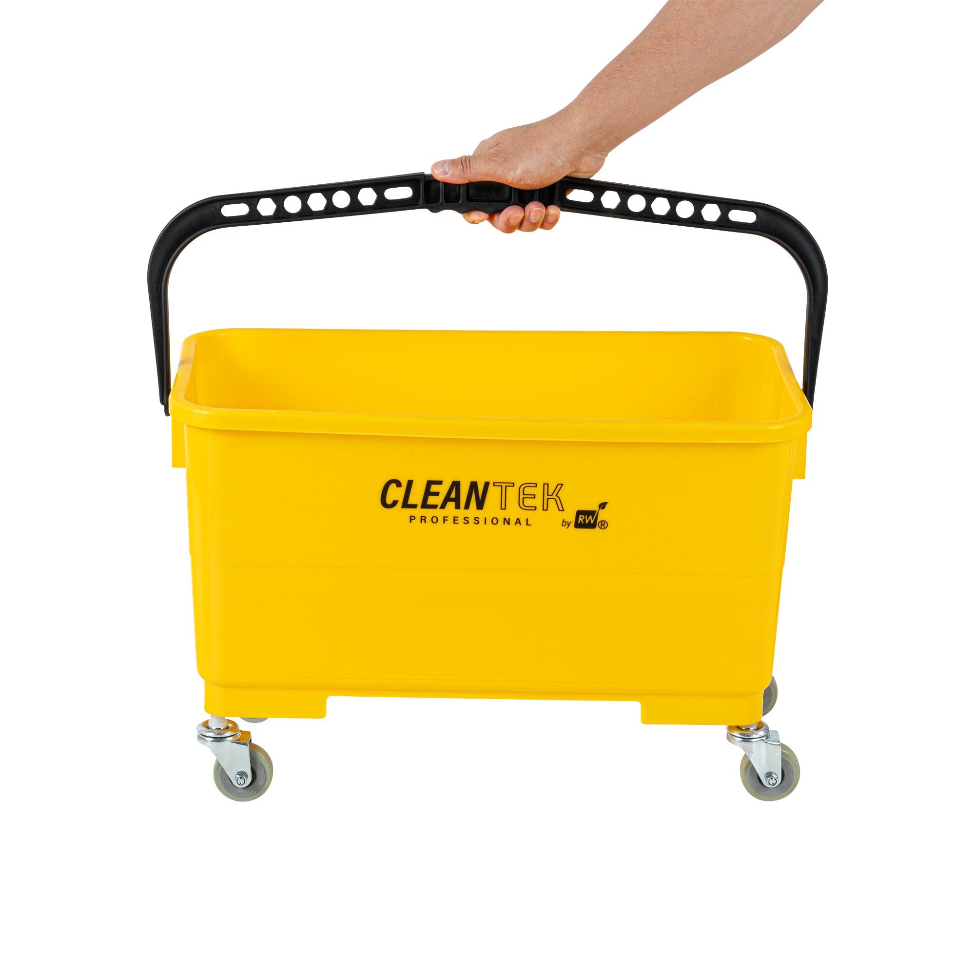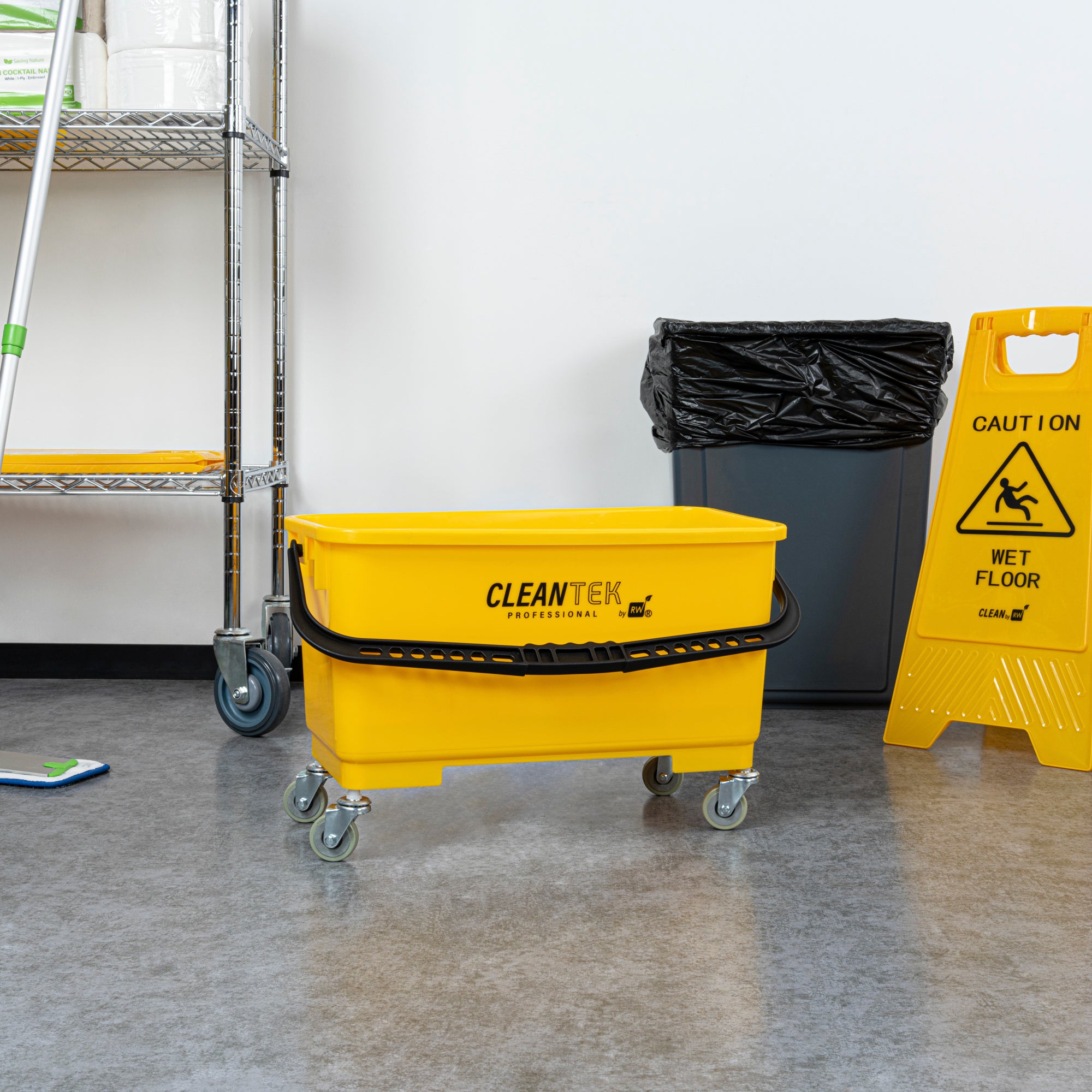 Enhance your cleaning efficiency with our Clean Tek Professional 25-quart Yellow Bucket. This cleaning bucket comes with 4 non-marking casters that glide smoothly for fast transportation without leaving scuff marks on the floors. The sieve of this plastic bucket ensures efficient drainage and filtering, allowing for quick and easy separation of liquids and solids. Crafted from durable plastic, this mop bucket is designed for long-lasting use and can withstand frequent handling and various environmental conditions. This plastic bucket with handle is ideal for washing windows, cleaning cars, finishing floors, and handling a variety of other tasks around the home or workplace. The handle of this yellow bucket is ergonomically designed for comfortable gripping and easy maneuverability, making it convenient to carry and transport. With a capacity of 25 quarts, this plastic cleaning bucket measures 22.05 inches in length by 11.61 inches in width by 13.39 inches in height. Sold in a 1 count box.