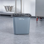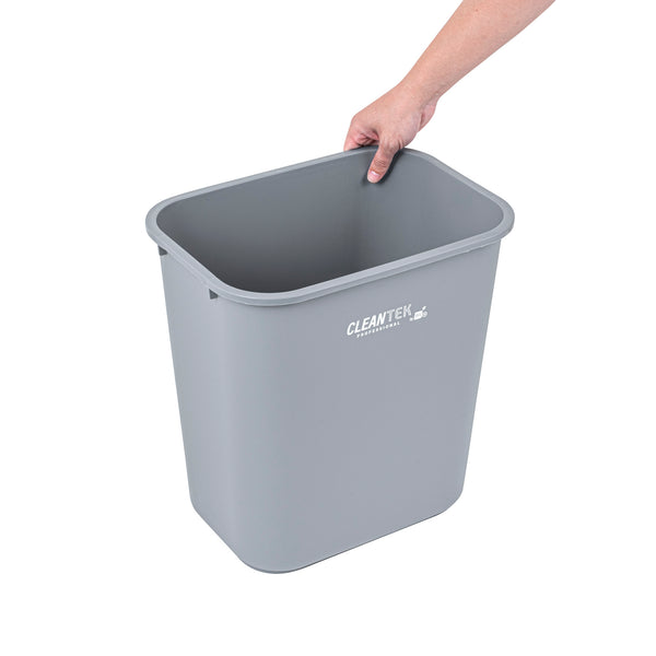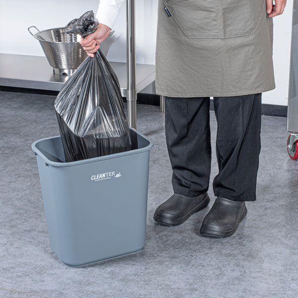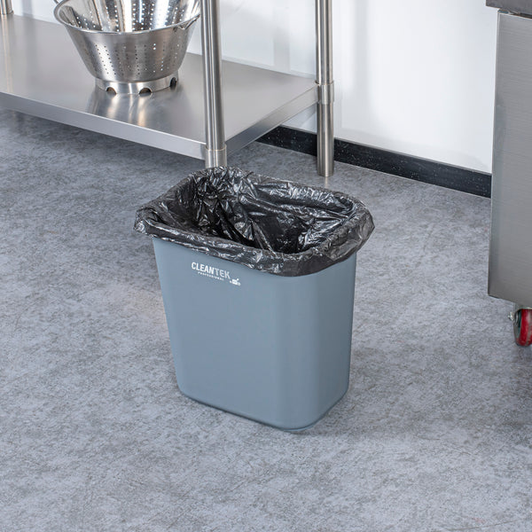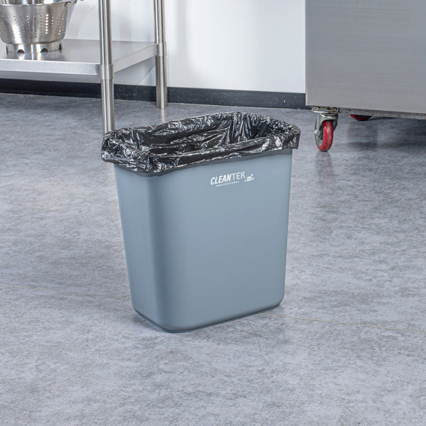 Optimize your waste management process with a space-saving solution. The Clean Tek Professional Space-Efficient Gray Plastic Rectangular Trash Can boasts durable plastic construction, ensuring long-lasting use even in high-traffic areas of your restaurant or office. Its 28-quart capacity accommodates substantial waste, minimizing the frequency of emptying and enhancing operational efficiency. This rectangular trash can is designed to fit seamlessly against walls or under counters, maximizing space in tight kitchen corners. The neutral gray finish blends effortlessly with various interior decors while also concealing dirt, making it an ideal office wastebasket. The premium construction withstands the demands of heavy-duty foodservice environments, providing reliable performance. Its smooth surface facilitates easy cleaning and maintenance, ensuring hygiene standards are consistently met. Each order includes 1 Clean Tek Professional Space-Efficient Gray Plastic Rectangular Trash Can.