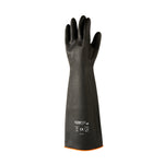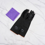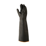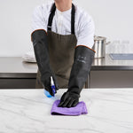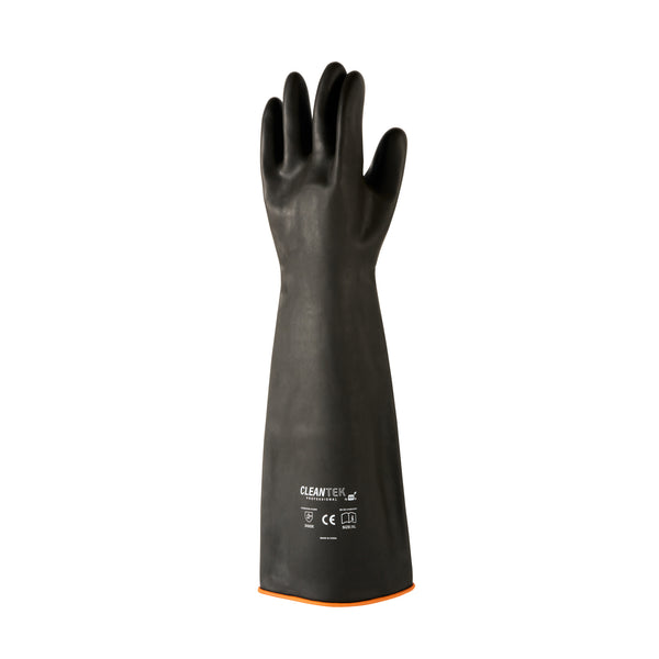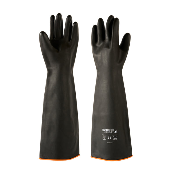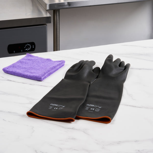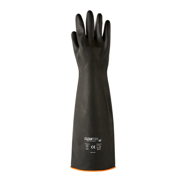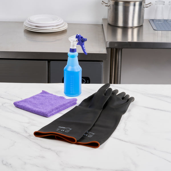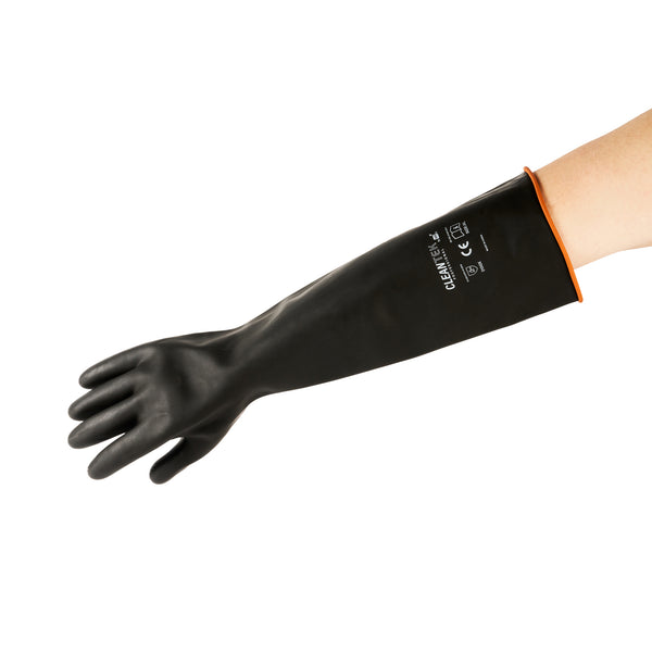 Ensure safe food handling with enhanced chemical resistance. Clean Tek Professional Extended Length Chemical-Resistant Gloves are crafted from robust black rubber, providing superior protection against harmful substances during foodservice operations. With their extended length of 21.7 inches, these gloves offer extra arm coverage, making them the ideal extra long rubber gloves for environments where splashes and spills are common. The heavy-duty construction of these gloves shields hands from cooking spills, while the oil resistance feature ensures protection during high-grease tasks, making them indispensable as heavy duty chemical gloves in any commercial kitchen. Their recyclable design supports eco-friendly operations, aligning with sustainability goals without compromising on durability. Equip your staff with these gloves to maintain a safe, efficient workspace. Each order includes 10 Clean Tek Professional Extended Length Chemical-Resistant Gloves.