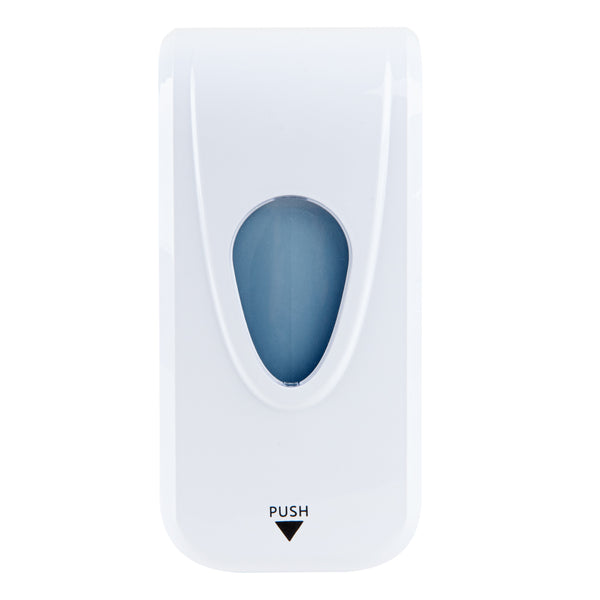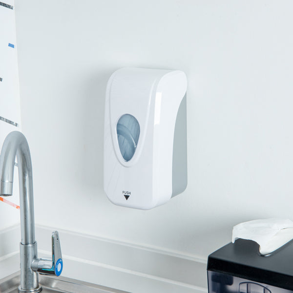 Use our Clean Tek Professional 33 oz White Manual Soap Dispenser to make soap easily accessible. Featuring a push button with an arrow, this manual soap dispenser allows your customers to quickly and easily understand how to operate the dispenser. This hand-press soap dispenser is made from ABS plastic, ensuring it endures everyday use in your kitchen or restroom. With a viewing window, this plastic soap tank allows you to quickly identify when the dispenser needs to be refilled. This 33-ounce dispenser can conveniently contain gel or liquid soap, allowing you to use the type of soap you prefer. With a chic white finish, this liquid soap dispenser complements the aesthetics of your kitchen, restroom, or hand washing station. With a wall-mountable design, this durable soap dispenser will be easy to locate and allows you to strategically place it wherever you want. This hand-press soap tank allows patrons and staff members to control the soap volume and stops dispensing soap when it's pushed to avoid waste. Measuring 9 inches long by 4.5 inches wide by 4.25 inches tall, this wall-mountable soap dispenser contains up to 33 ounces. Shipped in a 1 count box.