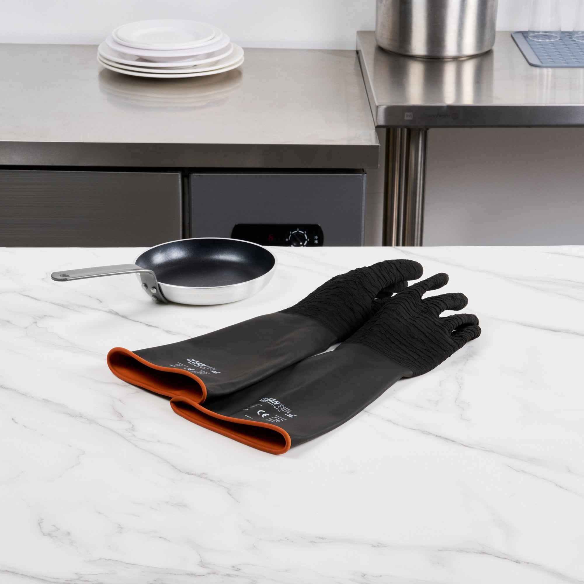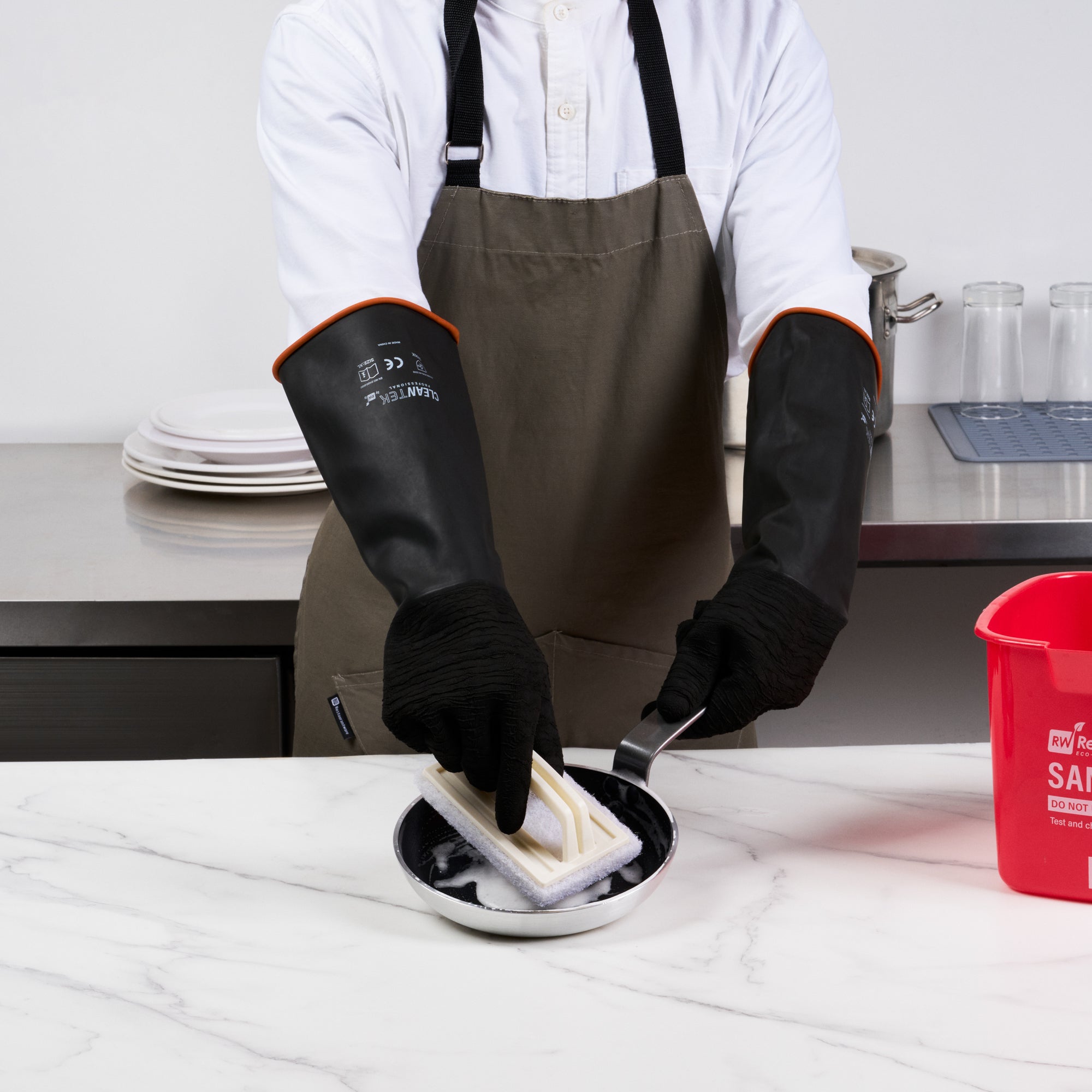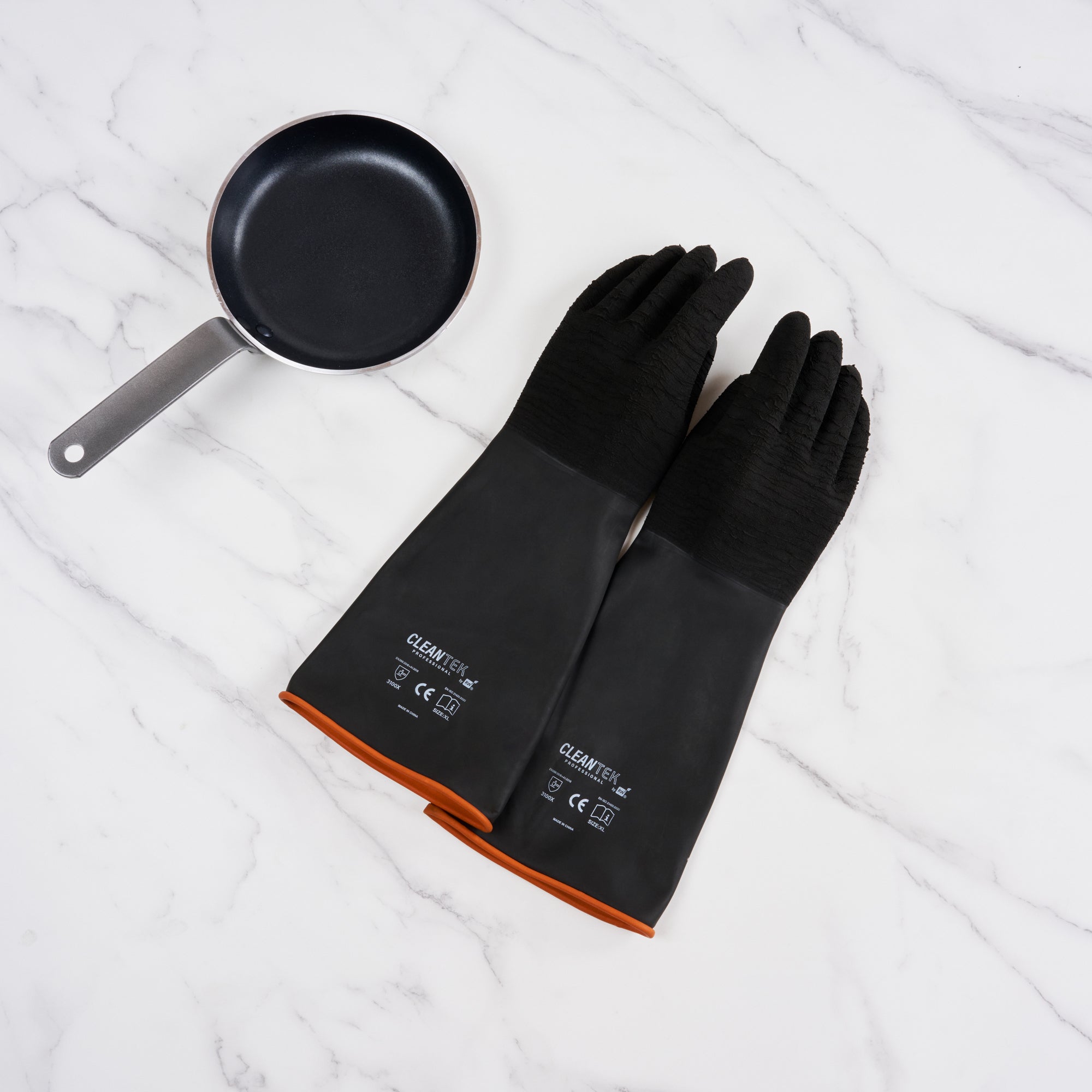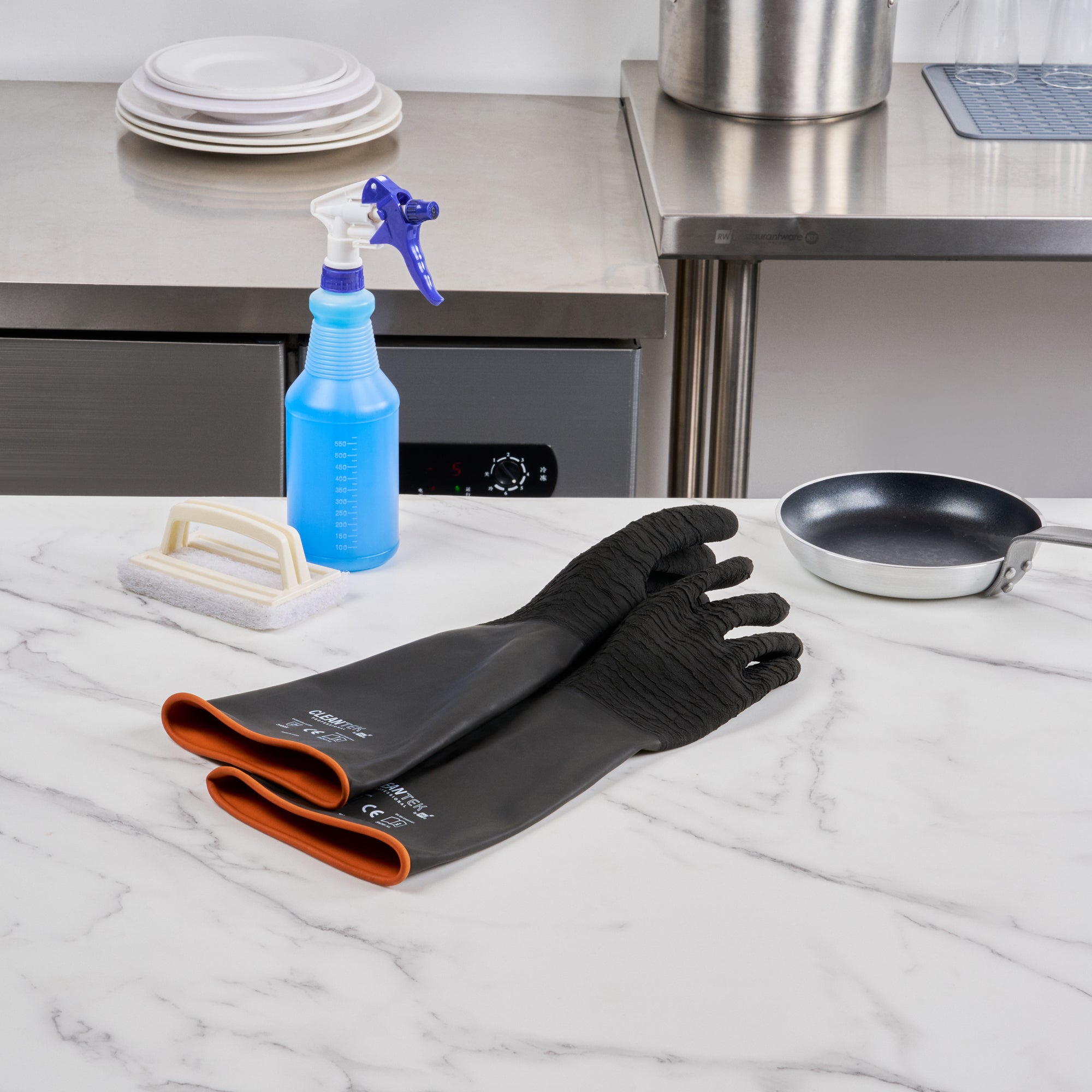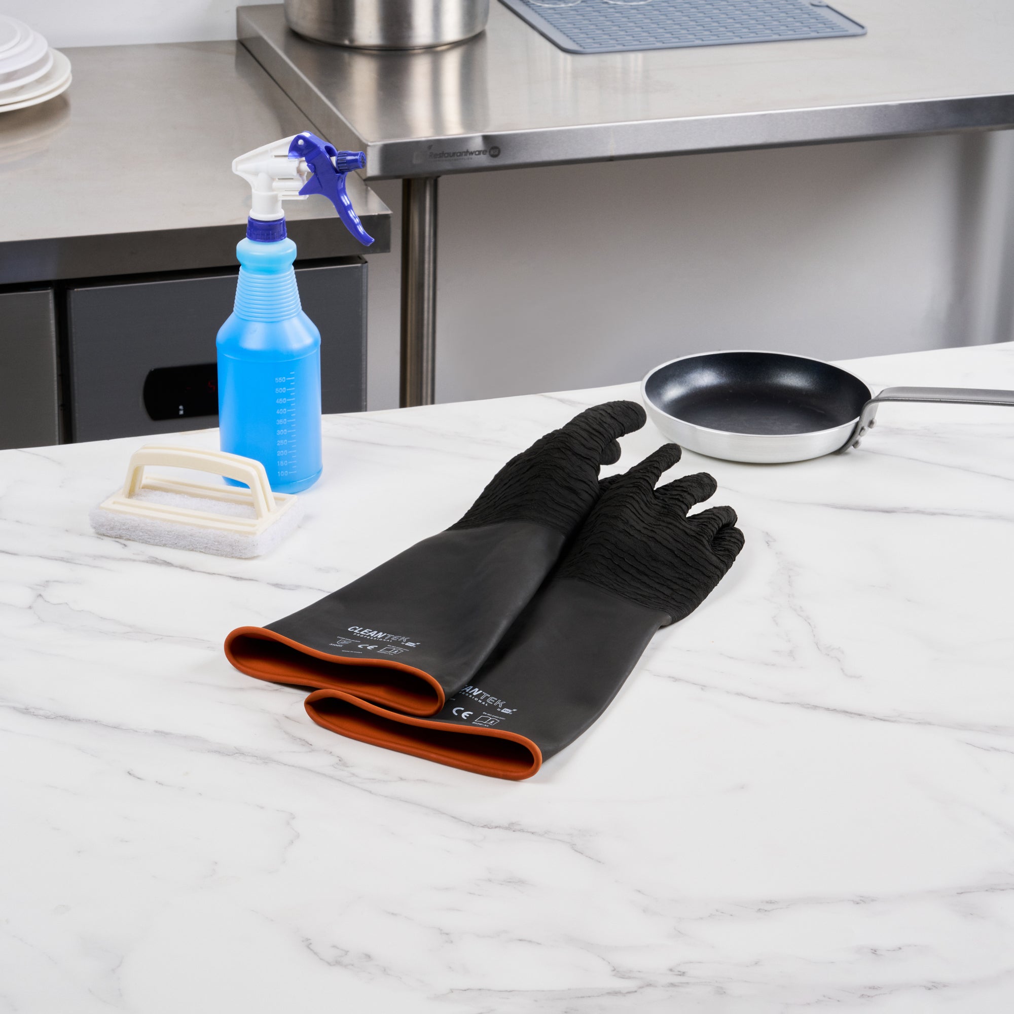 Ensure safe handling of harsh chemicals with robust protection. Clean Tek Chemical-Resistant Gloves deliver superior chemical resistance, making them ideal for foodservice professionals dealing with food-grade acids and alkalis. With a 35 mil thick latex construction, these chemical resistant gloves prevent harmful exposure, ensuring safety during handling. Designed with an anti-slip feature, these waterproof work gloves enhance grip, minimizing accidents when managing wet or slippery items. The heavy-duty coverage, extending up to 17.72 inches in length, safeguards forearms from kitchen spills and splashes, making them perfect for dishwashing and janitorial tasks. The secure-grip gloves' unlined interior facilitates easy cleaning and quick drying, maintaining high hygiene standards. Equip your staff with reliable, protective gear that ensures both safety and efficiency in demanding environments. You will receive 1 pair of gloves per order.