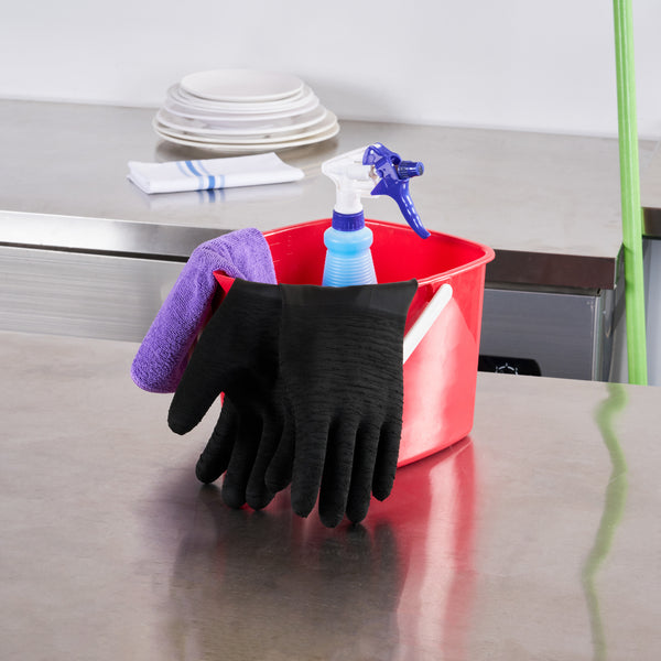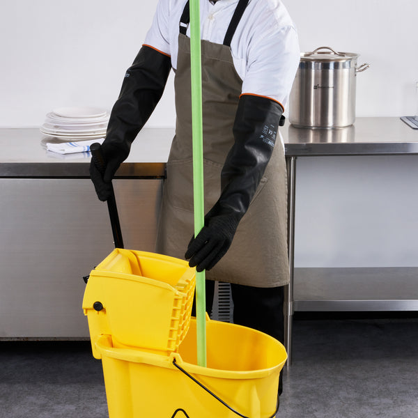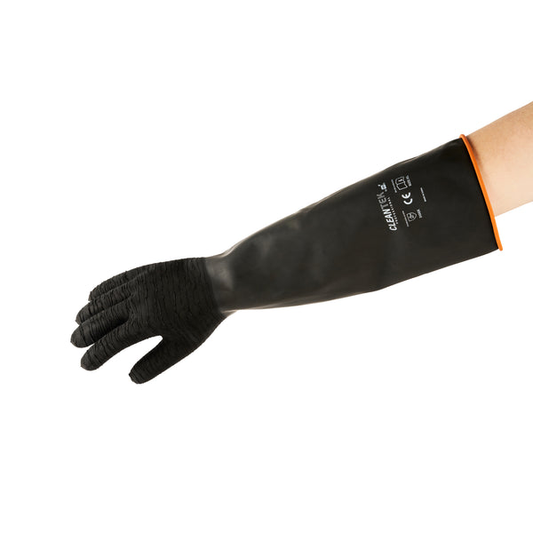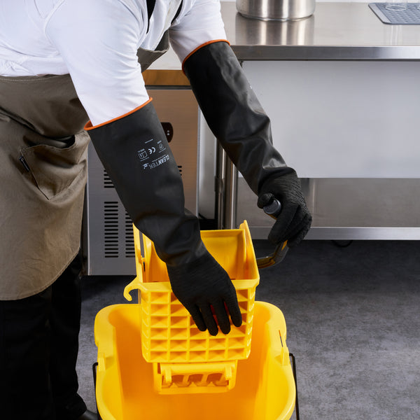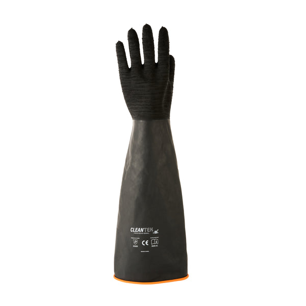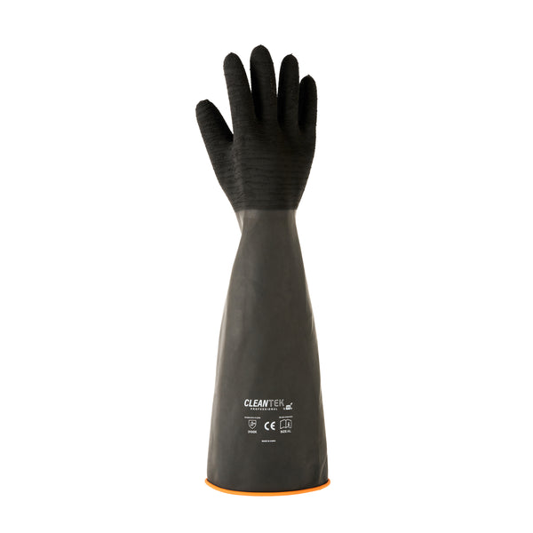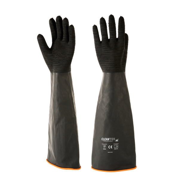 Safeguard your team with dependable protection from spills and contamination. Clean Tek Professional Chemical-Resistant Industrial Rubber Gloves guard against hazardous spills, ensuring safety in fast-paced environments where industrial rubber gloves are essential. The chemical-resistant gloves feature robust oil resistance, maintaining cleanliness and efficiency in fry stations. With acid and alkali resistance, these gloves guarantee longevity in commercial kitchens, providing unmatched durability and reliability. Crafted from high-quality black rubber, these extra long rubber gloves measure 21.65 inches in length, offering extended coverage to safeguard your staff’s hands and arms effectively. Their recyclable nature highlights a commitment to sustainable operations, appealing to environmentally conscious establishments. Each order includes 10 Clean Tek Professional Chemical-Resistant Industrial Rubber Gloves.