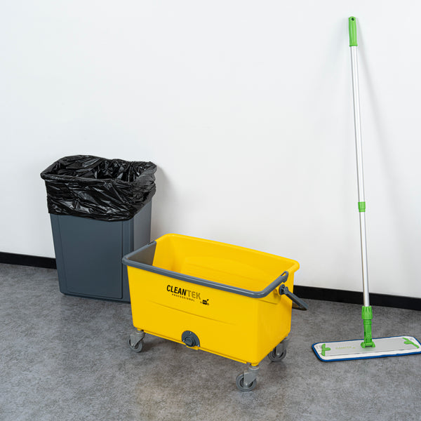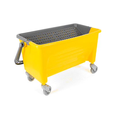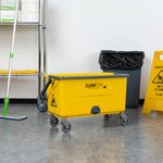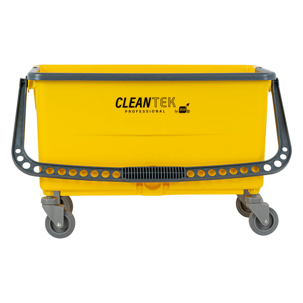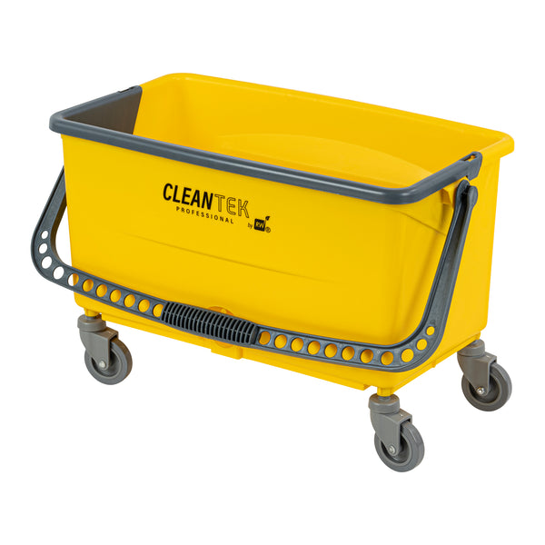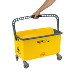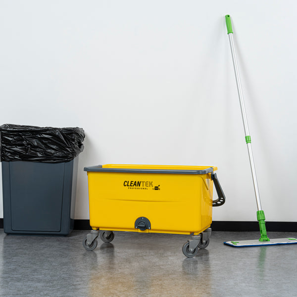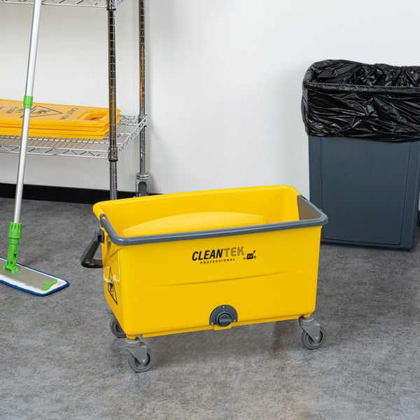 Elevate cleaning efficiency in your establishment with our Clean Tek Professional 44-quart Yellow No-Touch Microfiber Mop Bucket. This mop bucket features a convenient drain valve that quickly siphons water away with a simple twist to the On or Off setting. With an innovative no-touch design, this commercial mop bucket allows you to swiftly wring out a mop head by pushing it against the sieve, avoiding contact with dirty water. Equipped with 4 casters, this industrial mop bucket ensures smooth mobility and can be easily transported from room to room. This yellow mop bucket has a sturdy handle that offers a comfortable grip, making it easy to lift and empty it after cleaning. The washboard surface of this plastic mop bucket efficiently removes dirt from mop pads before wringing, helping to maintain cleaner water for longer periods. With a bright yellow finish, this plastic bucket facilitates a color-coded system to prevent cross-contamination and promote an organized environment. Measuring 26.77 inches in length by 14.17 inches in width by 15.75 inches in height, this yellow bucket can hold up to 44 quarts. Sold in a 1 count box.