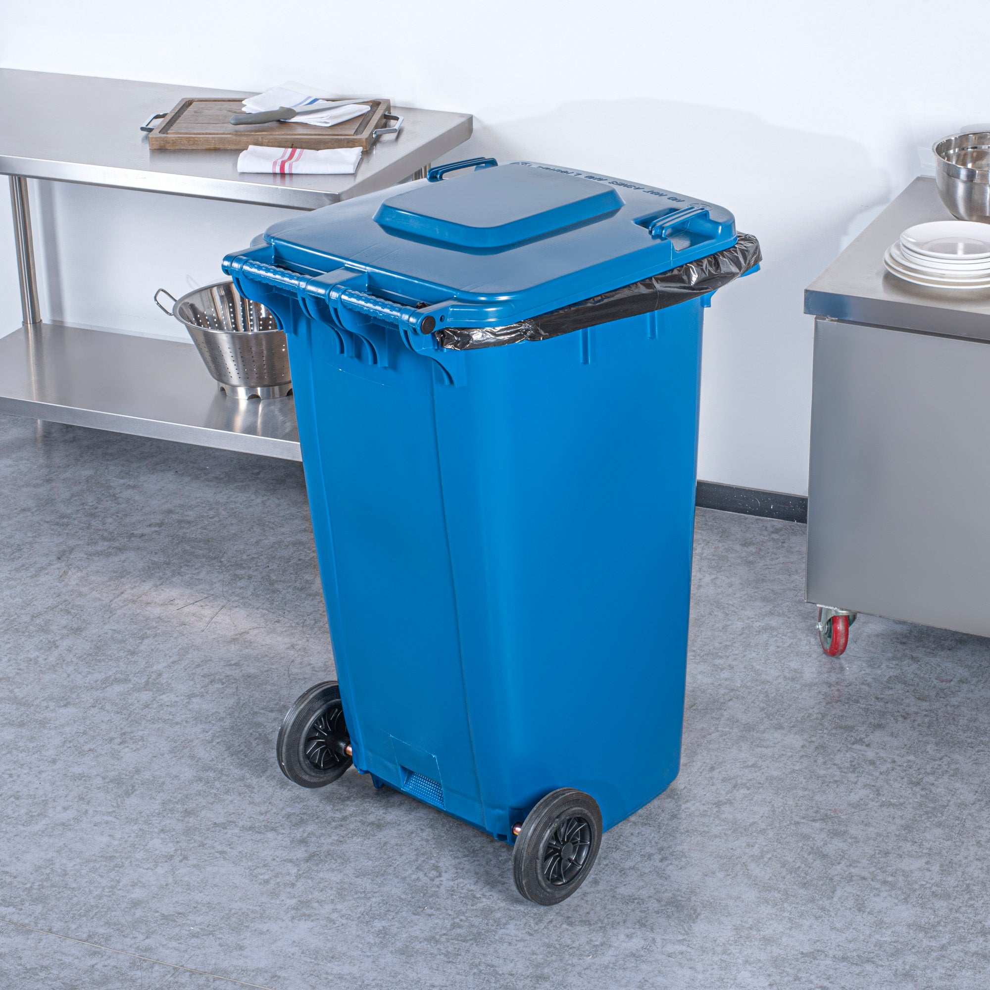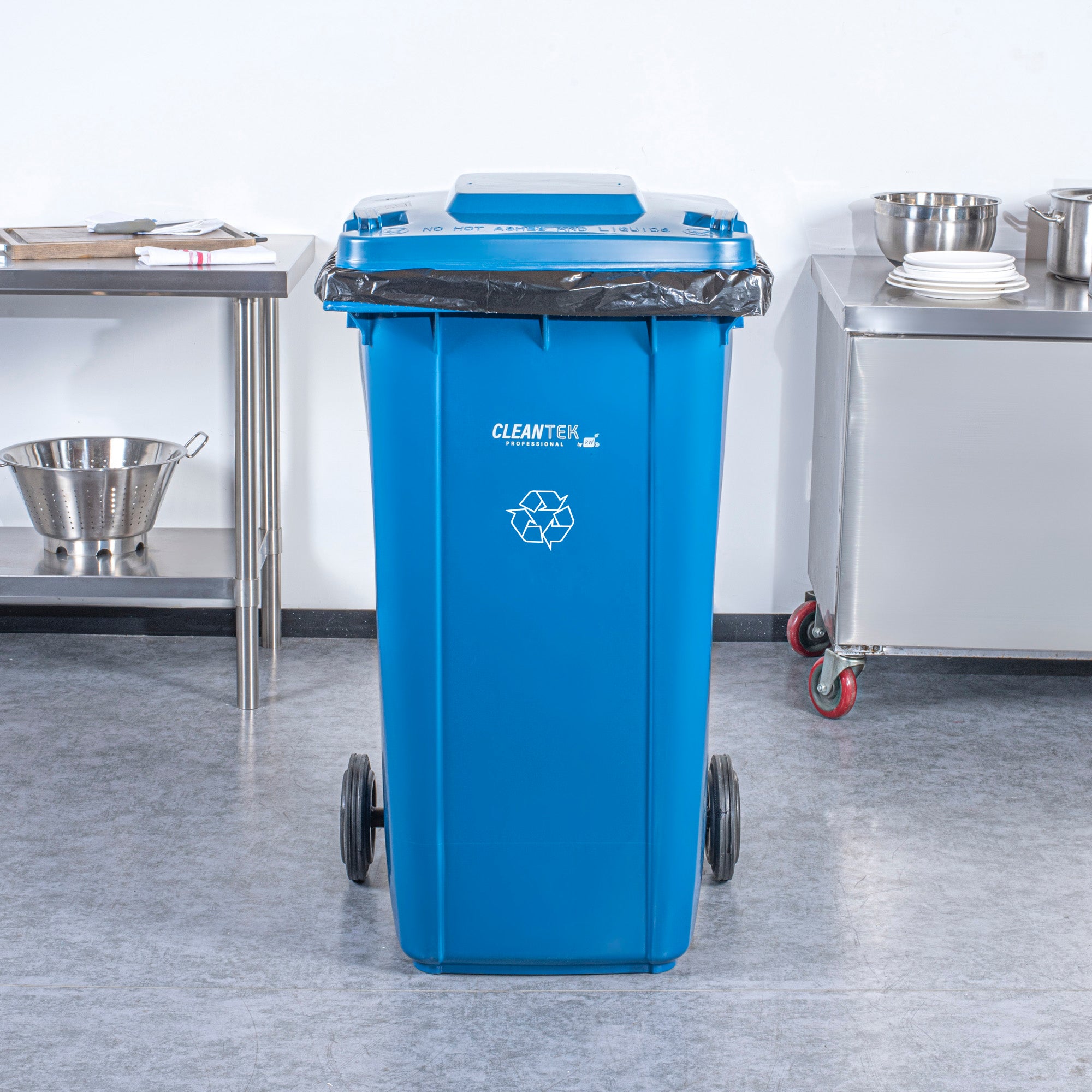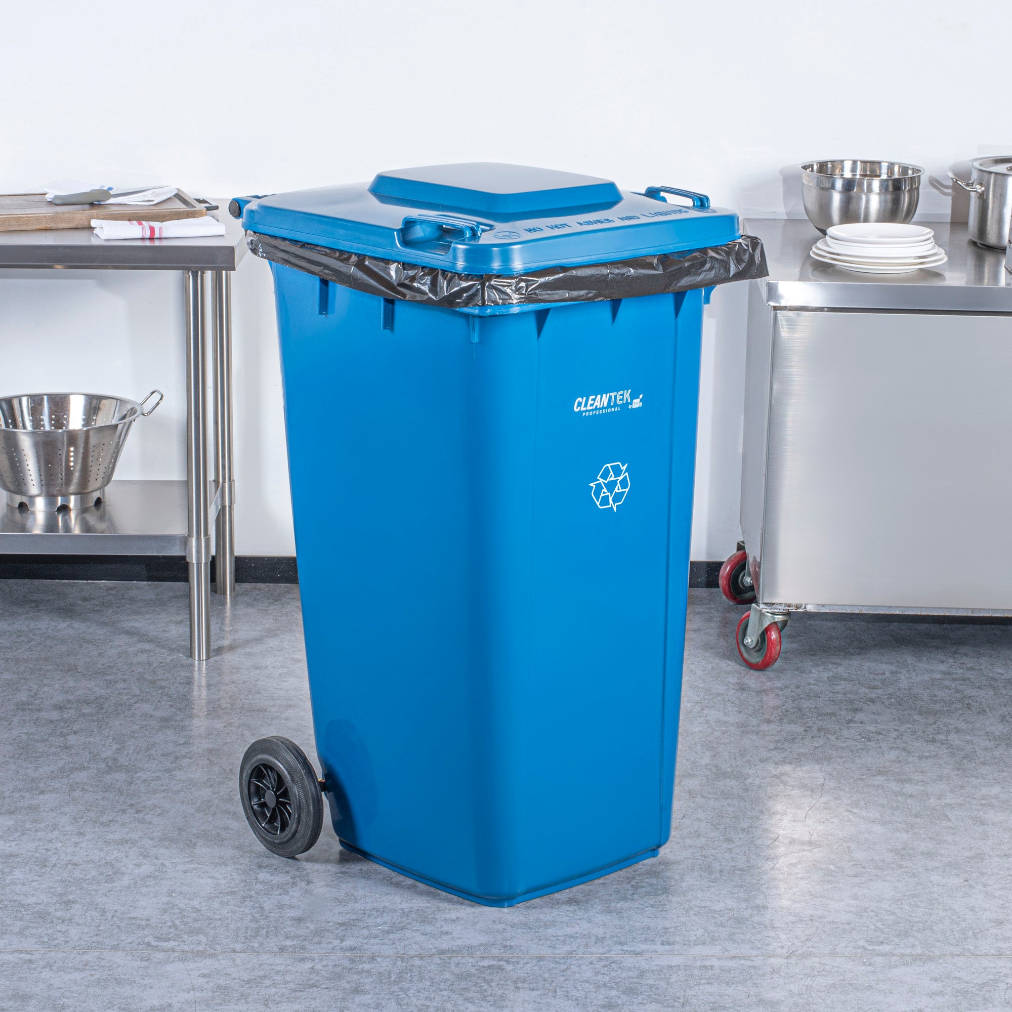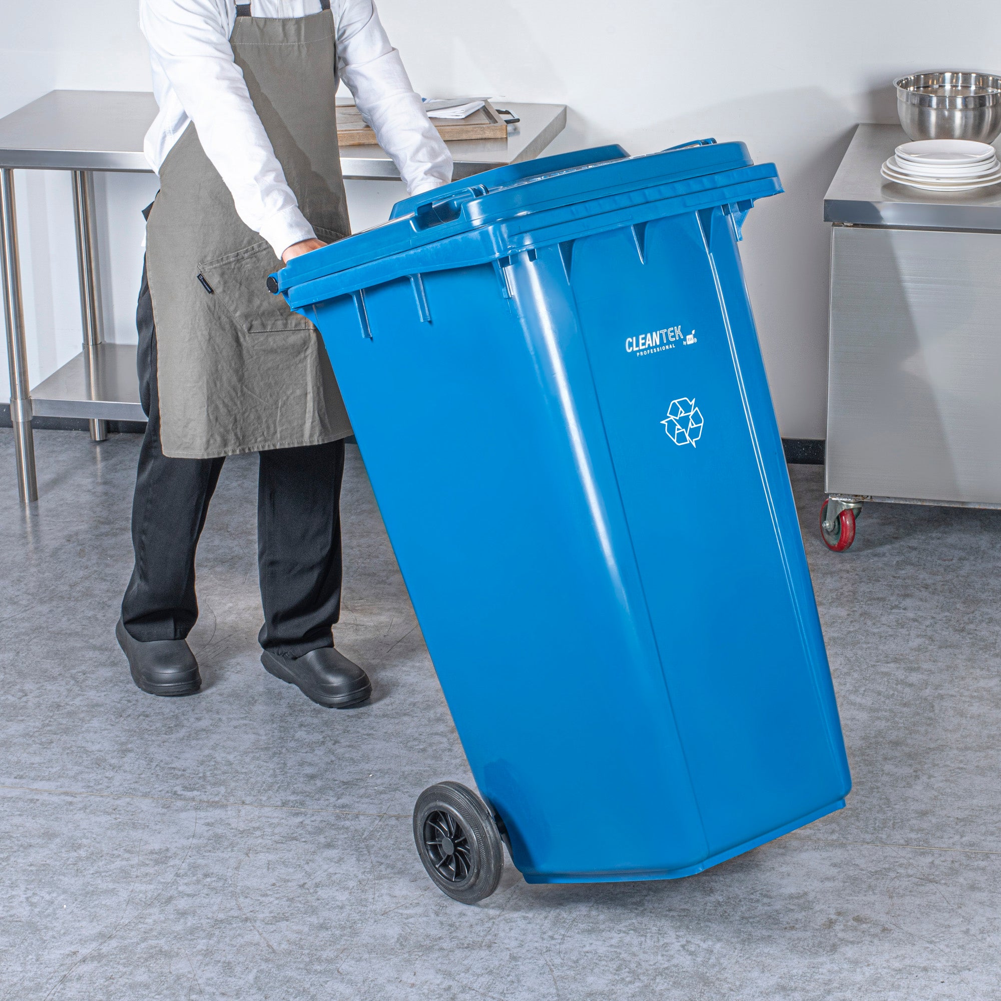 Ensure a cleaner, more efficient workspace with our Clean Tek Professional 64-gallon Rectangle Blue Plastic Wheeled Recycling Bin. This trash can with wheels comes with a hinged lid to help contain odors and maintain a tidy appearance, ensuring that waste is kept out of sight and enhancing cleanliness in any space. Pair this rolling trash bin with the compatible step-on attachment (SKU: RWT2029S) for hands-free operation, making waste disposal effortless and hygienic. Equipped with heavy-duty wheels, this rolling garbage can can easily be maneuvered across various surfaces, providing convenience during transportation and disposal. The ergonomic molded-in handle of this plastic bin provides a comfortable grip and effortless maneuverability, ensuring reliable steering and enhanced control for both pushing and pulling. Made from premium plastic, this outdoor trash can is durable and withstands heavy-duty use at your foodservice establishment. Boasting a 64-gallon capacity, this garbage can with wheels is perfect for high-volume waste disposal, making it ideal for busy environments where frequent emptying is not feasible. The bright blue coloring and universal "recycling" symbol help promote proper waste disposal and encourage recycling efforts. Measuring 28.54 inches in length by 23.03 inches in width by 42.91 inches in height, this trash bin with wheels can hold up to 64 gallons. Sold in a 1 count box. Step-on attachment is available and sold separately.