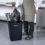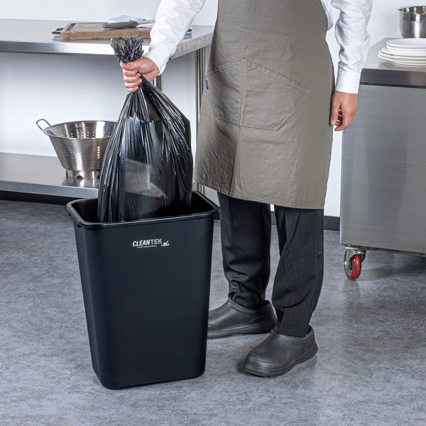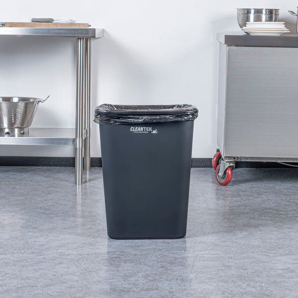 Optimize tight kitchen spaces with the Clean Tek Professional Space-Saving 7 Quart Wastebasket. This compact 7 quart wastebasket is expertly designed to fit seamlessly into narrow areas, ensuring efficient waste management without compromising on capacity. Its sleek, black plastic bin finish not only provides a professional appearance but also conceals dirt, maintaining a tidy look in any setting. Constructed from premium plastic, this small trash can is built to endure heavy-duty use, making it perfect for demanding foodservice environments. The rectangular shape allows for optimal space utilization, fitting neatly against walls or under counters, which is ideal for bustling kitchen operations. Whether used for under-counter waste collection or discreet restroom disposal, this wastebasket is a versatile solution that enhances cleanliness and organization. Each order includes 1 Clean Tek Professional Space-Saving 7 Quart Wastebasket.