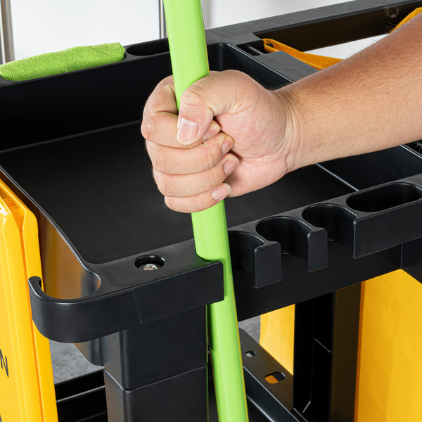 Equipped with a mop and broom holder, this janitor trolley keeps cleaning tools securely in place for quick and convenient access. The smooth rolling wheels provides enhanced mobility.