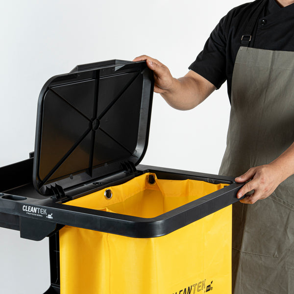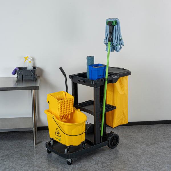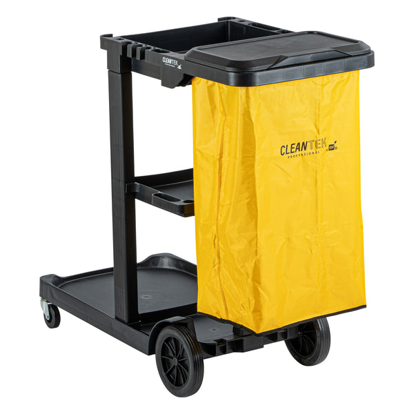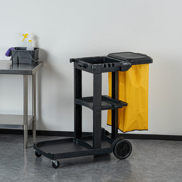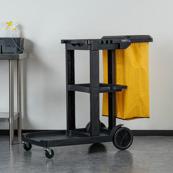Optimize your cleaning tasks with our Clean Tek Professional Black 3-Shelf Janitor Cart. Equipped with a rugged 18-gallon bag, this janitor cart provides ample space for waste or laundry collection and can be easily removed for emptying. Featuring a lid, this cleaning trolley helps hide soiled linens and reduce odors. With 3 sturdy shelves, this cleaning cart offers ample storage space for cleaning supplies and equipment, ensuring you stay organized. The mop and broom holder of this cleaning cart on wheels keeps cleaning tools securely in place, providing easy access while you work. The spacious front platform on this janitor trolley can hold an additional trash can, mop bucket, or wringer. This black janitor cart is equipped with 4 non-marking casters and enhances mobility without damaging hard floors. The retaining lip of this 3-shelf janitor cart ensures your items stay securely in place. Measuring 44.09 inches in length by 18.5 inches in width by 38.98 inches in height, this heavy-duty janitor cart fits perfectly in various storage areas. Sold in a box with 1 janitor cart, 1 bag, and 1 lid.