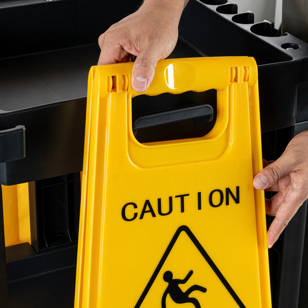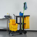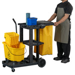 - 3-tiered shelves provide room for organizing and storing cleaning supplies and equipment