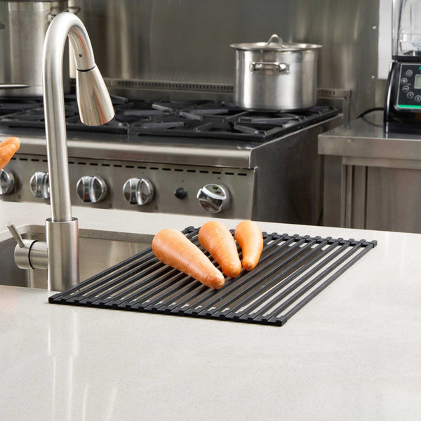 Maximize your kitchen efficiency with a space-saving solution. The Clean Tek Professional Black Steel Over-Sink Roll-Up Drying Rack features a roll-up design that saves precious counter space, ideal for busy kitchens. Constructed from black steel, this foldable dish rack includes 18 flat pipes, providing stable drying for various cookware, perfect for any over the sink rack setup. With its dishwasher-safe feature, this collapsible drying rack ensures quick, sanitary cleaning, making it an indispensable kitchen tool. Heat resistant up to 392F, it safely holds hot pots and pans, while the non-slip food-safe silicone grips keep items secure. Elevate your kitchen's functionality with this versatile tool that supports both hot and cold food tasks seamlessly. Measuring 20.47 x 12.99 x 0.32 inches, its foldable construction allows for easy storage. Each order includes 1 rack.