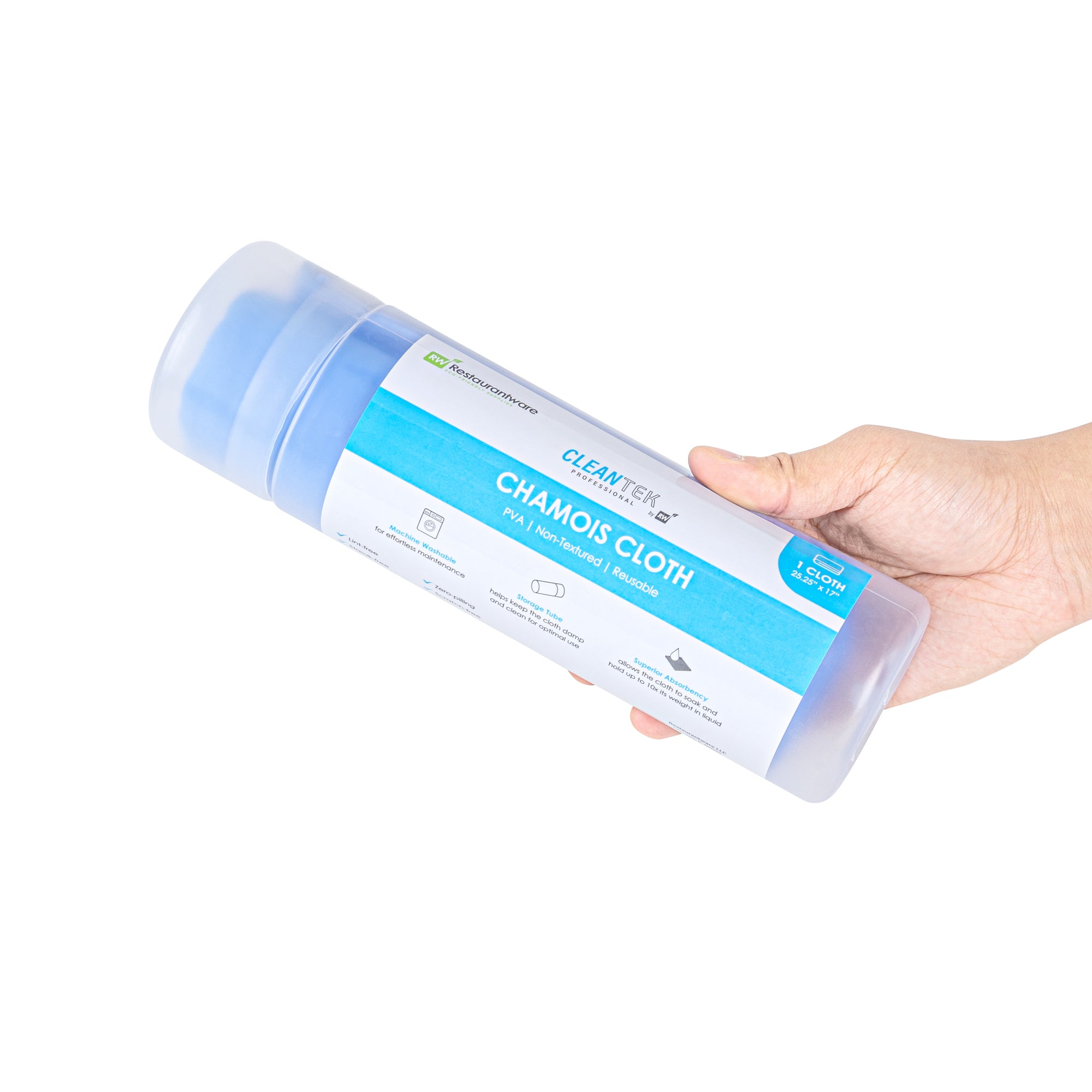 Experience unparalleled cleaning efficiency with our Clean Tek Professional Blue Chamois Cloth. Crafted from PVA microfiber, this cleaning cloth hardens when it dries, preventing bacteria growth and ensuring long-lasting use This microfiber rag is highly-absorbent to tackle spills and messes effectively. Ideal for a range of cleaning tasks, this wiping rag is multipurpose and can be used for various household or professional cleaning applications. This cleaning rag comes with a storage tube to keep the cloth damp and clean. Boasting a lint-free fabric, this chamois cloth ensures a spotless finish on any surface. The zero-pilling design of this dusting rag minimizes the formation of fuzzy balls for increased longevity and durability. This blue cleaning cloth is scratch-free, ensuring a gentle and effective cleaning experience while safeguarding surfaces from potential scratches or damage during use. Machine washable, this multipurpose cleaning rag offers effortless maintenance and can be reused multiple times. The blue finish of this dusting rag ensures easy identification, reducing the risk of mix-ups and efficient use for various dusting tasks. Measuring 25.25 inches in length by 17 inches in width, this cleaning towel provides ample space for tackling even the largest cleaning tasks. Sold in a 1 count box.