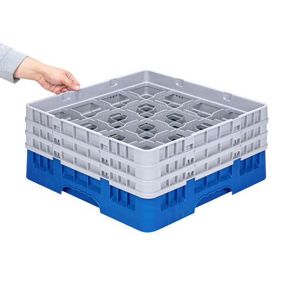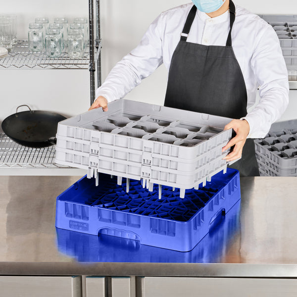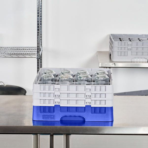 Elevate your glassware storage solutions with our Clean Tek Professional Blue Glass Rack. This dishwasher rack comes with 16 compartments, providing ample space for your glassware storage needs. Equipped with 1 full drop extender and 2 half drop extenders, this compartment rack ensures flexibility and adaptability for various glass sizes. Constructed from durable PP, this commercial glass rack ensures longevity and resilience in busy foodservice settings. Designed with an easy-to-handle feature, this barware organizer makes transportation and handling a breeze. The open interior compartments allow efficient cleaning and drying, while the solid external walls offer robust protection. Measuring 19.69 inches in length by 19.69 inches in width by 8.86 inches in height, this glassware storage rack fits seamlessly into any commercial kitchen setup. Sold in a 1 count box.