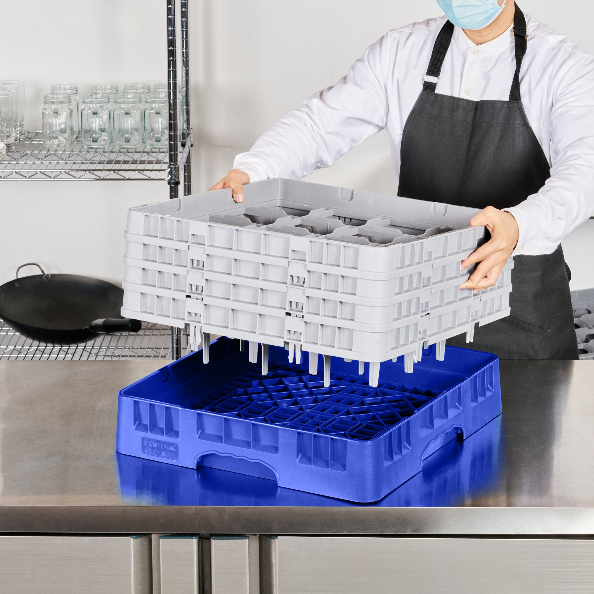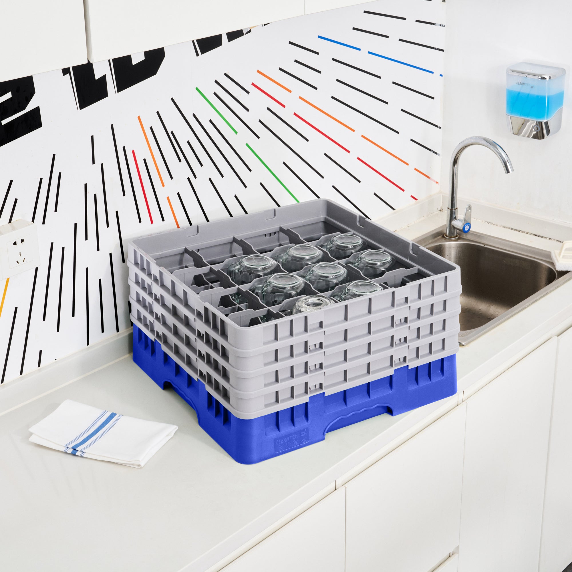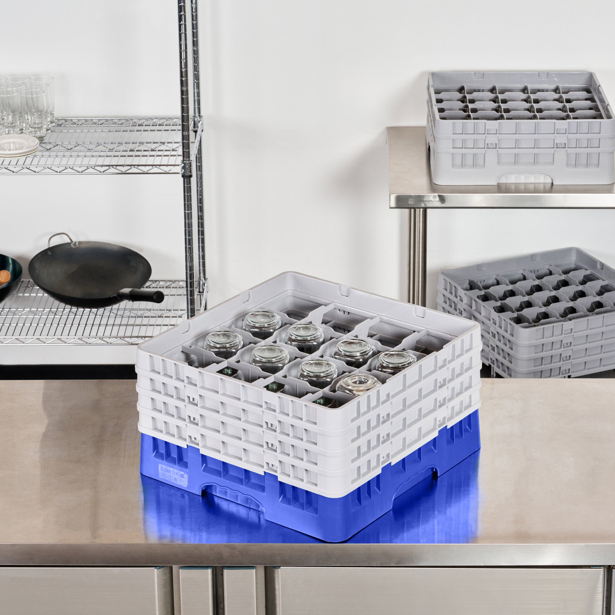 Enhance your barware organization with our Clean Tek Professional Blue Glass Rack, designed for optimal glassware storage in busy commercial settings. This glass rack features 16 open interior compartments, allowing for efficient dishwasher rack usage by accommodating a variety of glass sizes. With a full drop extender and three half drop extenders, this versatile compartment rack adapts to your changing needs, providing flexibility and convenience. Constructed from durable PP material, this commercial glass rack ensures long-lasting performance even in high-demand settings. The easy-to-handle design makes this barware organizer user-friendly, allowing staff to swiftly manage and transport glassware. Solid external walls offer enhanced protection for your glassware, minimizing the risk of breakage during handling and transport. Measuring 19.69 inches in length by 19.69 inches in width by 10.51 inches in height, this glass rack provides ample space for organized storage while fitting seamlessly into standard kitchen setups. Sold in a 1 count box.