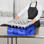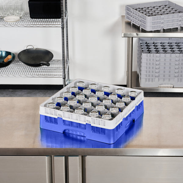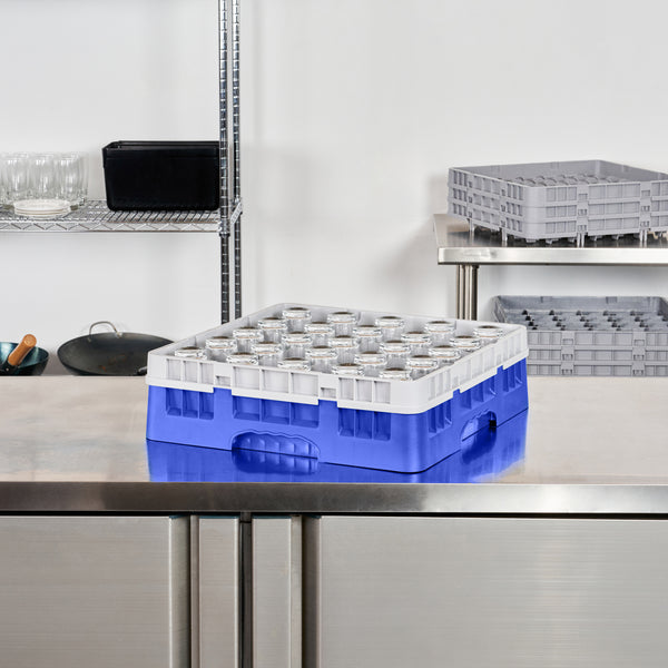 Optimize your glassware storage with our Clean Tek Professional Blue Glass Rack, designed to meet the high demands of the foodservice industry. This commercial glass rack features 25 compartments, ensuring organized and safe storage for all your glassware. Engineered with a 1 full drop extender, this dishwasher rack accommodates various glass heights effortlessly. Constructed from durable PP, this compartment rack ensures long-lasting performance and reliability. The easy-to-handle design of this barware organizer makes loading and unloading a breeze, reducing operational downtime. With open interior compartments, this glass rack promotes efficient water and air circulation, ensuring thorough cleaning and drying. Solid external walls add an extra layer of protection, shielding your glassware from potential damage during transport. Measuring 19.69 inches in length by 19.69 inches in width by 5.63 inches in height, this dishwasher rack offers ample space while fitting seamlessly into most commercial dishwashers. Sold in a 1 count box.