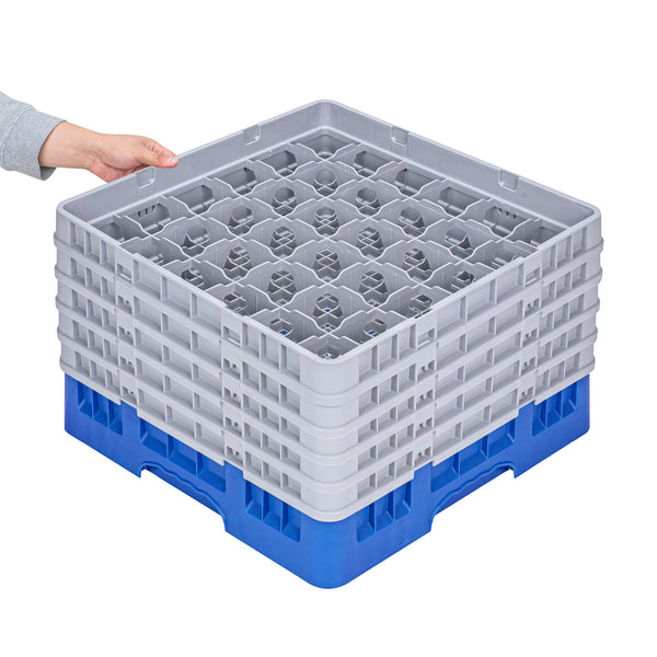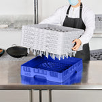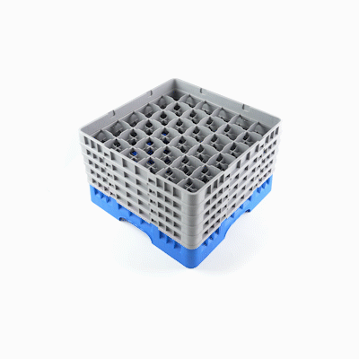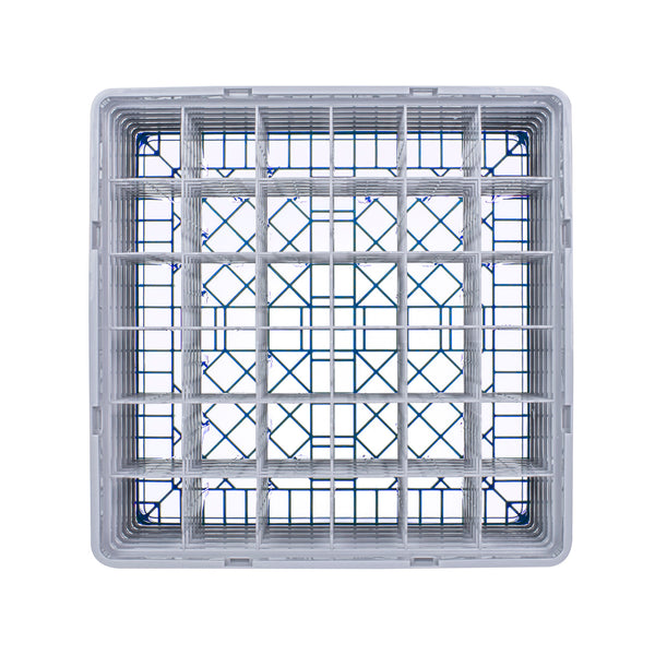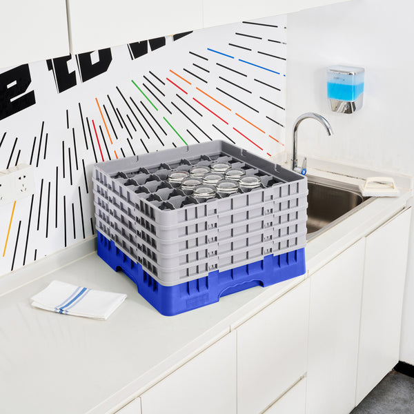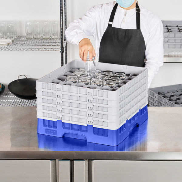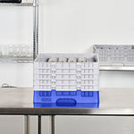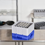 Efficiently organize and protect your glassware with our Clean Tek Professional Blue Glass Rack. Featuring 36 compartments, this dishwasher rack ensures each piece of glassware stays securely in place during washing. Ideal for bars and restaurants, this commercial glass rack includes one full drop extender and four half drop extenders to accommodate varying glass heights. This durable rack is made from sturdy PP material, making it a reliable choice for long-term use. With an easy-to-handle design, this barware organizer simplifies the process of transporting and storing glasses. Each compartment rack boasts open interior compartments for quick drying, while the solid external walls provide added protection. Measuring 19.69 inches in length by 19.69 inches in width by 12.13 inches in height, this glassware storage solution fits seamlessly into most commercial dishwashers. Sold in a 1 count box.