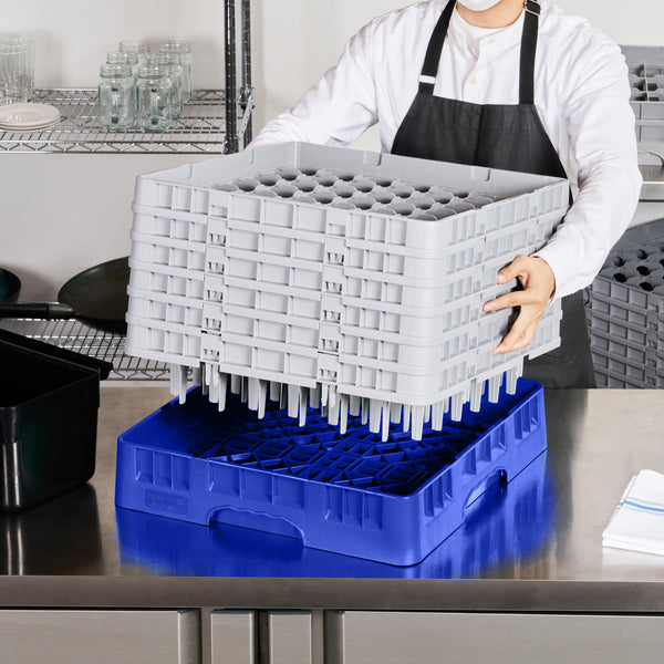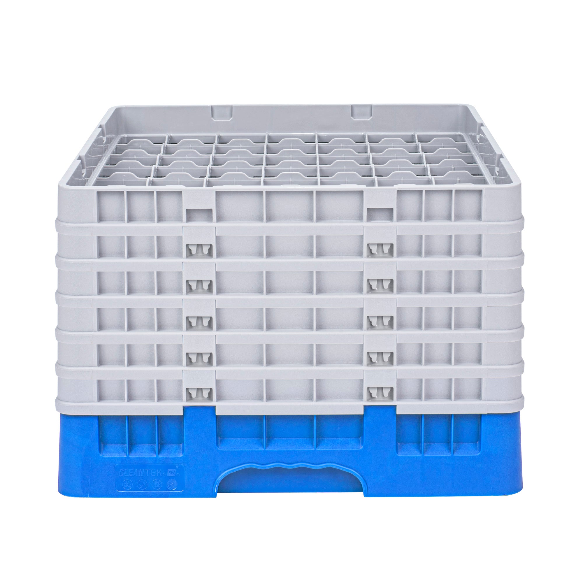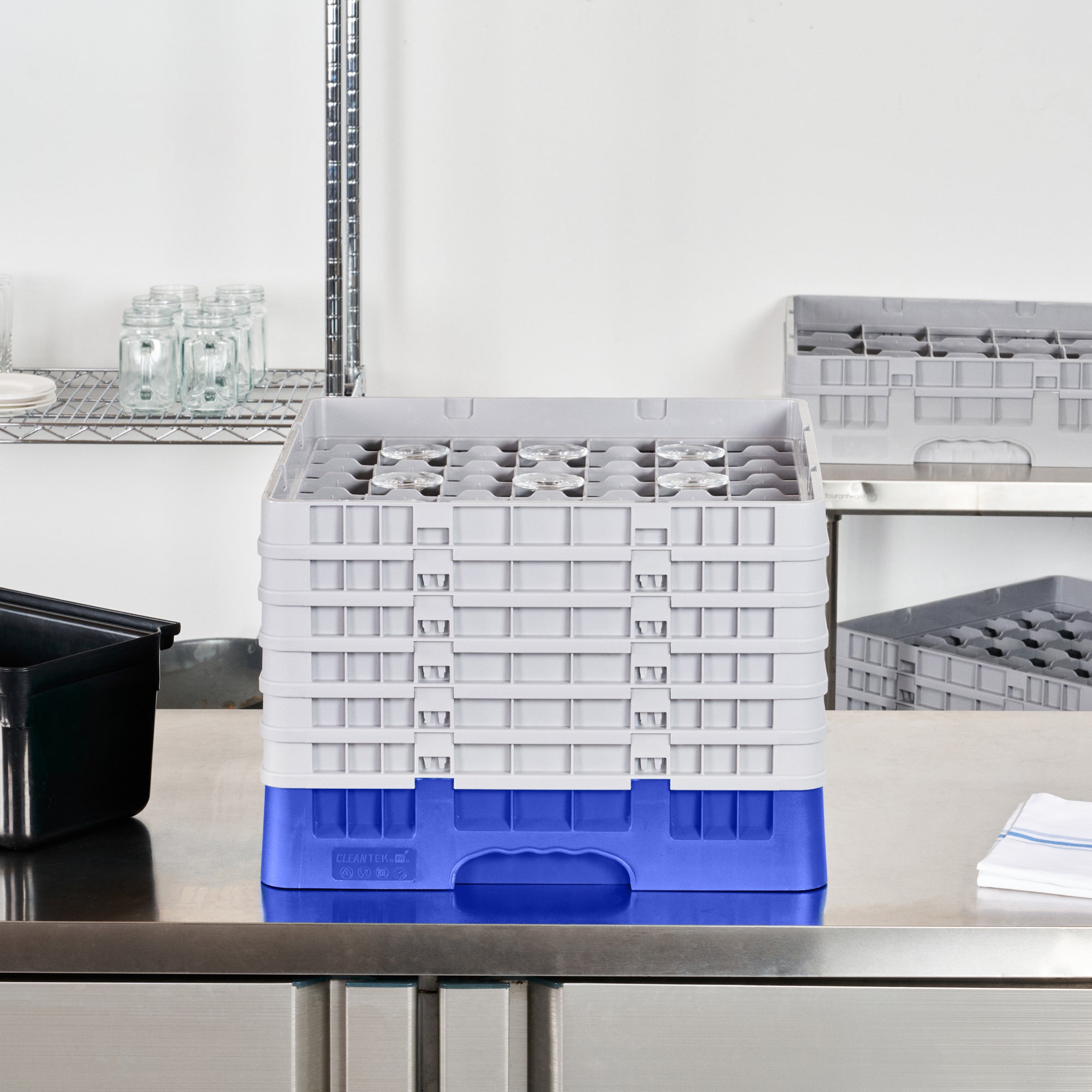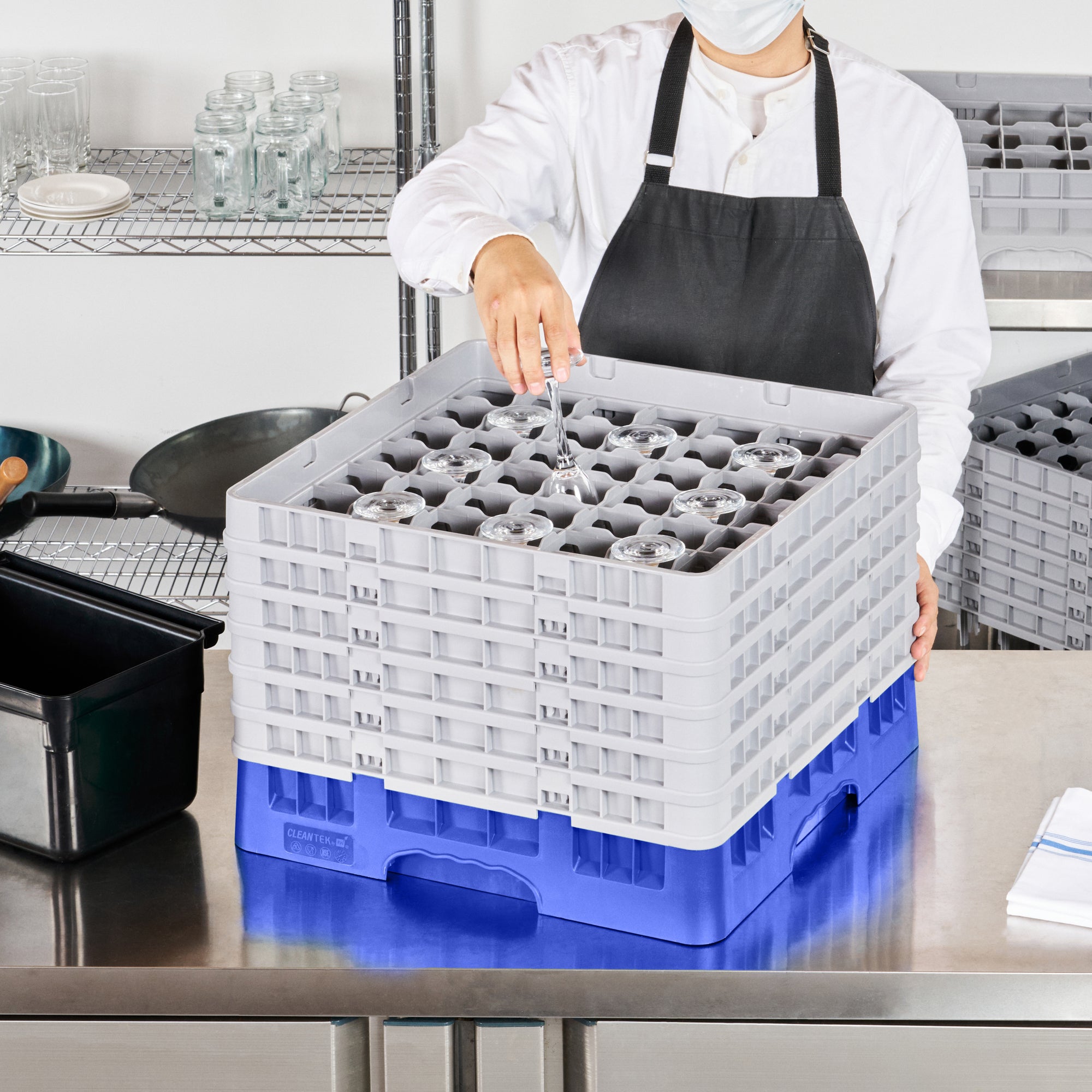 Efficiently organize and protect your glassware with our Clean Tek Professional Blue Glass Rack. Featuring 49 compartments, this commercial glass rack offers ample space for secure glassware storage. The full drop extender allows for easy stacking and accommodating taller items within the dishwasher rack. Designed with 5 half drop extenders, this compartment rack provides flexibility for various glass sizes and shapes. Made from durable PP, this barware organizer ensures long-lasting performance in busy foodservice settings. Each rack boasts an easy-to-handle design, making it simple to transport and load into dishwashers. The open interior compartments facilitate thorough cleaning, while the solid external walls maintain stability and protect your glassware. Measuring 19.69 inches in length by 19.69 inches in width by 13.74 inches in height, this glassware storage solution is perfect for any commercial kitchen or bar setup. Sold in a 1 count box.