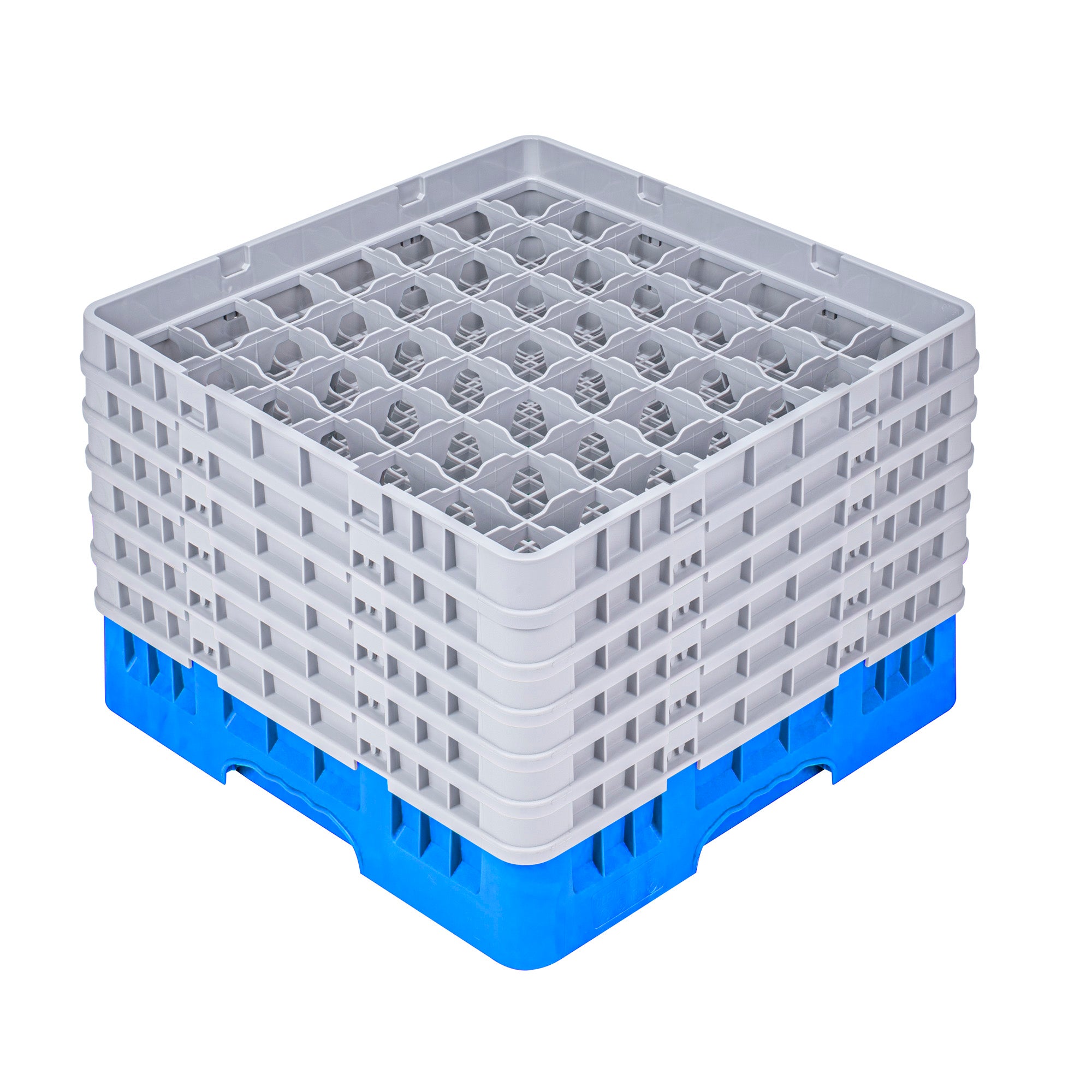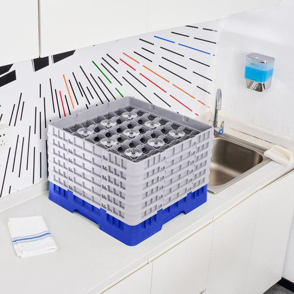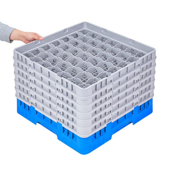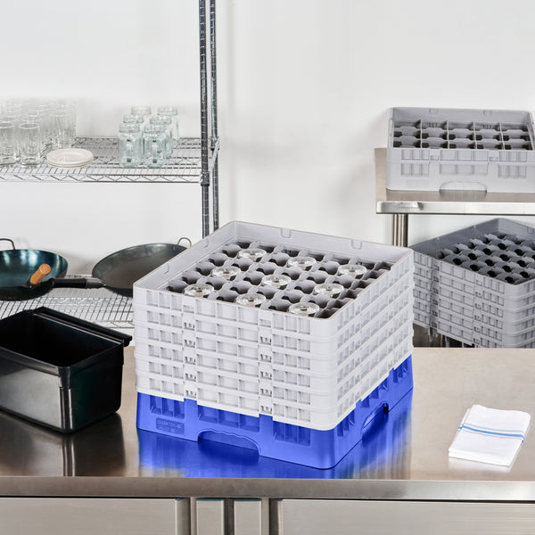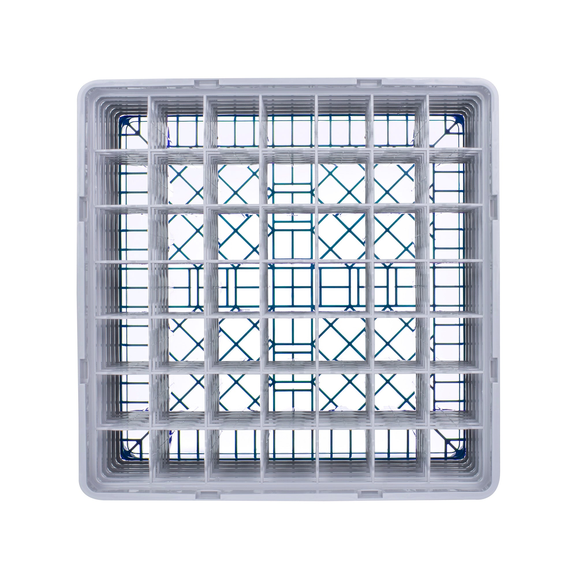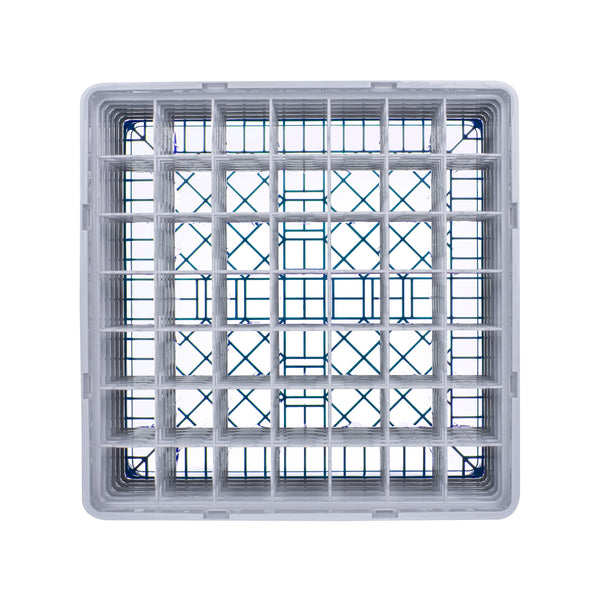 Efficiently organize and protect your glassware with our Clean Tek Professional Blue Glass Rack. Featuring 49 compartments, this commercial glass rack offers ample space for secure glassware storage. The full drop extender allows for easy stacking and accommodating taller items within the dishwasher rack. Designed with 5 half drop extenders, this compartment rack provides flexibility for various glass sizes and shapes. Made from durable PP, this barware organizer ensures long-lasting performance in busy foodservice settings. Each rack boasts an easy-to-handle design, making it simple to transport and load into dishwashers. The open interior compartments facilitate thorough cleaning, while the solid external walls maintain stability and protect your glassware. Measuring 19.69 inches in length by 19.69 inches in width by 13.74 inches in height, this glassware storage solution is perfect for any commercial kitchen or bar setup. Sold in a 1 count box.