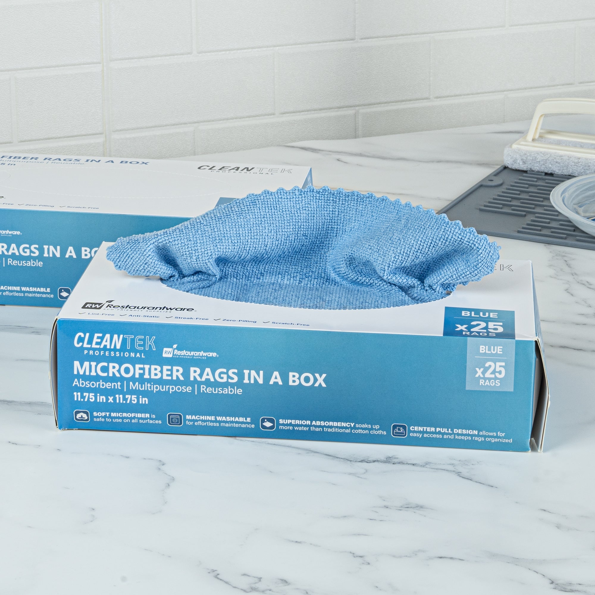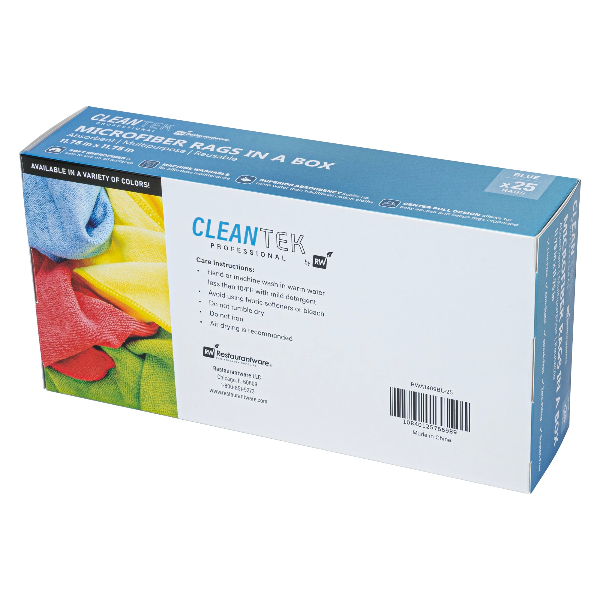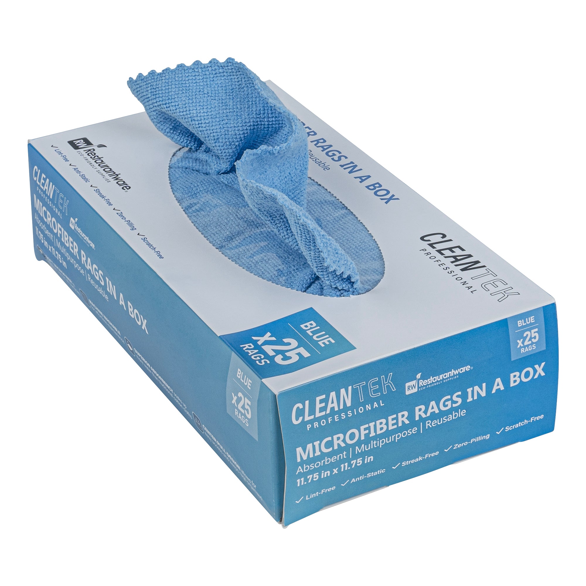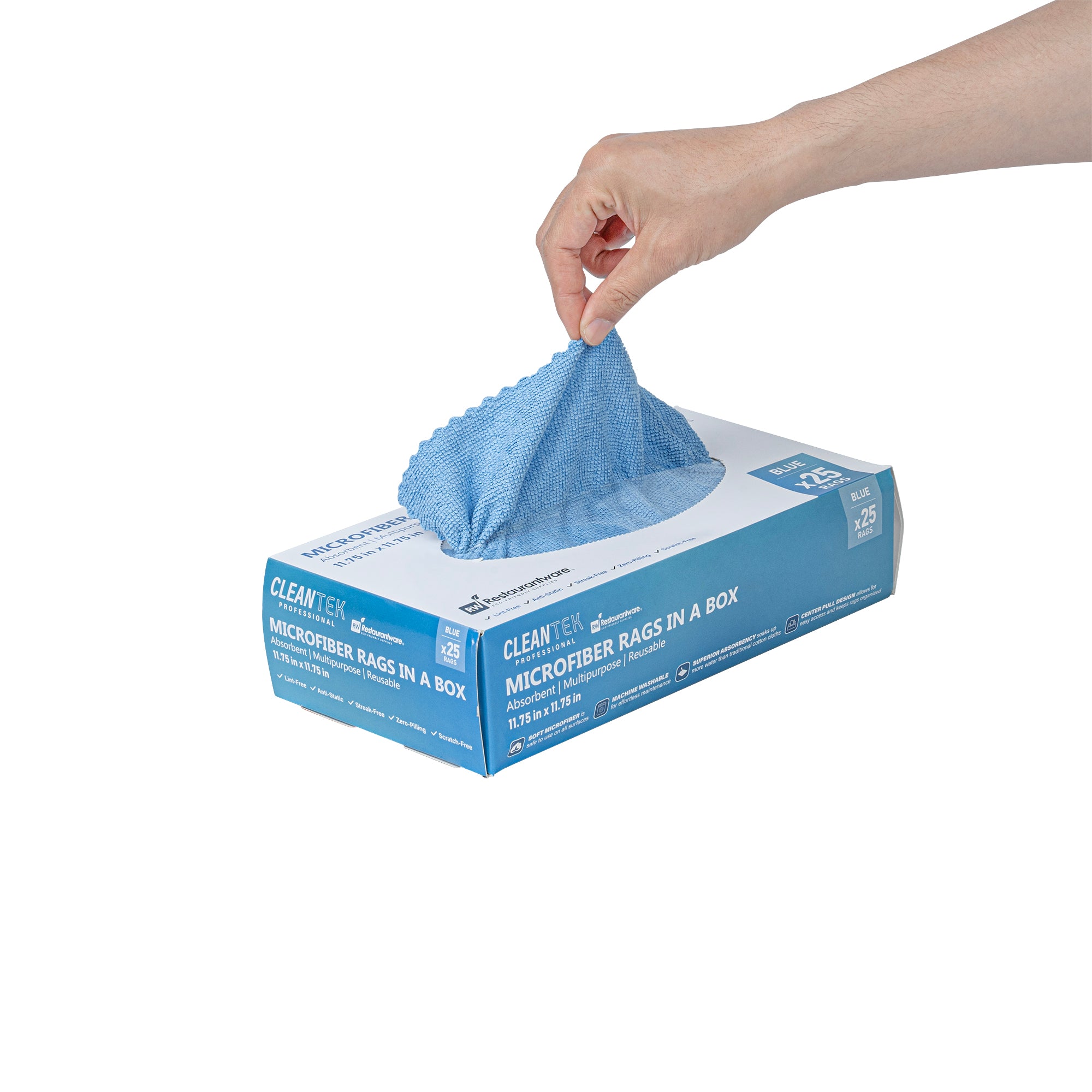 Effortlessly tackle all your cleaning tasks with our Clean Tek Professional Blue Microfiber Rags In A Box. These microfiber cloths come packaged in a dispenser box, allowing for easy dispensing and quick access, making them perfect for various cleaning tasks. Crafted from a blend of polyester and polyamide, these cleaning cloths are durable and leave no residue behind, ensuring an impeccable cleaning experience. These microfiber towels are highly absorbent and effortlessly handle spills and dry surfaces without any streaks. The versatile design of these cleaning rags makes them ideal for a wide range of tasks including dusting, wiping surfaces, polishing, and absorbing spills. Featuring seamless wavy edges, these microfiber cleaning cloths provide scratch-free cleaning for delicate surfaces, achieving an excellent finish. The blue finish of these glass cleaning cloths facilitates easy identification, minimizing mix-up risks and ensuring efficient use. Measuring 11.81 inches in length by 11.81 inches in width, these microfiber rags offer ample coverage for all your cleaning needs. Each order includes 25 rags.