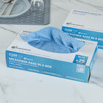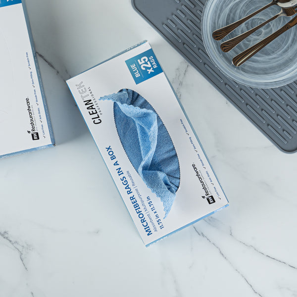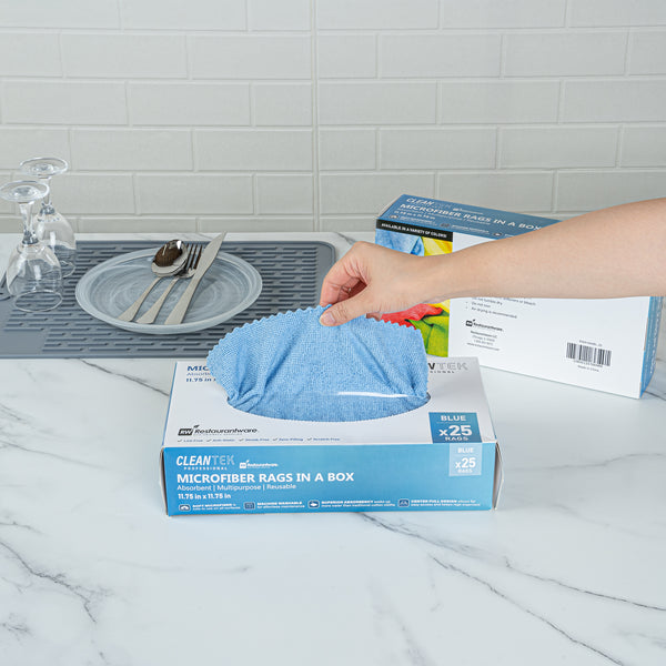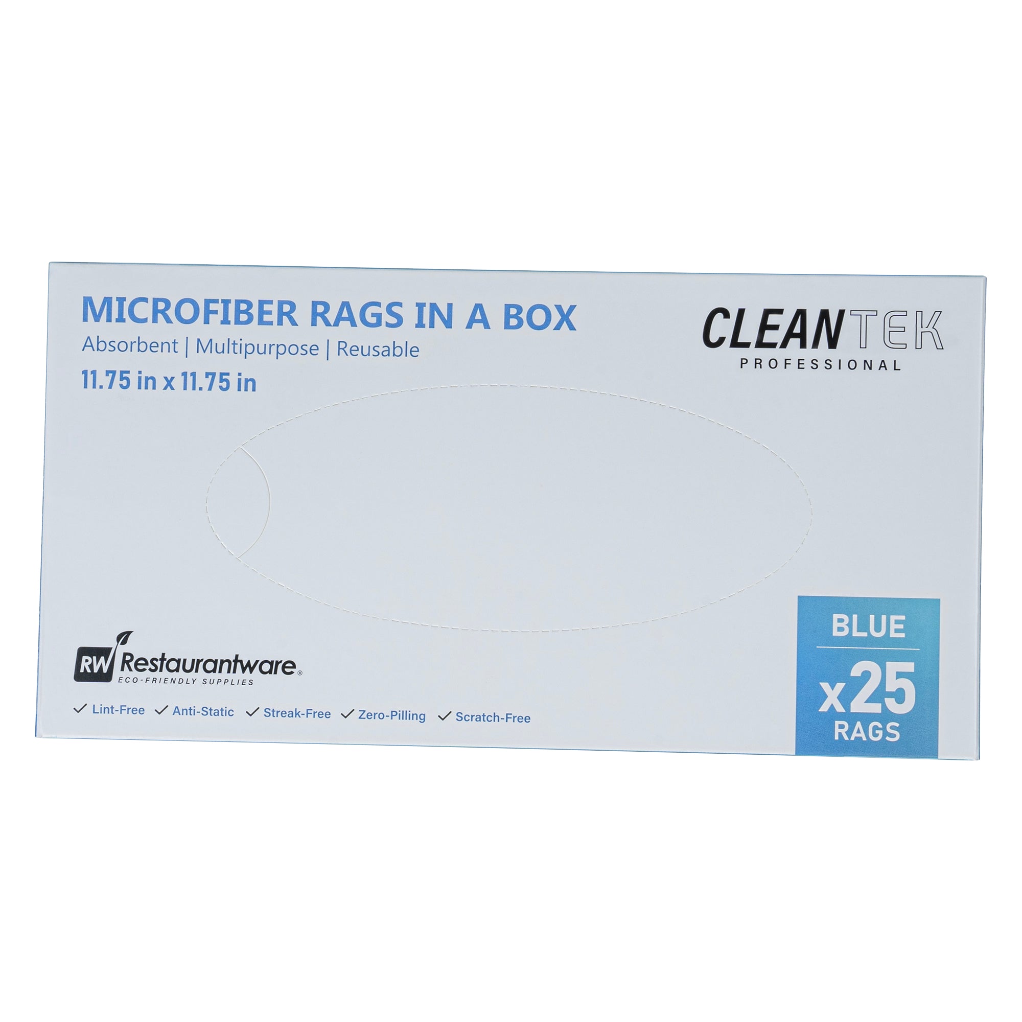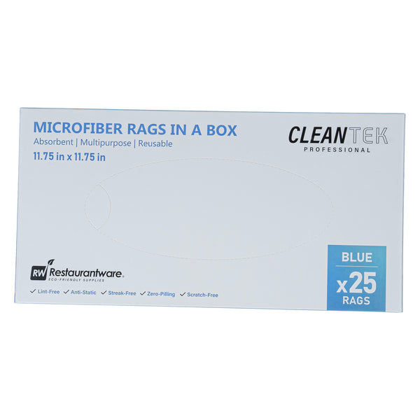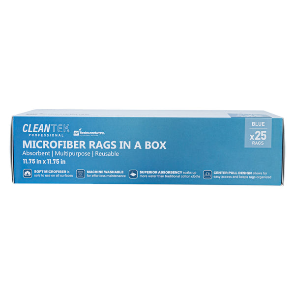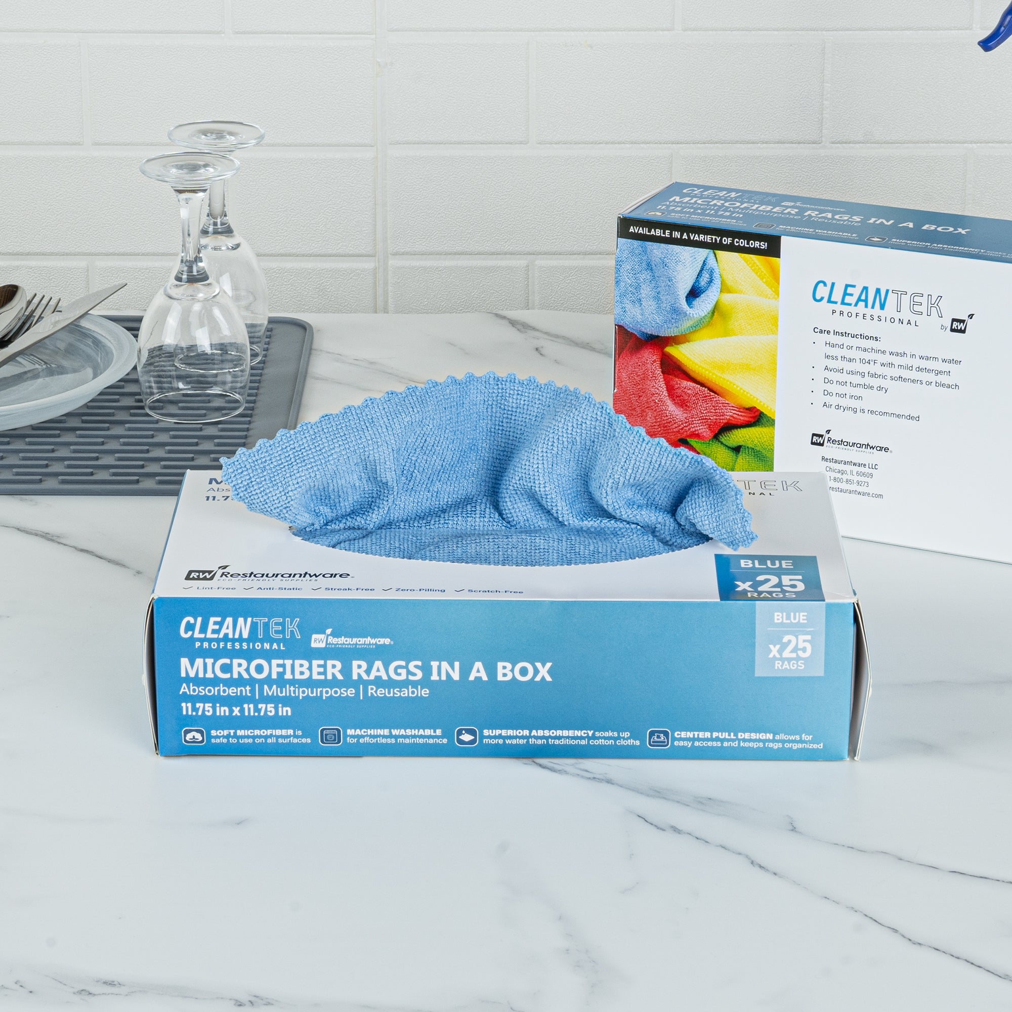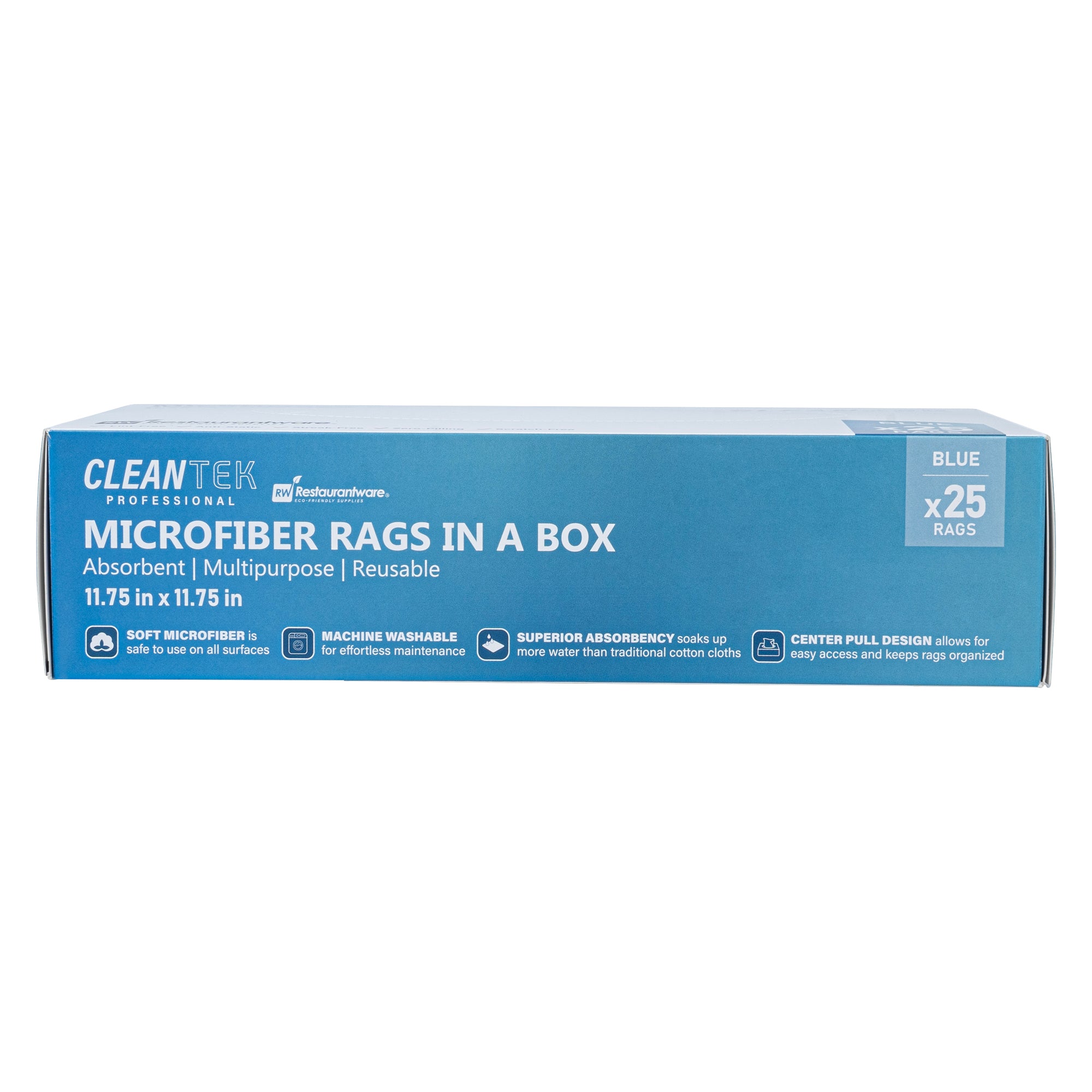 Effortlessly tackle all your cleaning tasks with our Clean Tek Professional Blue Microfiber Rags In A Box. These microfiber cloths come packaged in a dispenser box, allowing for easy dispensing and quick access, making them perfect for various cleaning tasks. Crafted from a blend of polyester and polyamide, these cleaning cloths are durable and leave no residue behind, ensuring an impeccable cleaning experience. These microfiber towels are highly absorbent and effortlessly handle spills and dry surfaces without any streaks. The versatile design of these cleaning rags makes them ideal for a wide range of tasks including dusting, wiping surfaces, polishing, and absorbing spills. Featuring seamless wavy edges, these microfiber cleaning cloths provide scratch-free cleaning for delicate surfaces, achieving an excellent finish. The blue finish of these glass cleaning cloths facilitates easy identification, minimizing mix-up risks and ensuring efficient use. Measuring 11.81 inches in length by 11.81 inches in width, these microfiber rags offer ample coverage for all your cleaning needs. Each order includes 25 rags.