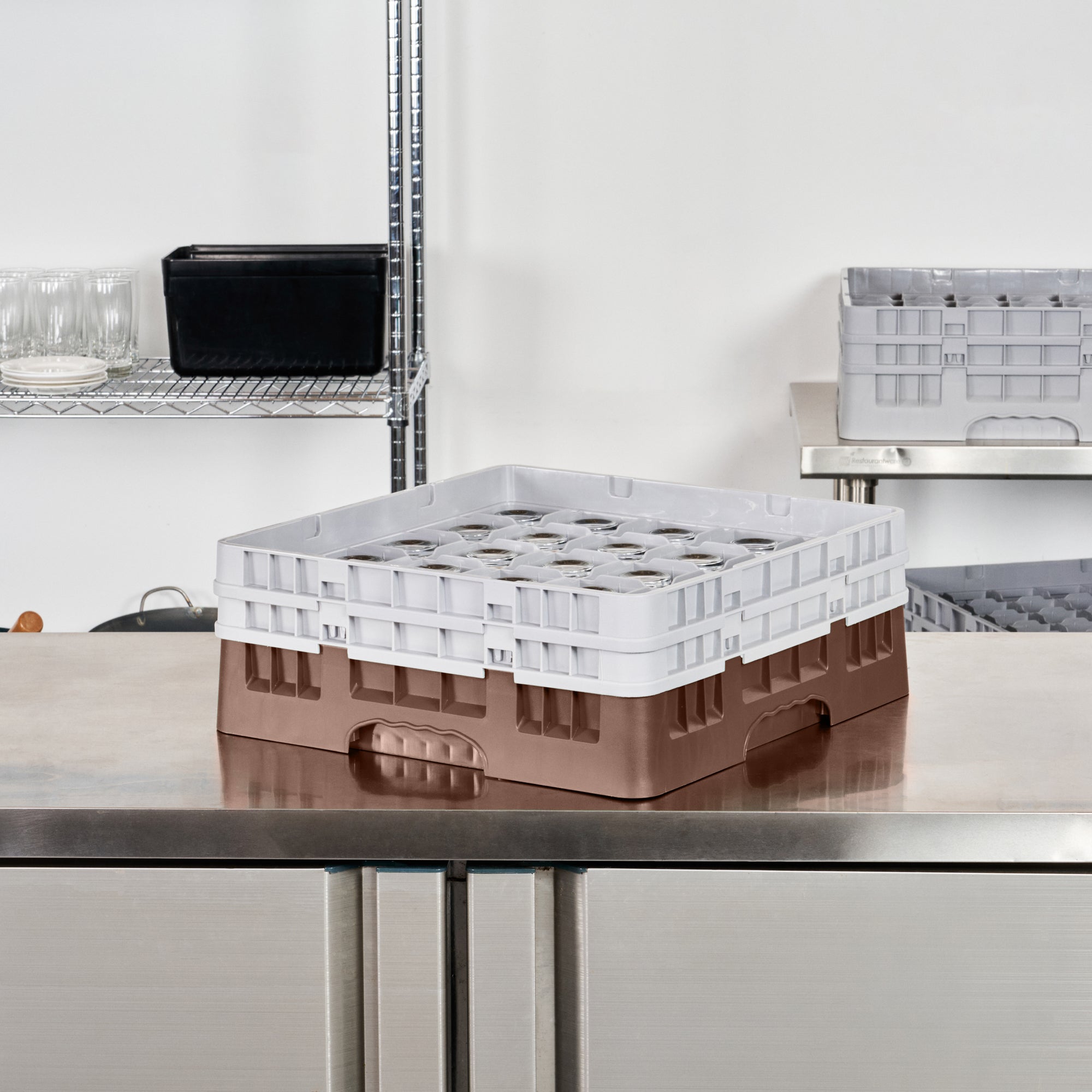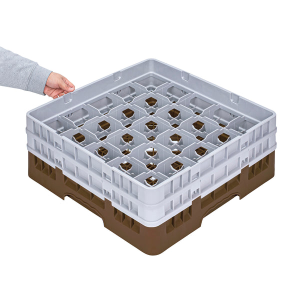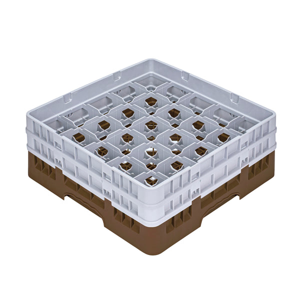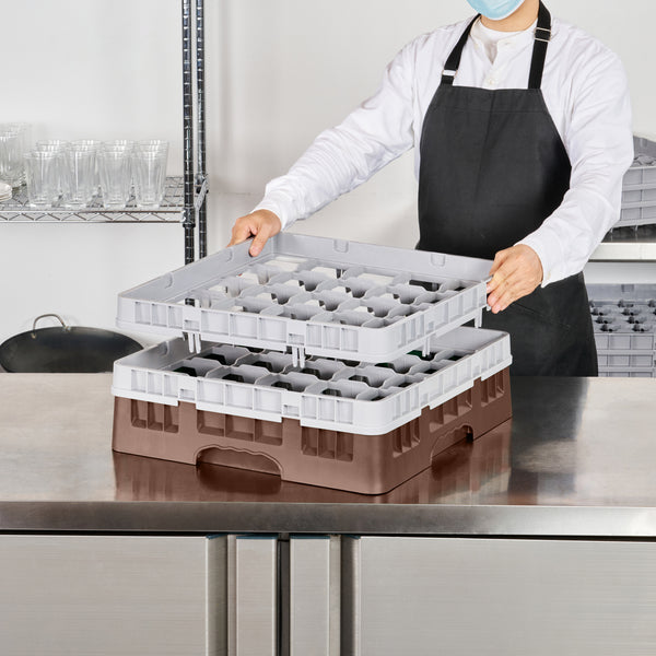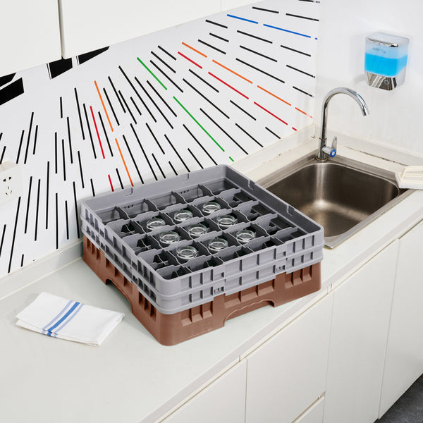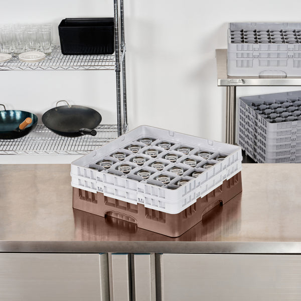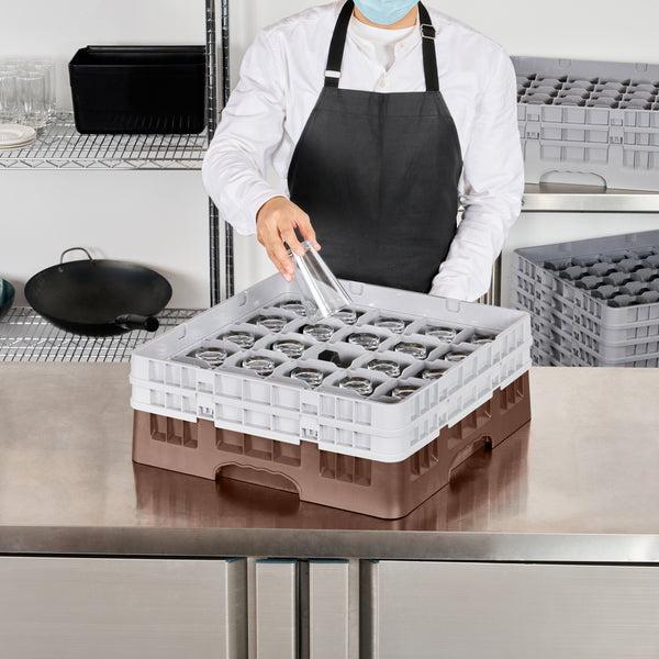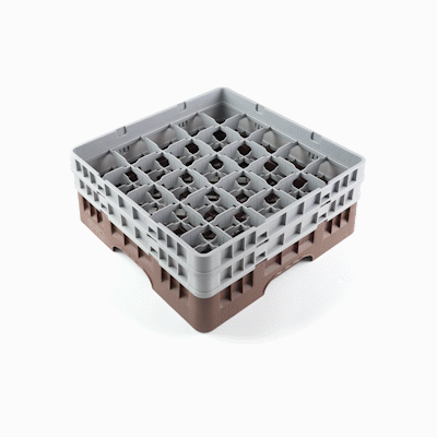 Ensure pristine glassware storage with our Clean Tek Professional Brown Glass Rack. This commercial glass rack boasts 25 compartments, offering ample space for organizing barware efficiently. Constructed from durable PP, this dishwasher rack withstands the demands of the foodservice industry. For added convenience, this compartment rack includes 1 full drop extender and 1 half drop extender, accommodating various glass sizes. Featuring an easy-to-handle design, this glass rack simplifies the process of loading and unloading glassware. The open interior compartments of this barware organizer allow for superior water circulation and faster drying times. Meanwhile, the solid external walls enhance stability and protect glassware from external impacts. Measuring 19.69 inches in length by 19.69 inches in width by 7.24 inches in height, this rack offers a perfect fit for any commercial dishwasher. Sold in a 1 count box.