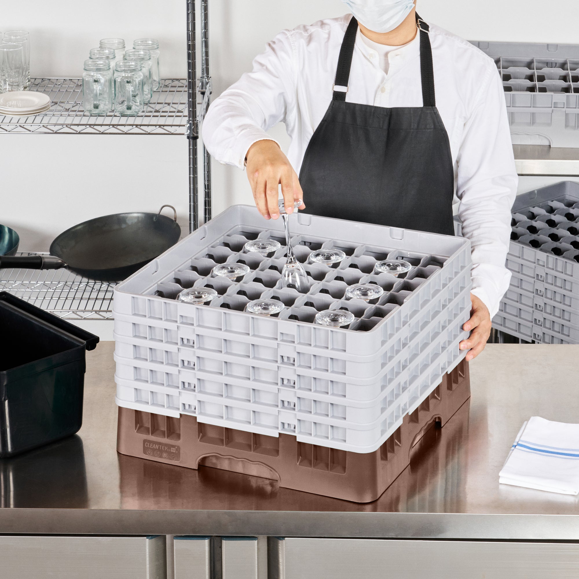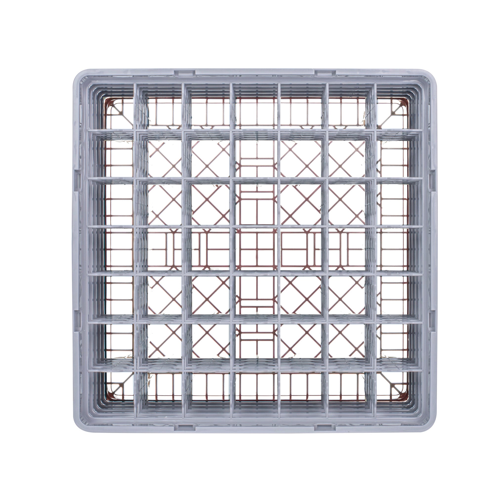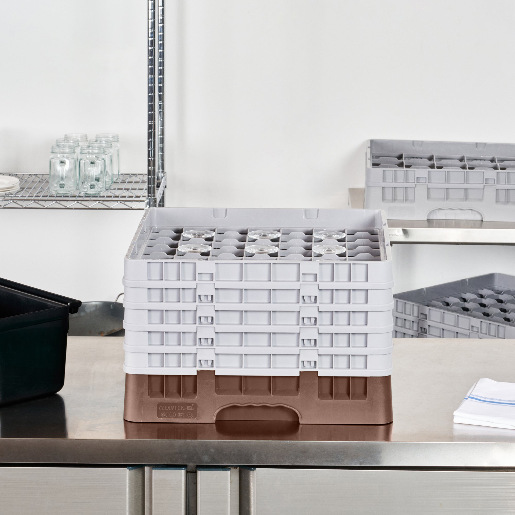 Optimize your glassware storage with our Clean Tek Professional Brown Glass Rack. Equipped with 49 compartments, this dishwasher rack ensures each glass remains securely in place during wash cycles. This compartment rack includes 1 full drop extender and 4 half drop extenders, providing versatile options to accommodate various glass sizes. Designed for durability, this commercial glass rack is constructed from sturdy PP material, making it perfect for busy foodservice settings. The easy-to-handle design of this barware organizer allows for effortless loading and unloading. Open interior compartments offer excellent water and air circulation, ensuring thorough cleaning and quick drying of glassware. Featuring solid external walls, this glass rack adds an extra layer of protection for your valuable barware. Measuring 19.69 inches in length by 19.69 inches in width by 12.13 inches in height, this rack offers ample space while fitting perfectly in standard commercial dishwashers. Sold in a 1 count box.