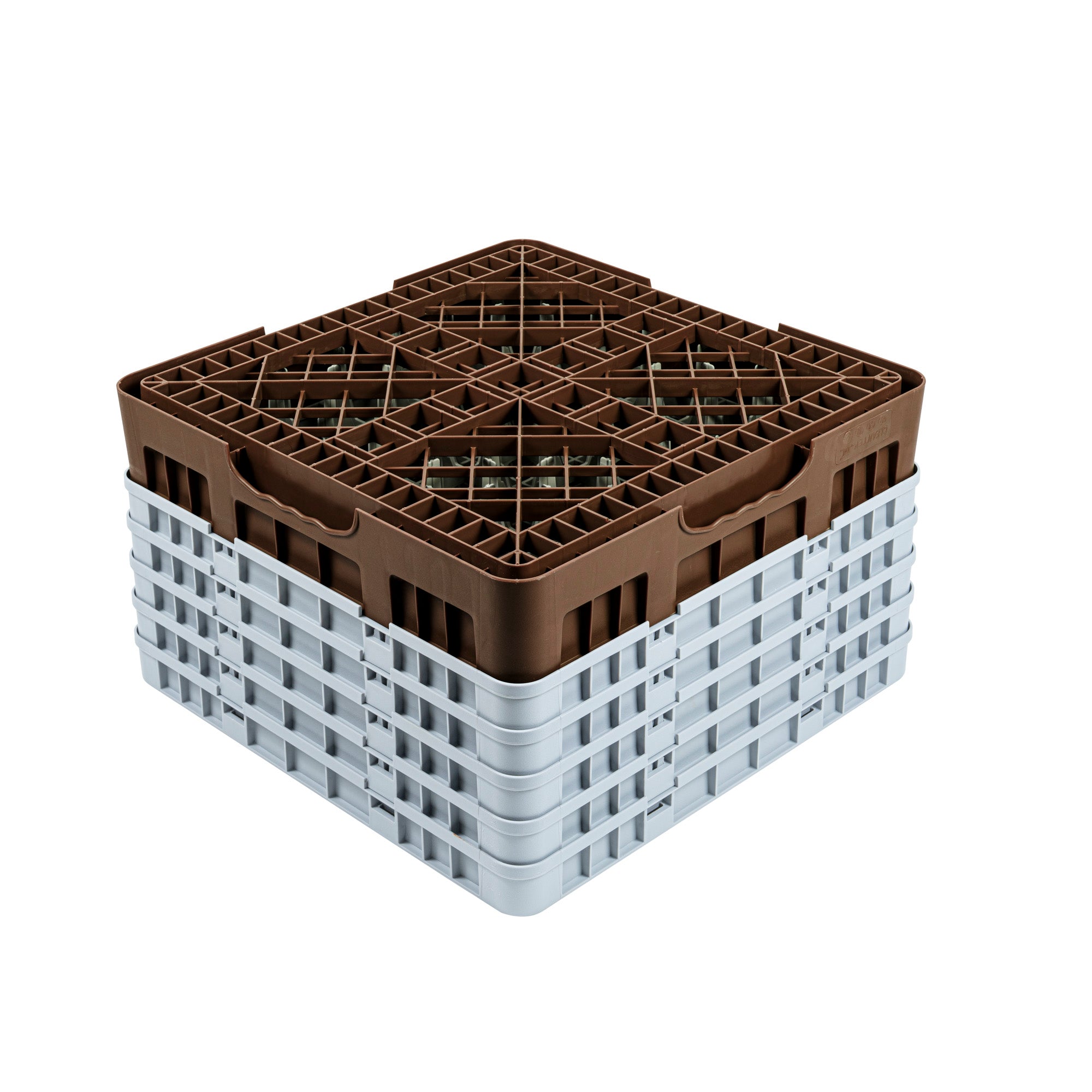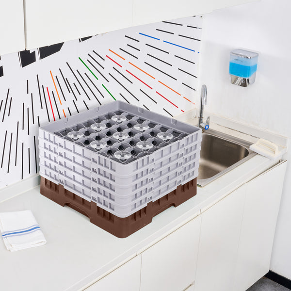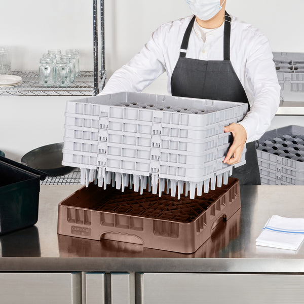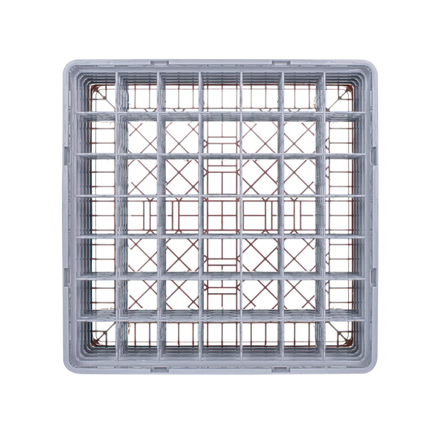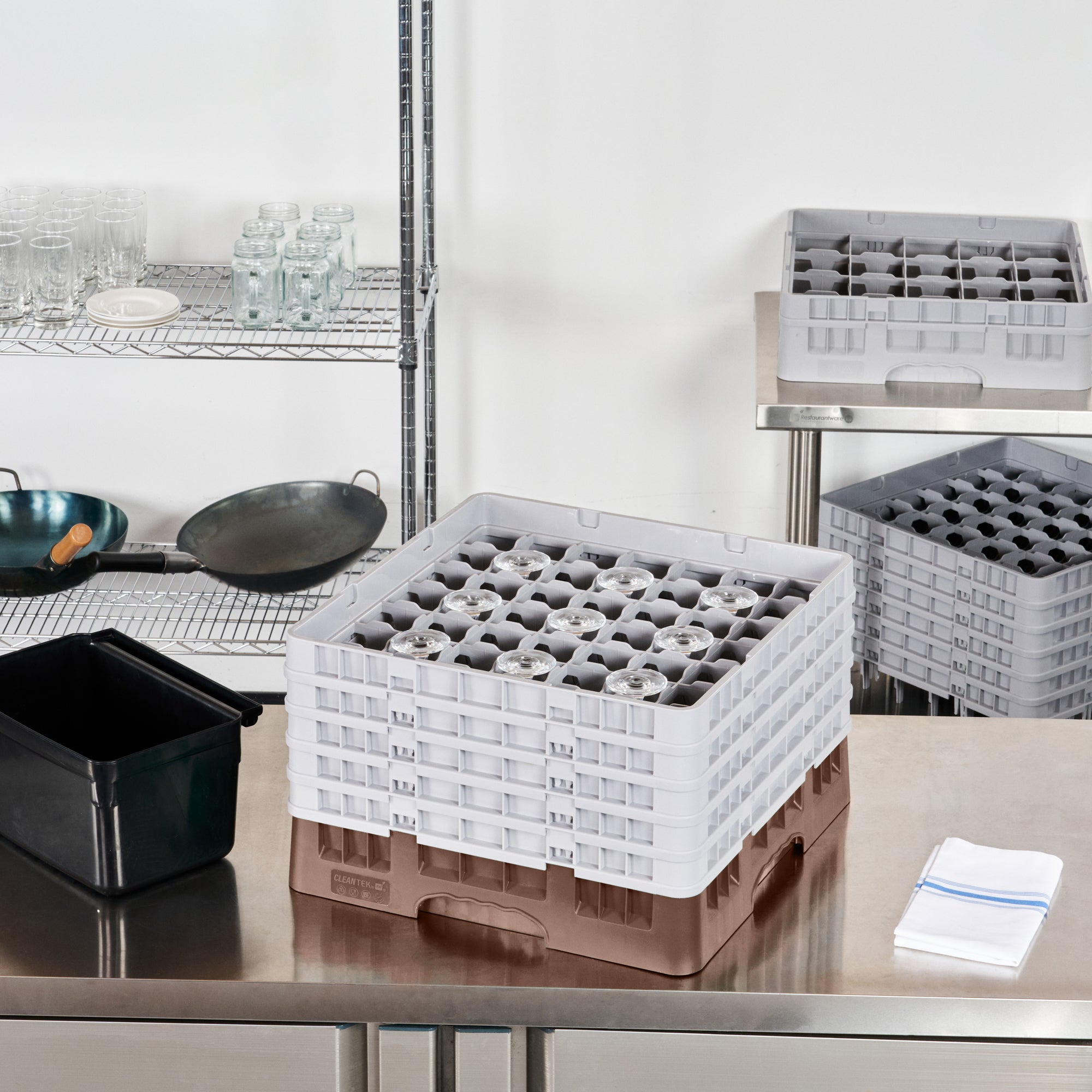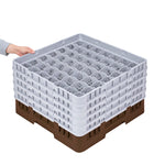 Optimize your glassware storage with our Clean Tek Professional Brown Glass Rack. Equipped with 49 compartments, this dishwasher rack ensures each glass remains securely in place during wash cycles. This compartment rack includes 1 full drop extender and 4 half drop extenders, providing versatile options to accommodate various glass sizes. Designed for durability, this commercial glass rack is constructed from sturdy PP material, making it perfect for busy foodservice settings. The easy-to-handle design of this barware organizer allows for effortless loading and unloading. Open interior compartments offer excellent water and air circulation, ensuring thorough cleaning and quick drying of glassware. Featuring solid external walls, this glass rack adds an extra layer of protection for your valuable barware. Measuring 19.69 inches in length by 19.69 inches in width by 12.13 inches in height, this rack offers ample space while fitting perfectly in standard commercial dishwashers. Sold in a 1 count box.