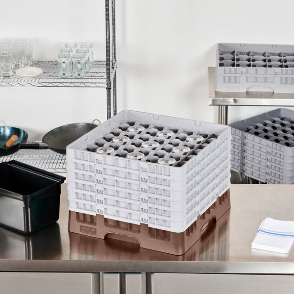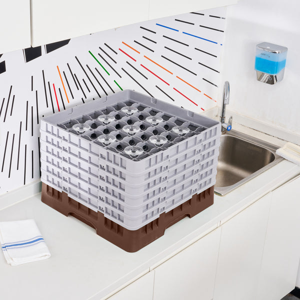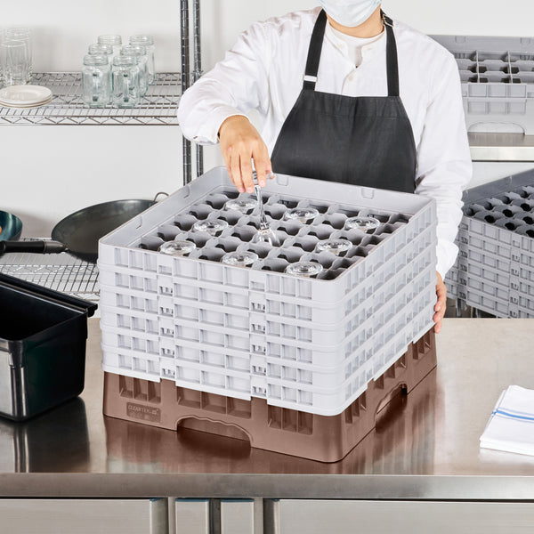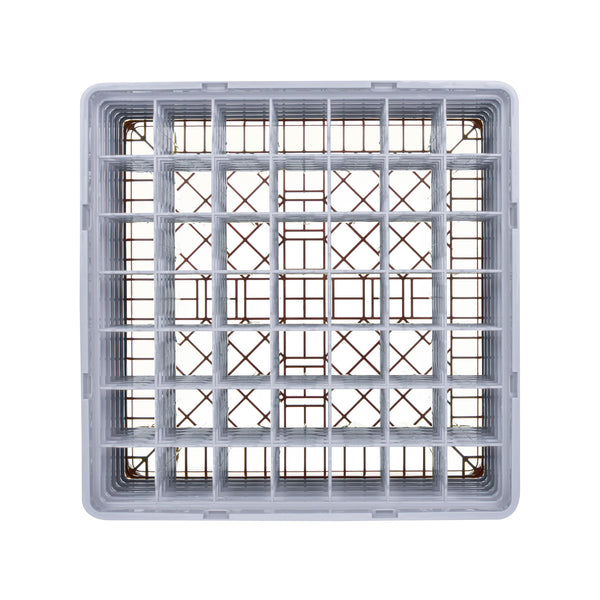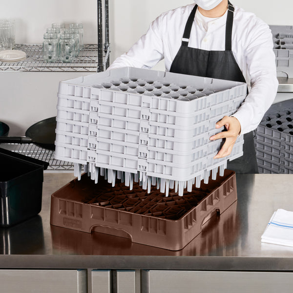 Optimize your glassware storage with our Clean Tek Professional Brown Glass Rack, designed to meet the demands of busy foodservice settings. Featuring 49 compartments, this commercial glass rack ensures each piece of glassware is securely held in place. With a 1 full drop extender, this dishwasher rack accommodate taller glassware effortlessly. The 5 half drop extenders provide flexibility, making this compartment rack highly versatile for different types of barware. Constructed from durable PP, this rack is built to withstand daily use in commercial kitchens. An easy-to-handle design makes transporting and loading this barware organizer simple and efficient. The open interior compartments facilitate thorough cleaning while allowing quick drying. Solid external walls provide additional protection during transport and storage, ensuring your glassware remains intact. Measuring 19.69 inches in length by 19.69 inches in width by 13.74 inches in height, this commercial glass rack fits seamlessly into standard dishwashers. Sold in a 1 count box.