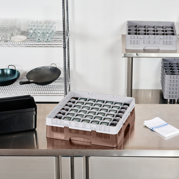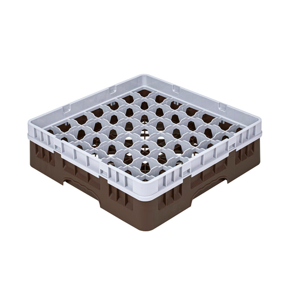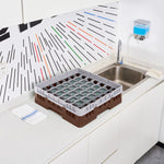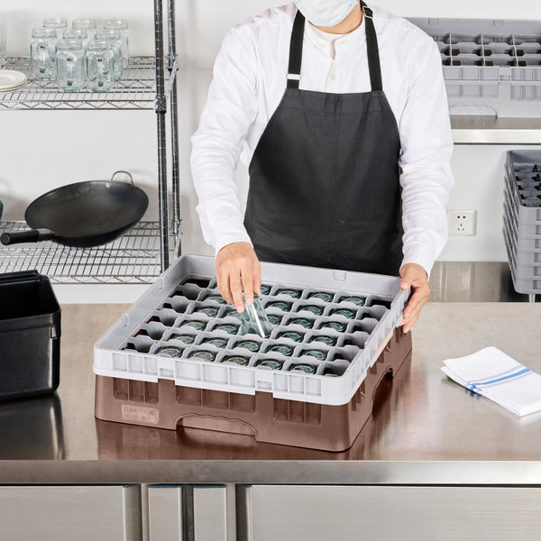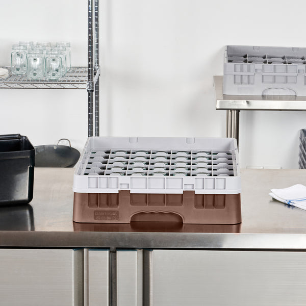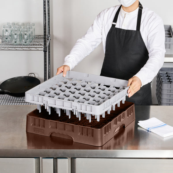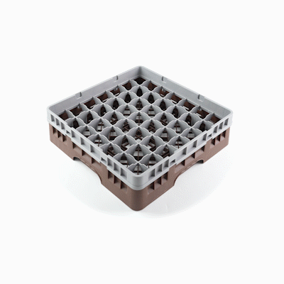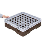 Our Clean Tek Professional Brown Glass Rack provides the ultimate solution for efficient glassware storage in busy commercial settings. Featuring 49 compartments, this dishwasher rack effortlessly accommodates large quantities of glassware, reducing breakage and ensuring safe transport. Use the 1 full drop extender to easily adjust the compartment rack height for various glass sizes, offering customization for any event or service. Constructed from durable PP, this barware organizer withstands the rigorous demands of continuous use. The open interior compartments allow for optimal air circulation during washing, enhancing cleaning efficiency. Meanwhile, the solid external walls of this commercial glass rack provide robust protection, safeguarding your glassware from potential damage. Measuring 19.69 inches in both length and width by 5.63 inches in height, this rack offers ample space while maintaining a compact, easy-to-handle design. Sold in a 1 count box.