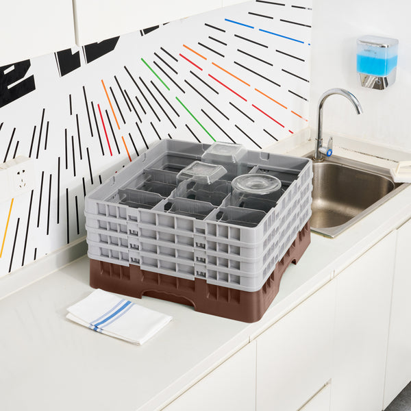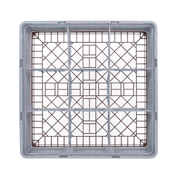 Maximize your glassware storage efficiency with our Clean Tek Professional Brown Glass Rack. Designed with 9 open interior compartments, this rack provides an organized solution for your commercial glassware needs. Featuring a durable PP construction, this dishwasher rack withstands the demands of a busy foodservice environment. The innovative full drop extender enhances the versatility of this compartment rack, allowing for secure handling and storage. With 3 half drop extenders, this barware organizer adapts to various glass sizes, ensuring secure transportation and washing. The solid external walls of this glass rack offer added protection, making this commercial glass rack ideal for any bar or restaurant setting. Measuring 19.69 inches in length by 19.69 inches in width by 10.51 inches in height, this glass rack efficiently utilizes space while maintaining accessibility. Sold in a 1 count box.