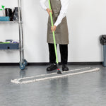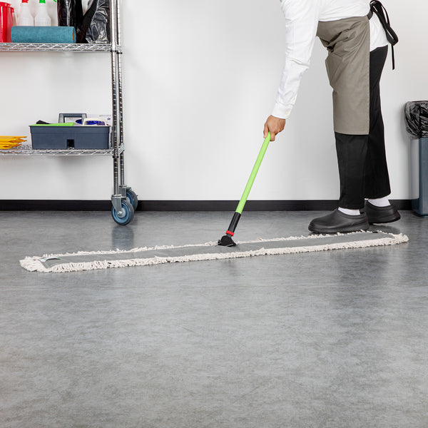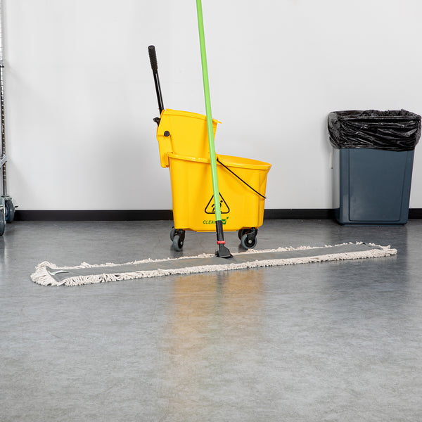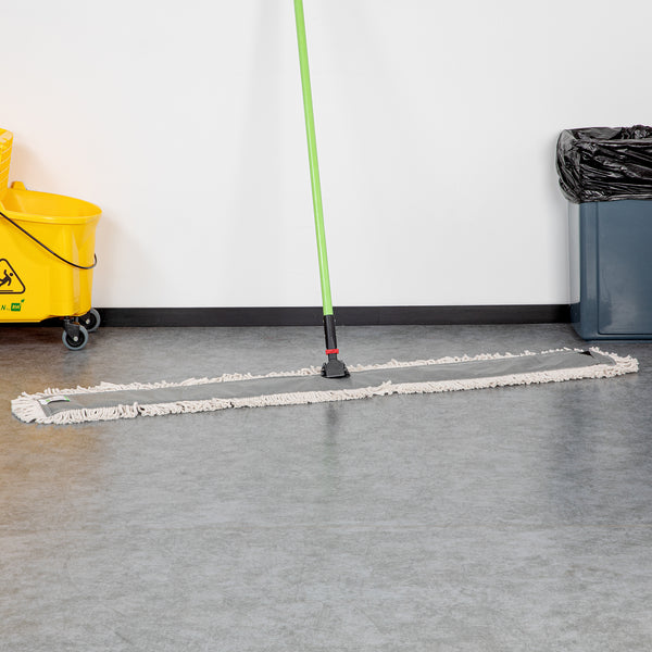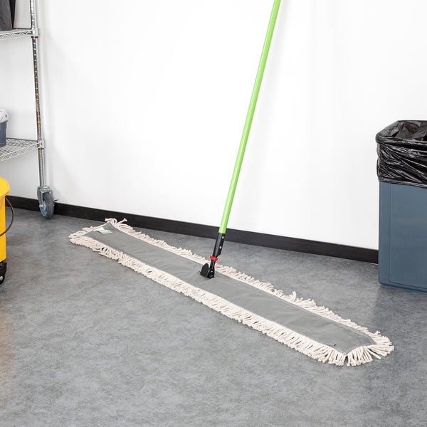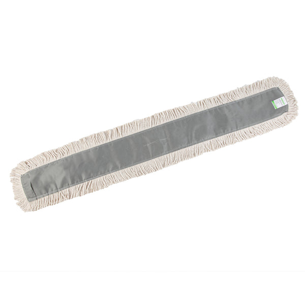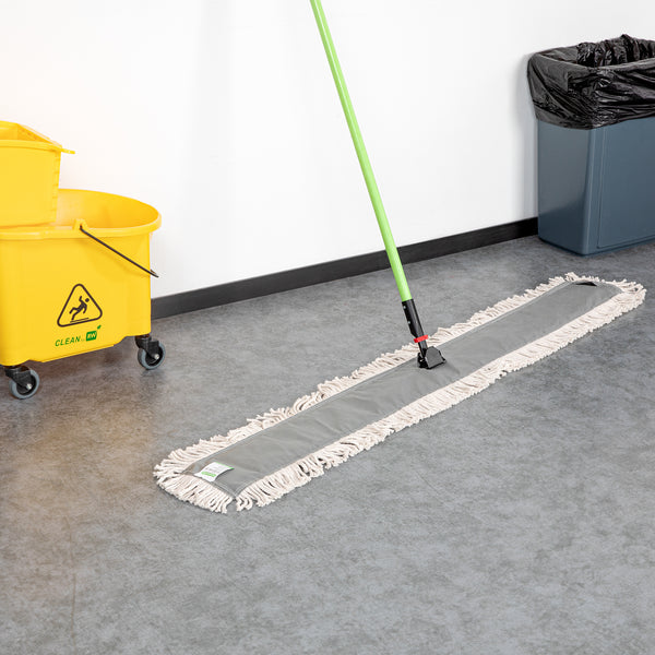 Effortlessly maintain spotless floors with our Clean Tek Professional Cotton Dry Dust Mop Head. Designed to pair seamlessly with our collection of matching Clean Tek Professional mop frames and handles, this cotton mop head ensures a comprehensive cleaning solution tailored to your needs. Crafted from premium cotton, this dry mop head expertly whisks away and retains dust and dirt, enabling you to clean your floors faster and more efficiently. With a secure attachment style, this dust mop head remains firmly in place during use, preventing any frustrating slippage. Perfect for busy foodservice environments, this wide dust mop is disposable, allowing for quick and easy disposal after each use without the hassle of washing. Measuring an impressive 59.84 inches in length by 5 inches in width, this commercial dust mop head provides extensive coverage to tackle large floor spaces with ease. Sold in a 1 count box. Mop frame and handle are available and sold separately.