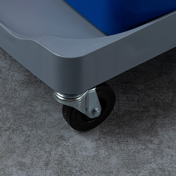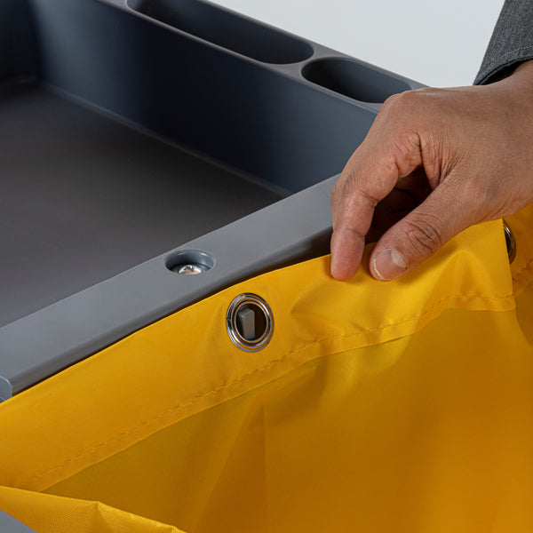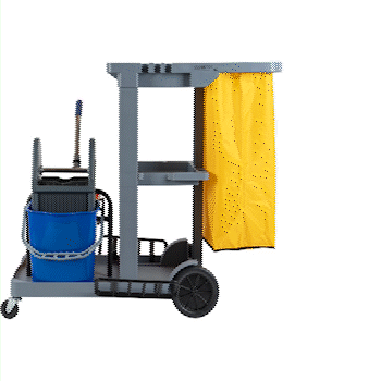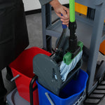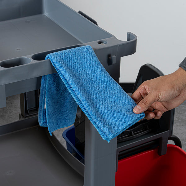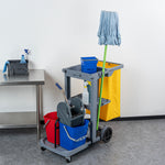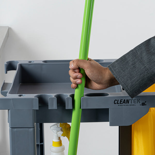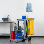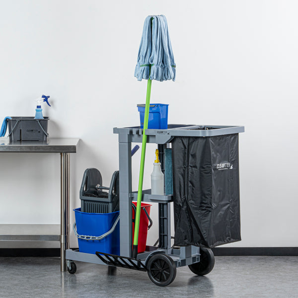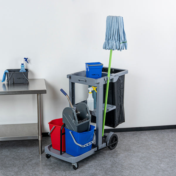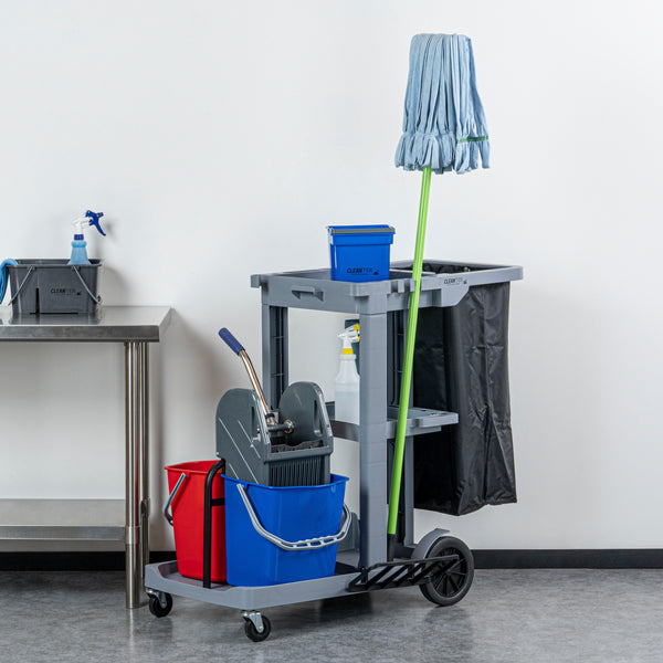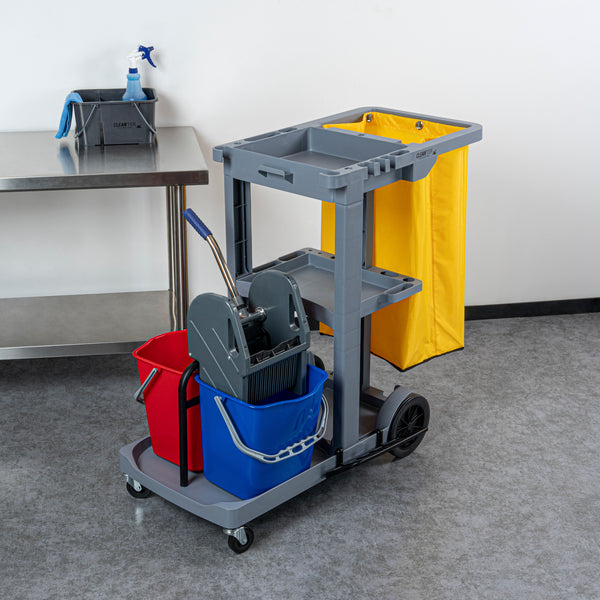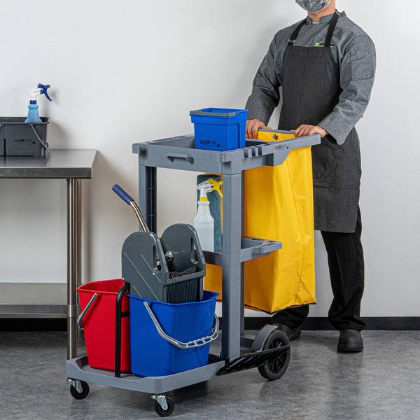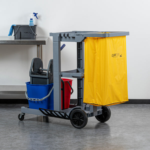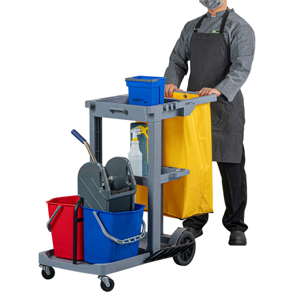 Enhance your cleaning efficiency with our Clean Tek Professional Gray 3-Shelf Janitor Cart. This cleaning cart features a rugged 18-gallon bag that provides ample space for waste or laundry collection and can be easily removed for emptying. Equipped with 2 color-coded buckets, this janitor cart allows for efficient separation of cleaning solutions, making it easy to manage different tasks while reducing the risk of cross-contamination. The included wringer of this cleaning trolley has a press-down style handle and effectively removes excess water from mop heads, enhancing cleaning efficiency and reducing drying time. Each bucket in this gray janitor cart holds up to 4 quarts, providing ample capacity for various cleaning tasks and efficient liquid management. Featuring 3 sturdy shelves, this cleaning cart on wheels offers ample storage space for cleaning supplies and equipment, ensuring organization in all your tasks. The mop and broom holder of this heavy-duty janitor cart keep your cleaning tools securely in place, providing easy access and organization while you work. This 3-shelf janitor cart is equipped with 4 non-marking casters and provides additional mobility without damaging your hard floors. The retaining lip of this janitor cleaning cart ensures your items stay securely in place. Measuring 44.09 inches in length by 27.95 inches in width by 37.8 inches in height, this janitor cart with wheels offers extensive capacity and dimensions suitable for any cleaning task. Sold in a box with 1 janitor cart, 1 bag, 1 winger, and 2 buckets.